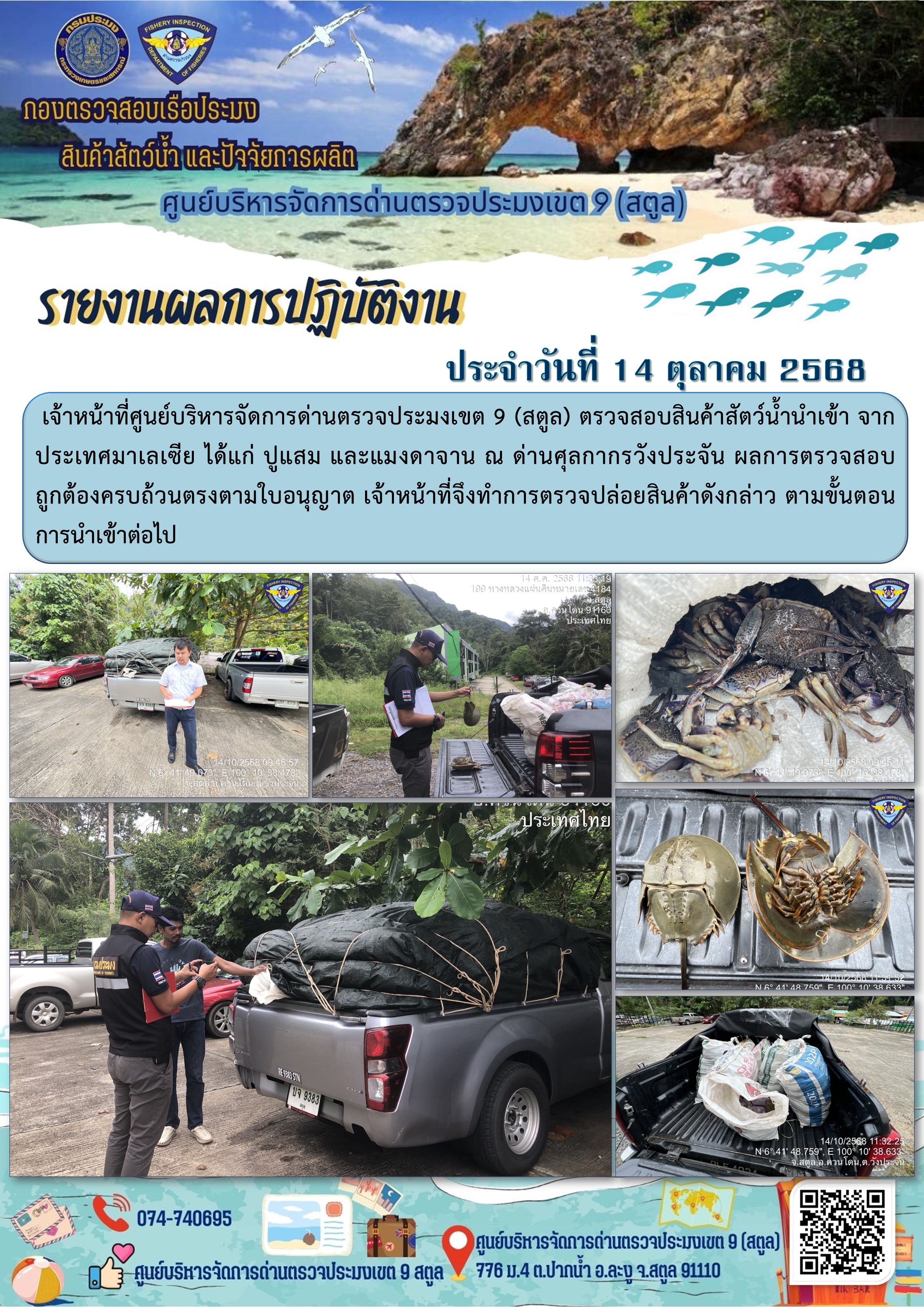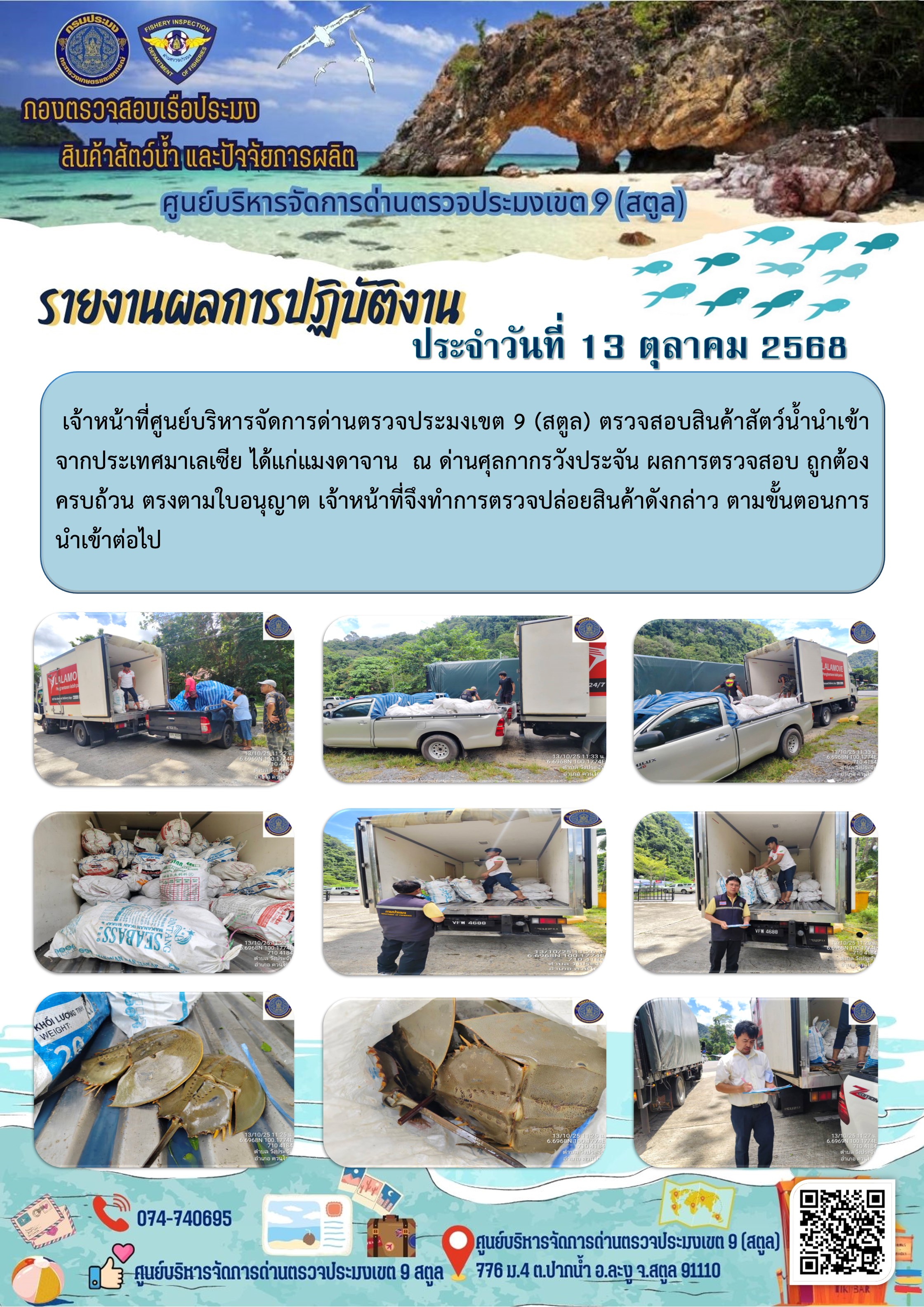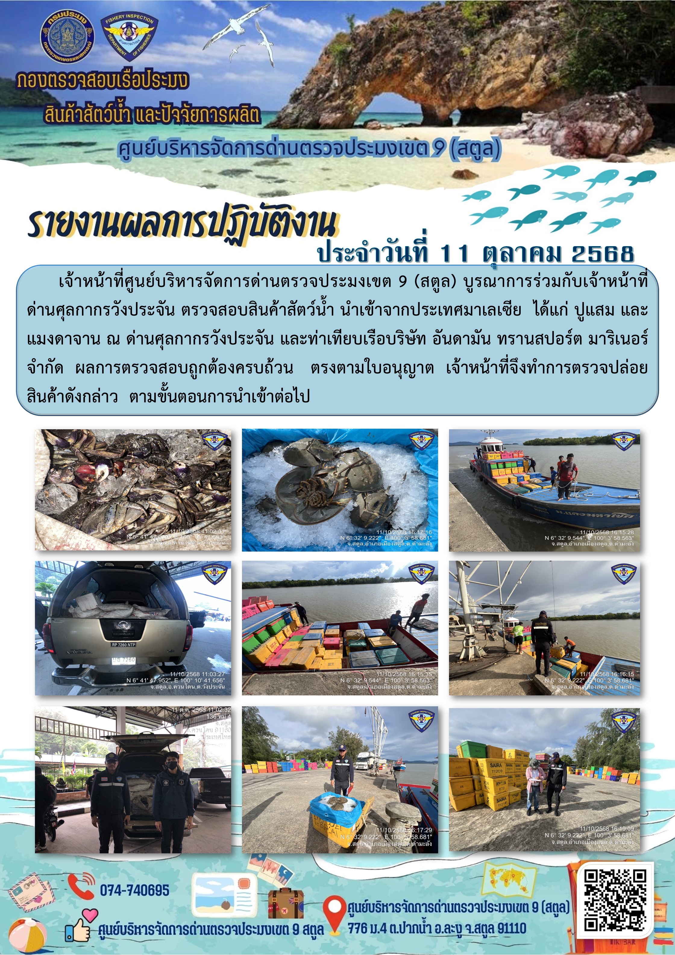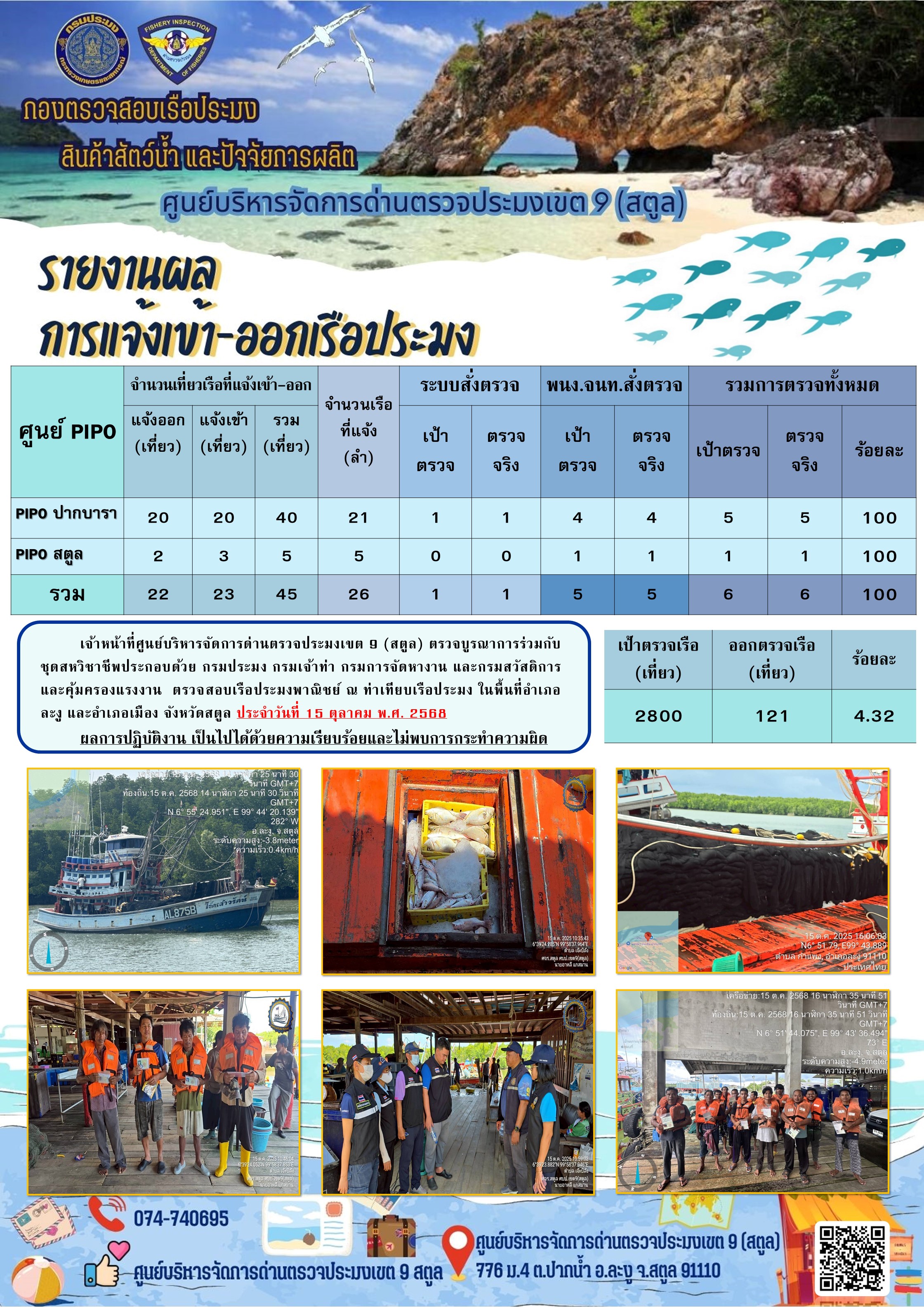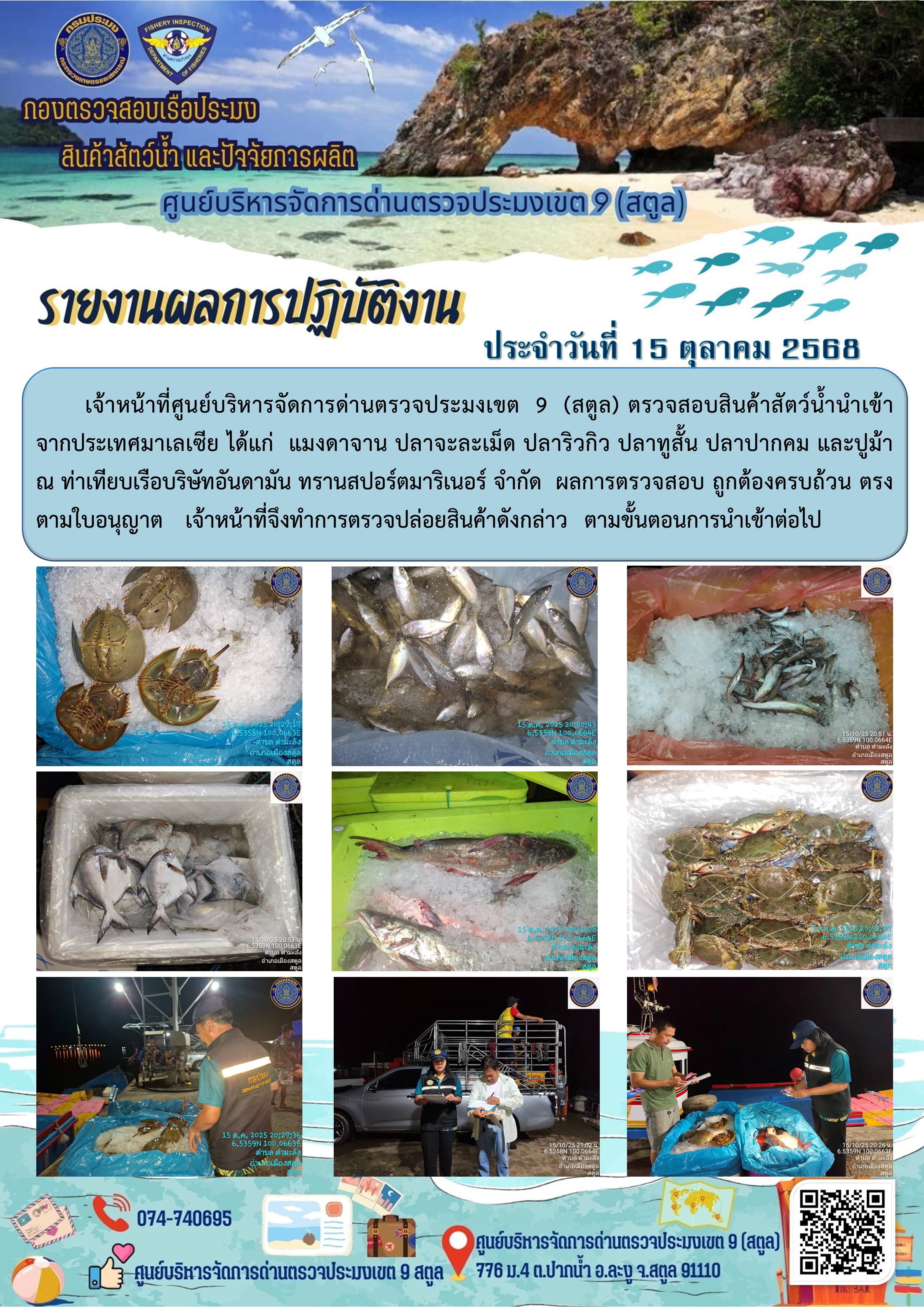 NEW ประชาสัมพันธ์การปฏิบัติงานศูนย์บริหารจัดการด่านตรวจประมงเขต 9 (สตูล) ประจำวันที่ 11 - 15 ตุลาคม 2568..คลิก