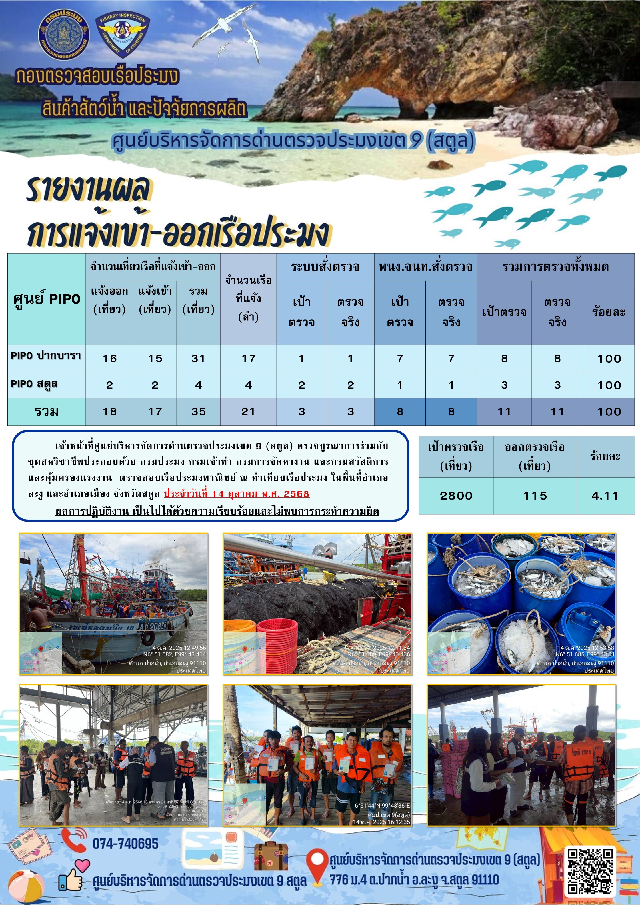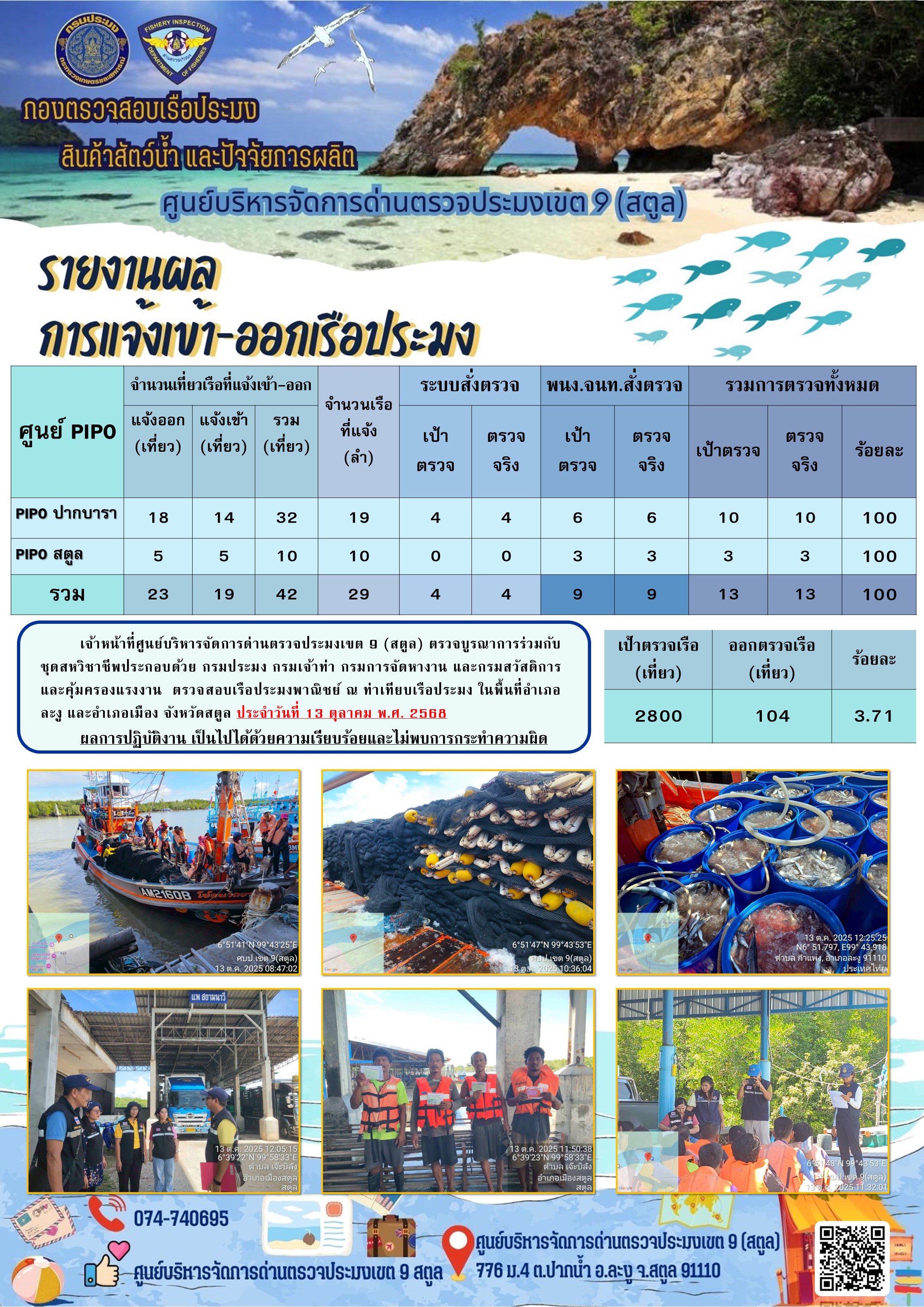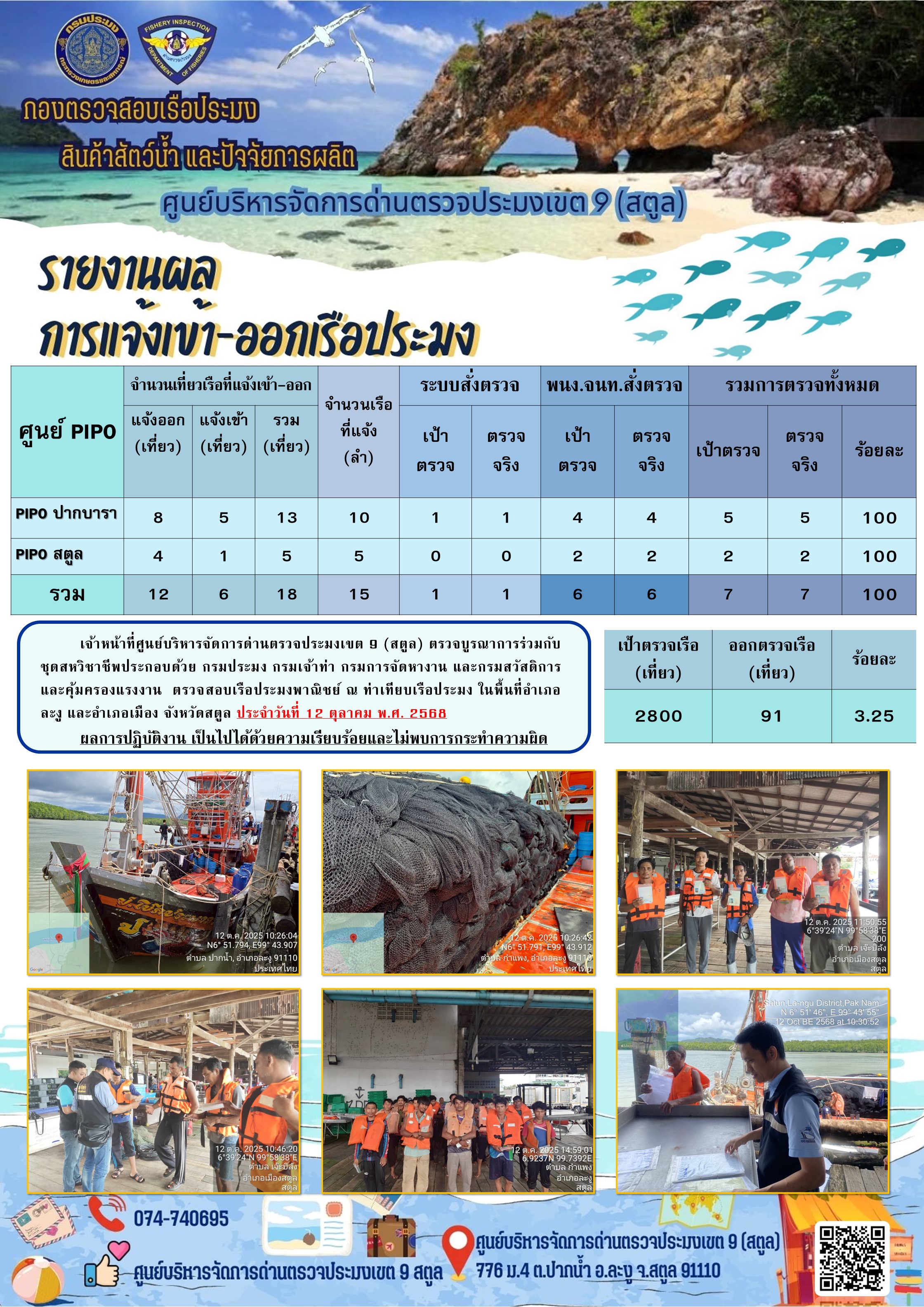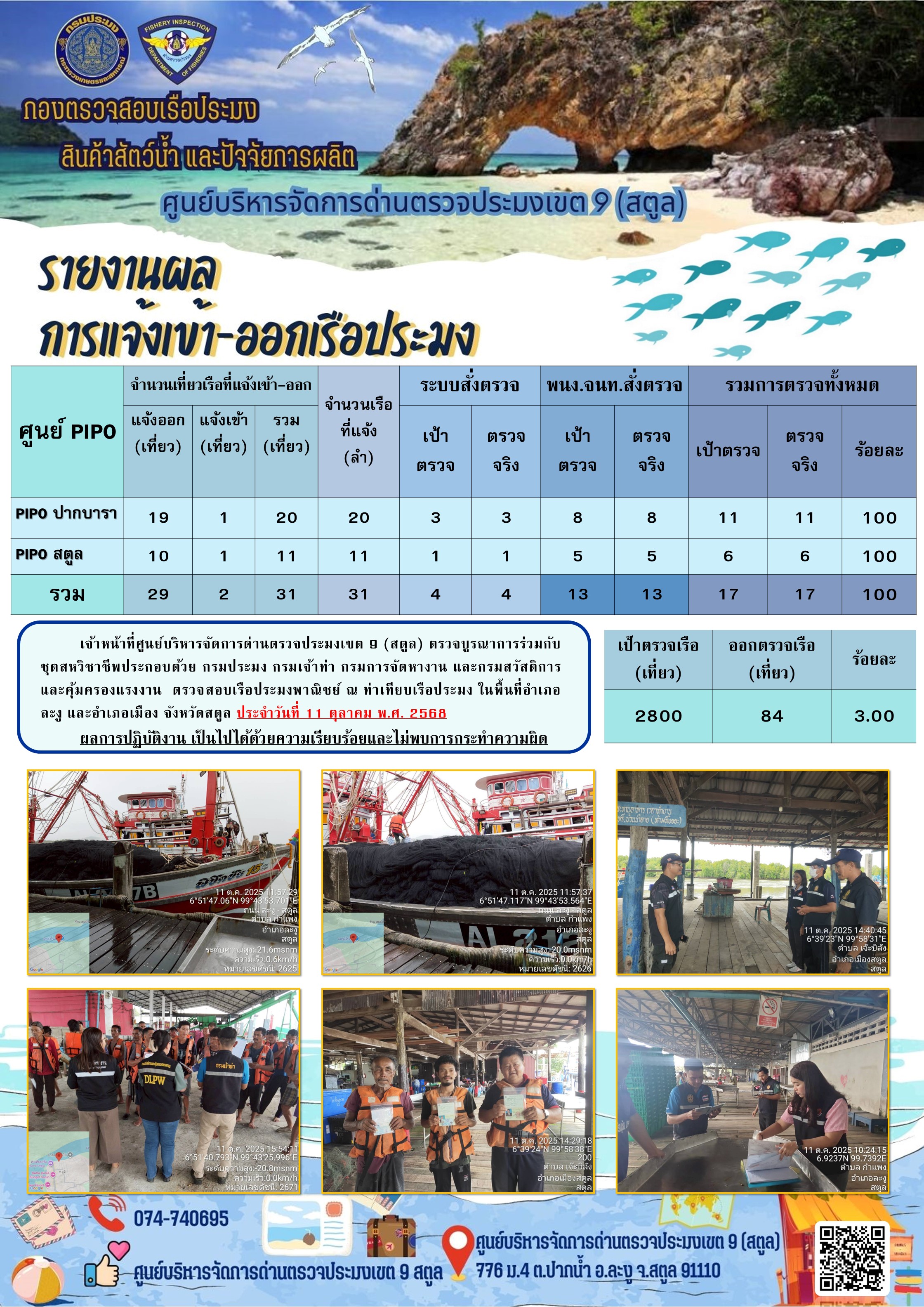 ประชาสัมพันธ์การปฏิบัติงานศูนย์บริหารจัดการด่านตรวจประมงเขต 9 (สตูล) ประจำวันที่ 11 - 15 ตุลาคม 2568