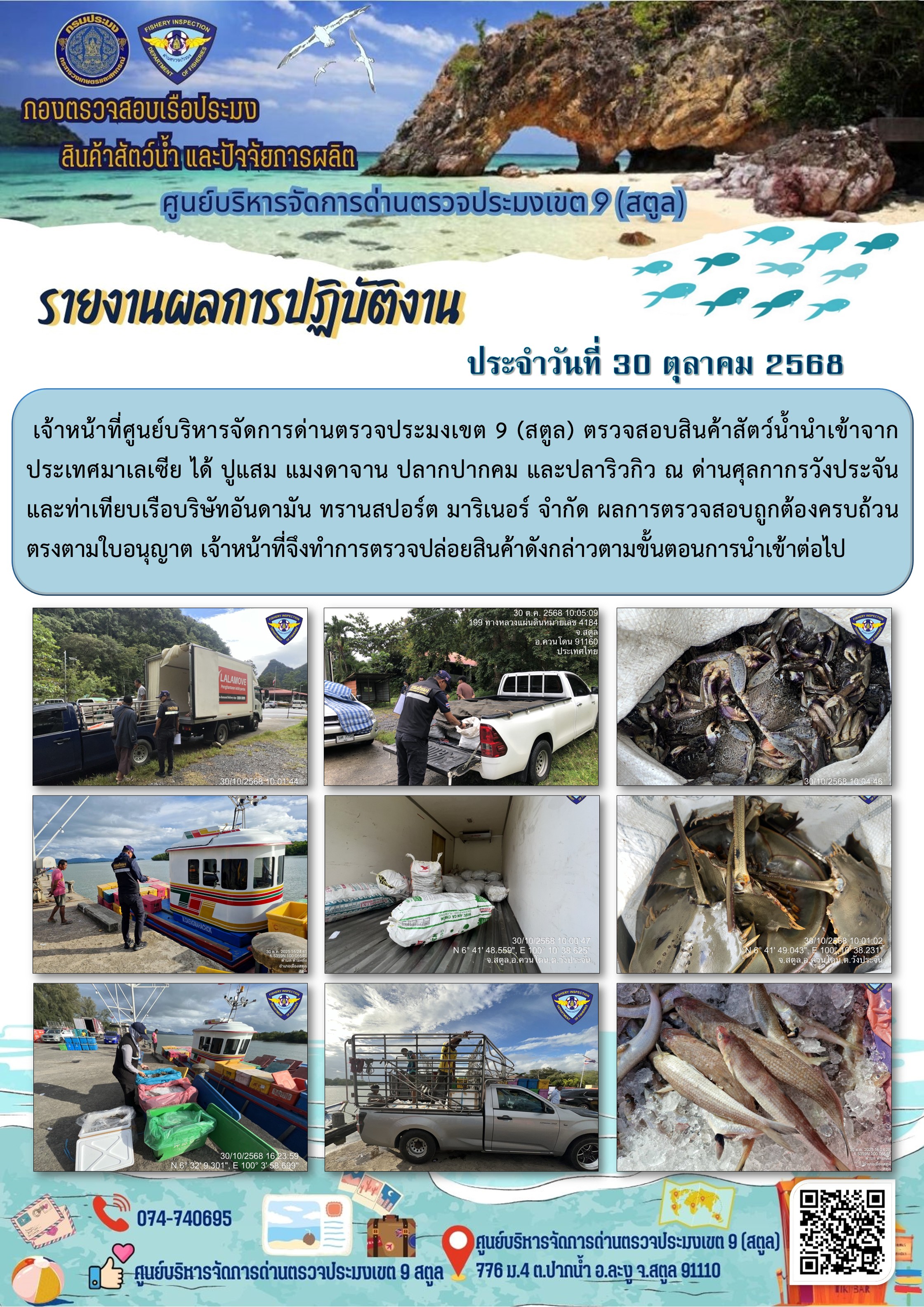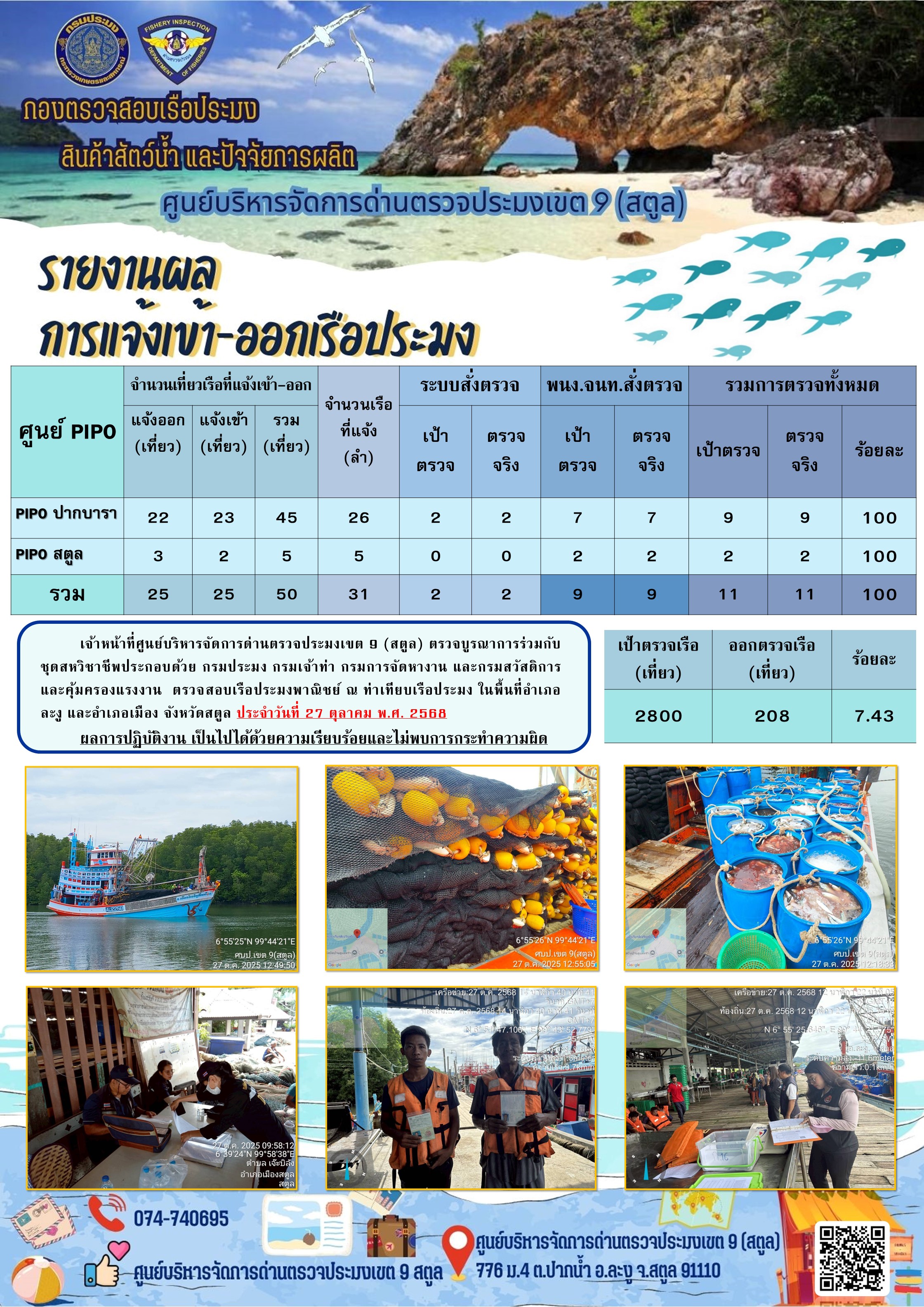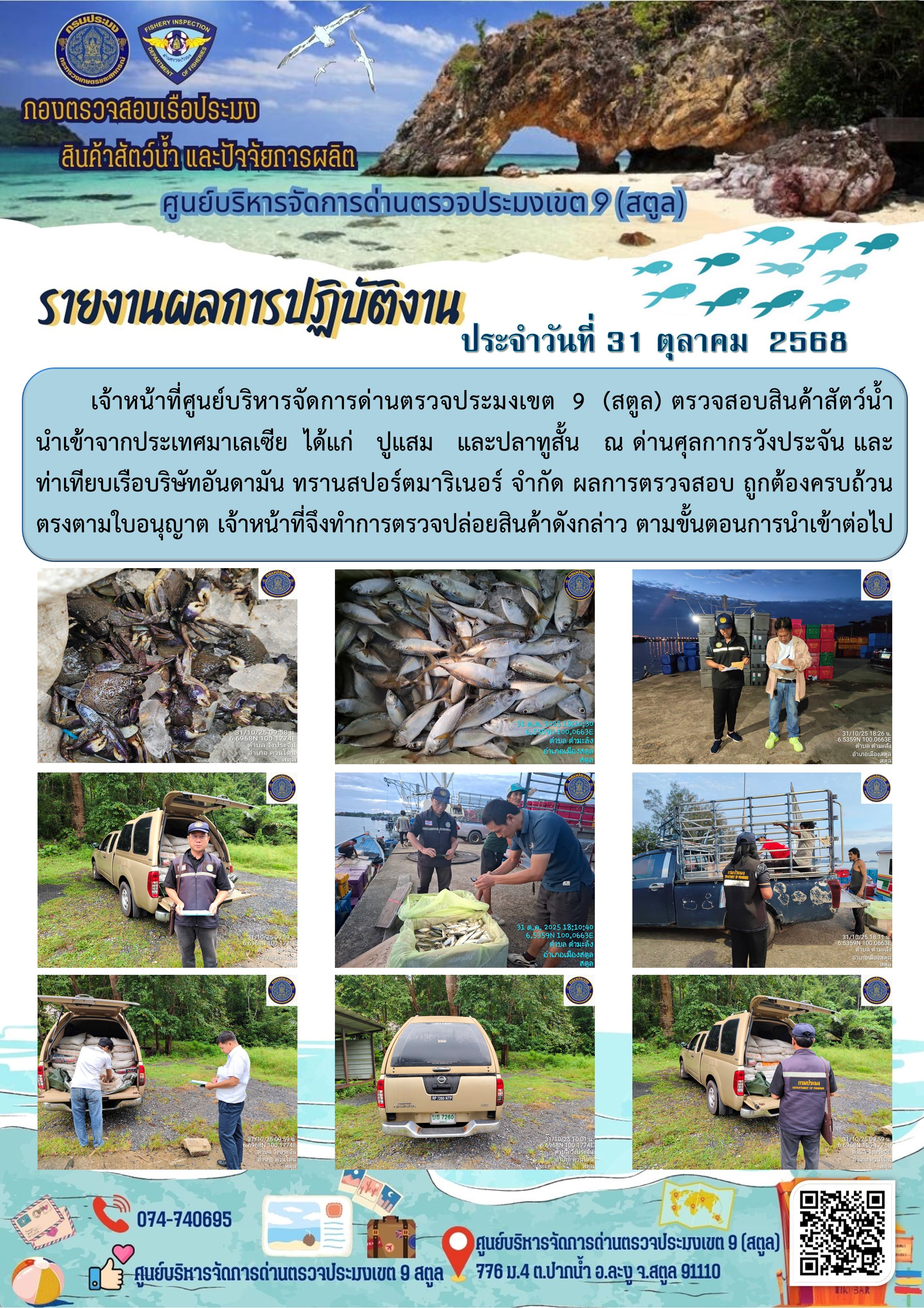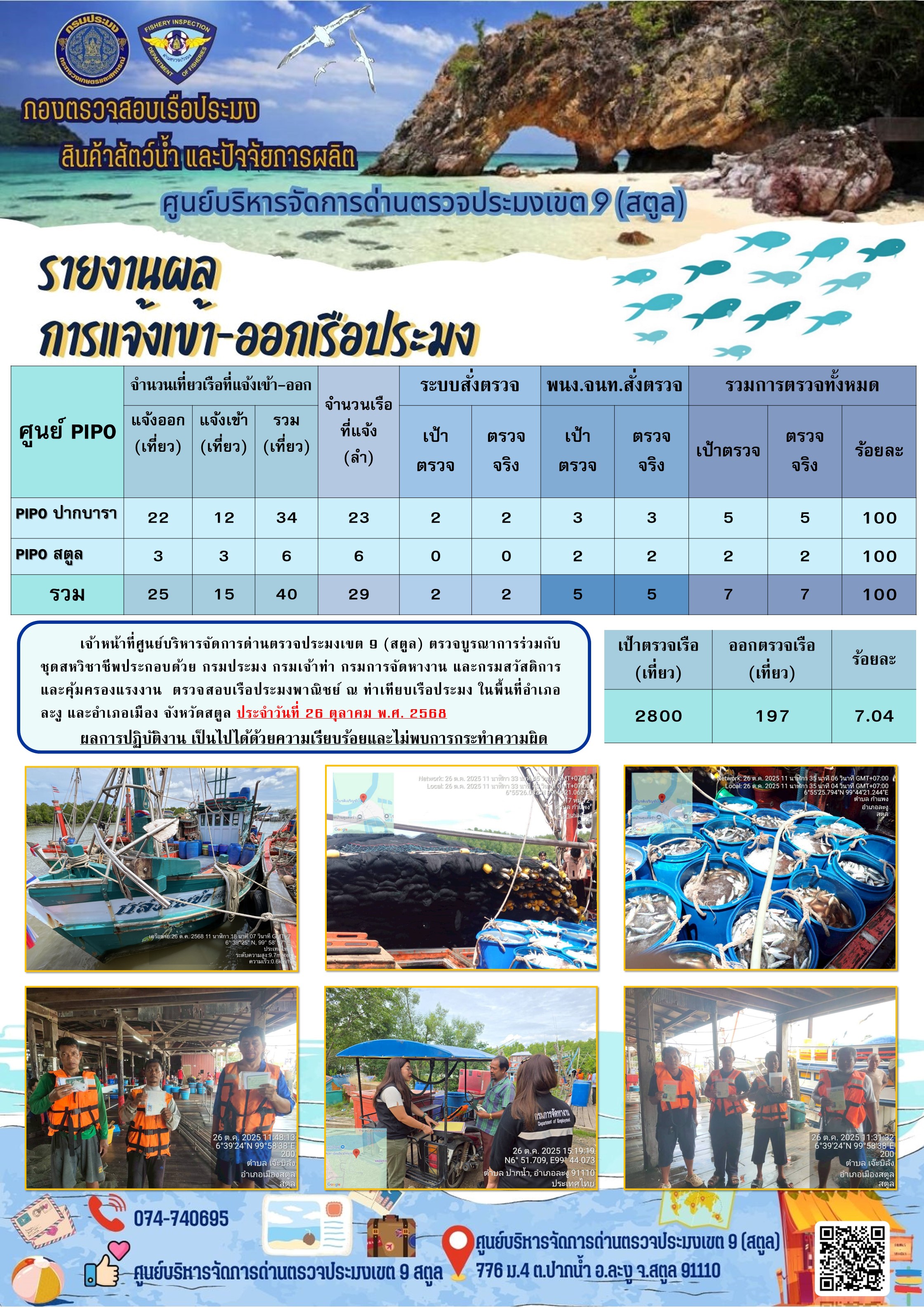 NEW ประชาสัมพันธ์การปฏิบัติงานศูนย์บริหารจัดการด่านตรวจประมงเขต 9 (สตูล) ประจำวันที่ 26 - 31 ตุลาคม 2568..คลิก