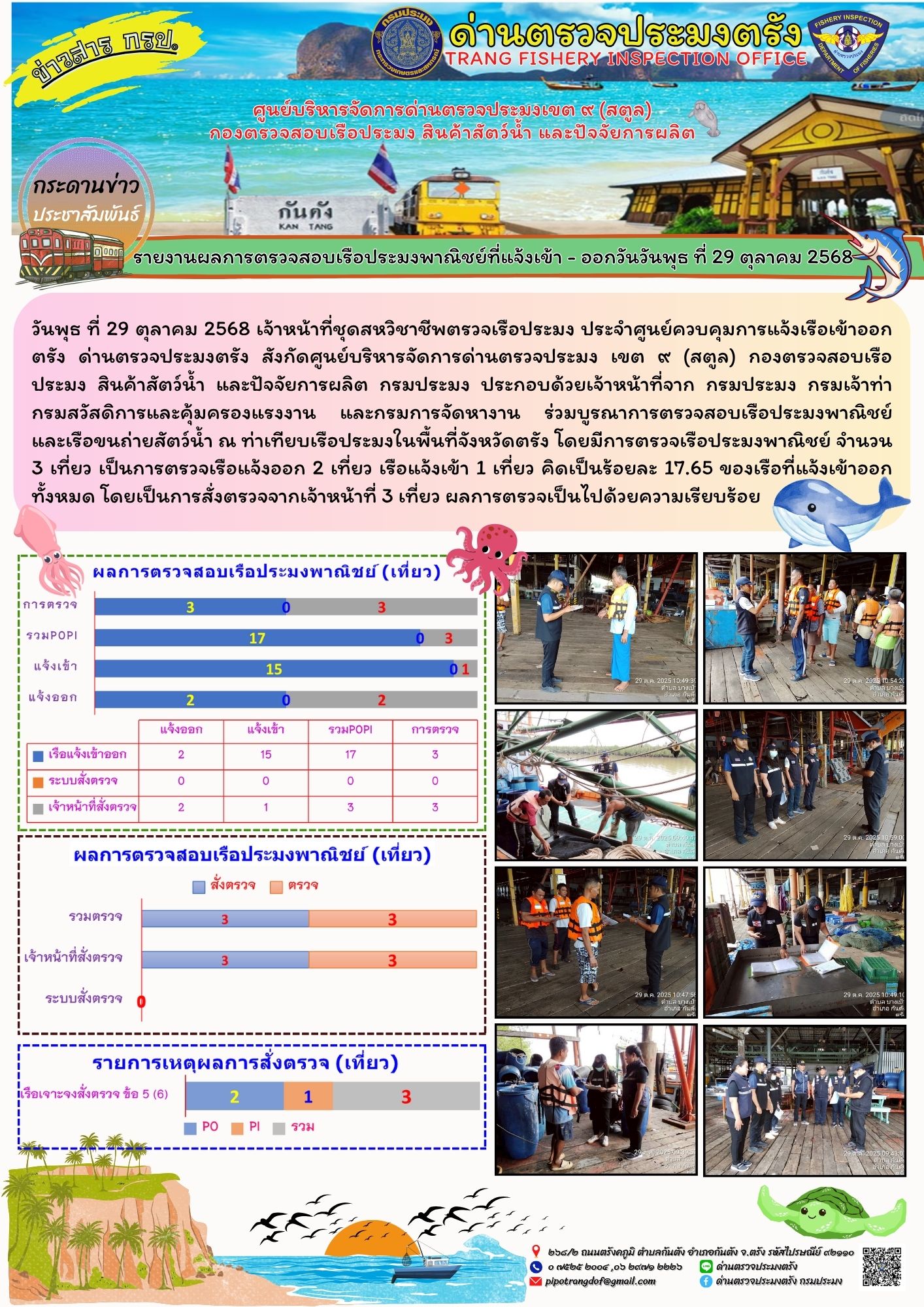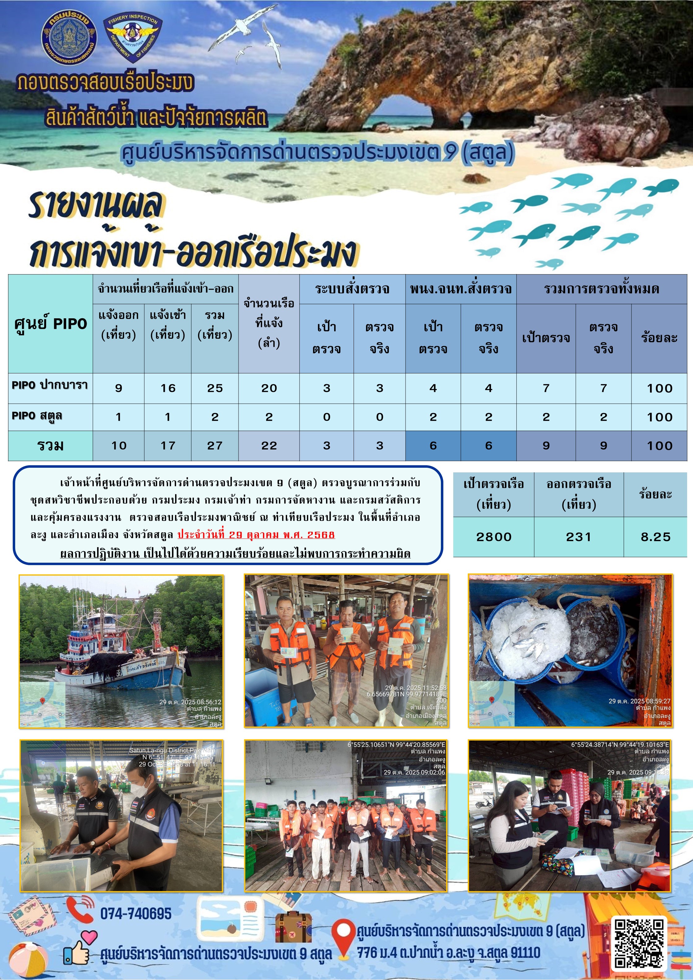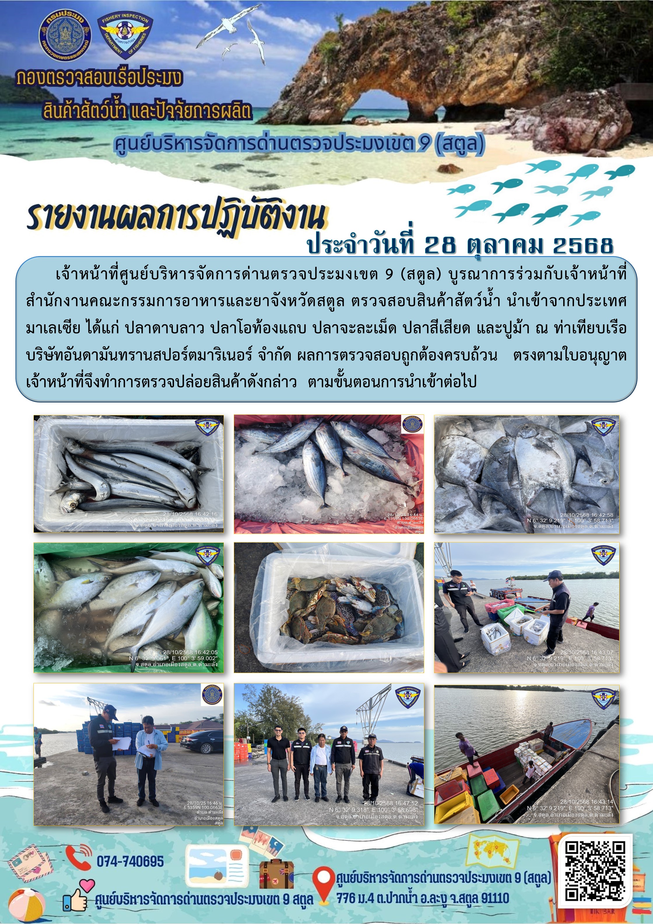 ประชาสัมพันธ์การปฏิบัติงานศูนย์บริหารจัดการด่านตรวจประมงเขต 9 (สตูล) ประจำวันที่ 26 - 31 ตุลาคม 2568
