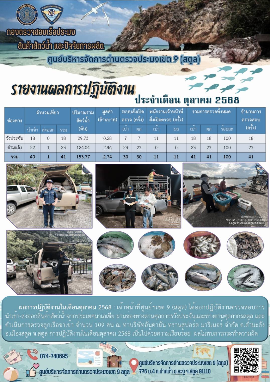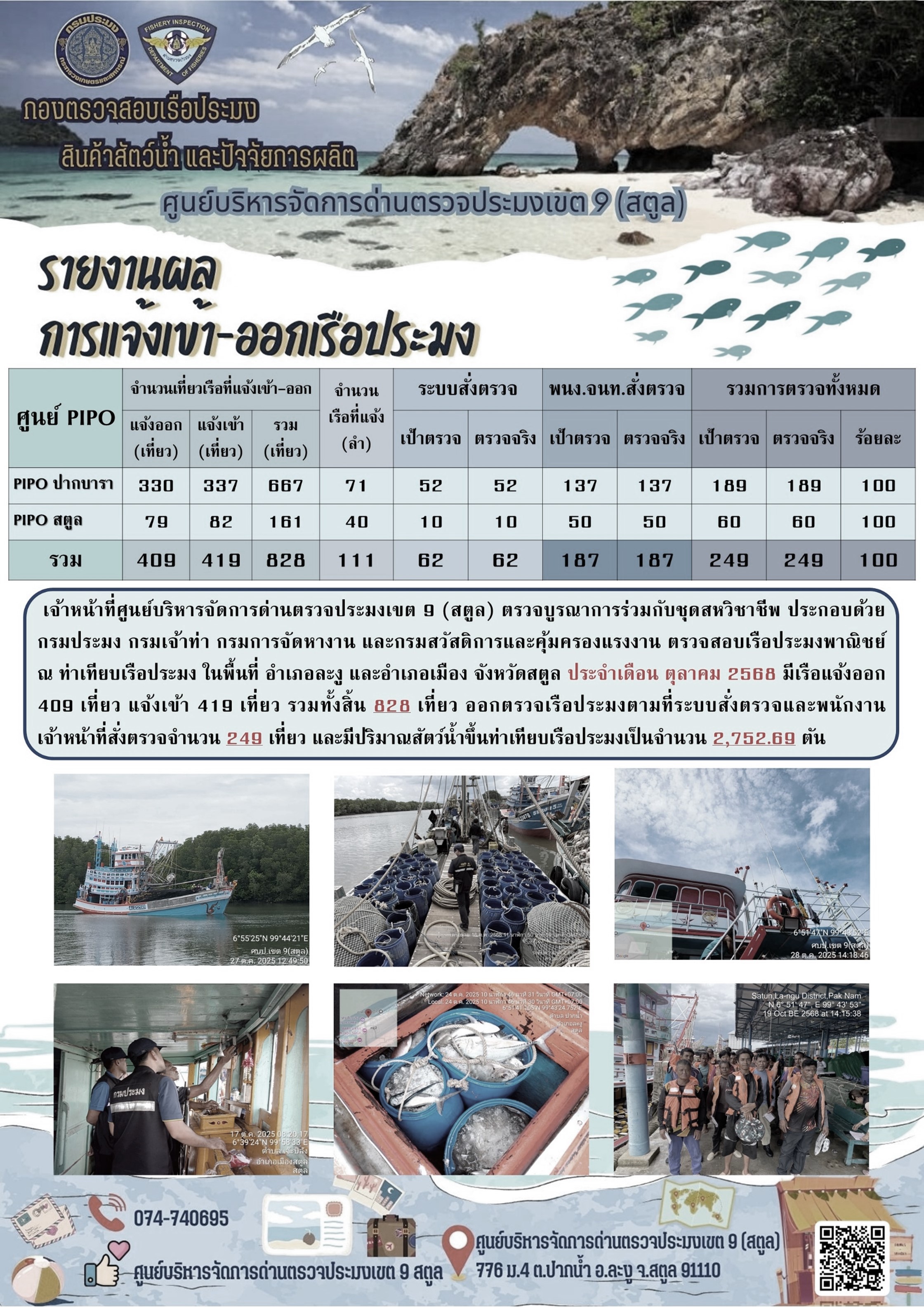 ผลการปฏิบัติงาน การตรวจสอบเรือประมงไทยที่แจ้งเข้าออก และการตรวจสอบการนำเข้า-ส่งออกสินค้าสัตว์น้ำ ในเขตพื้นที่รับผิดชอบของศูนย์บริหารจัดการด่านตรวจประมงเขต 9 (สตูล) ประจำเดือน ตุลาคม 2568