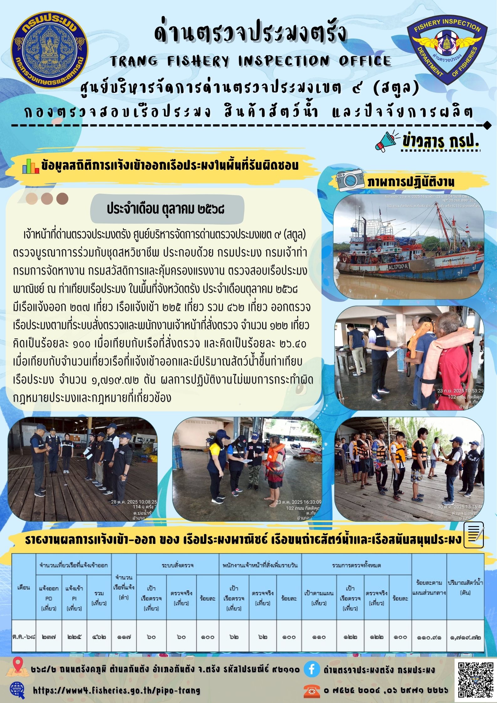 NEW ผลการปฏิบัติงาน การตรวจสอบเรือประมงไทยที่แจ้งเข้าออก และการตรวจสอบการนำเข้า-ส่งออกสินค้าสัตว์น้ำ ในเขตพื้นที่รับผิดชอบของศูนย์บริหารจัดการด่านตรวจประมงเขต 9 (สตูล) ประจำเดือน ตุลาคม 2568..คลิก