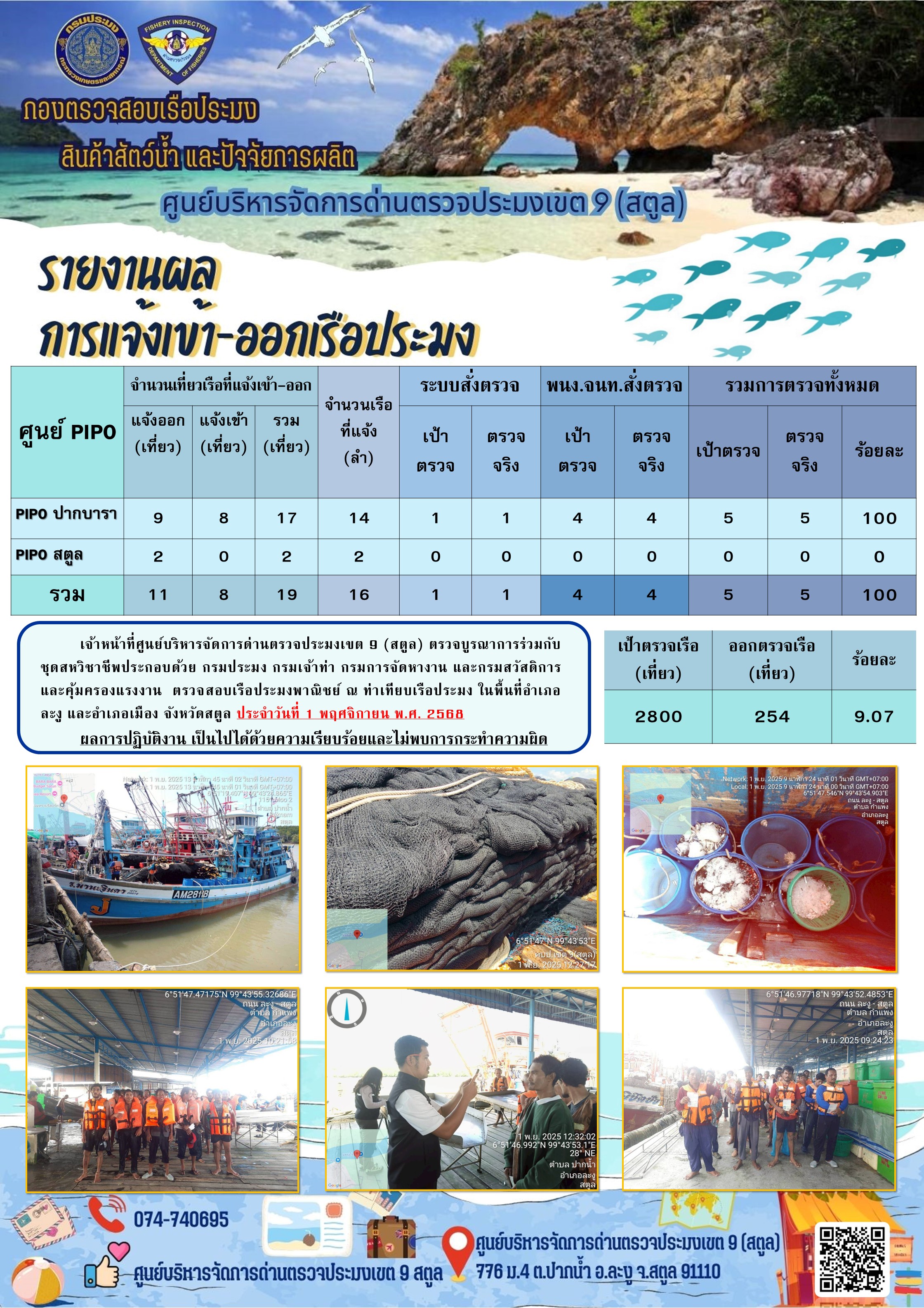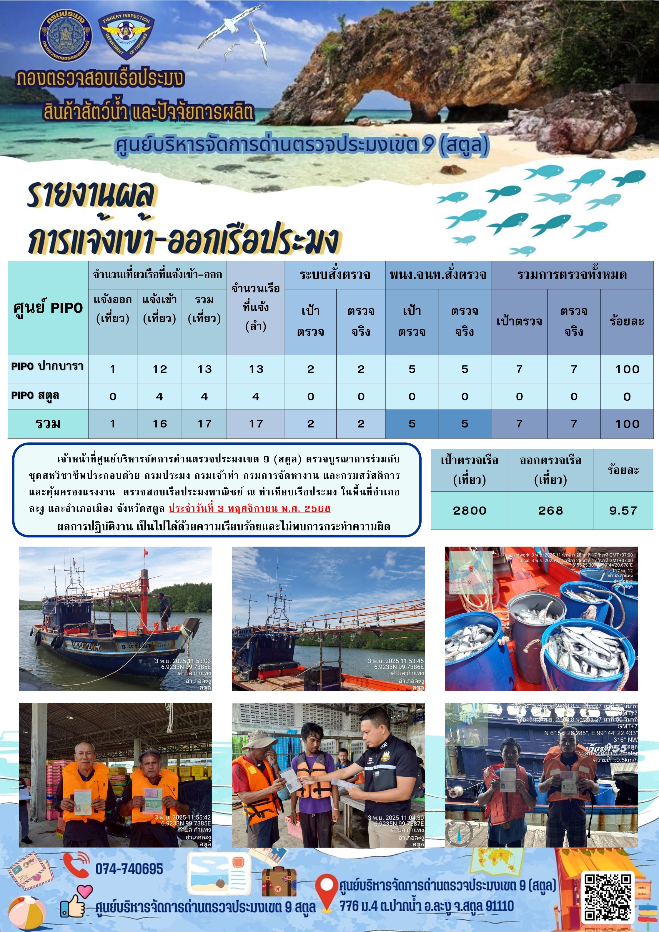 ประชาสัมพันธ์การปฏิบัติงานศูนย์บริหารจัดการด่านตรวจประมงเขต 9 (สตูล) ประจำวันที่ 1-5 พฤศจิกายน 2568