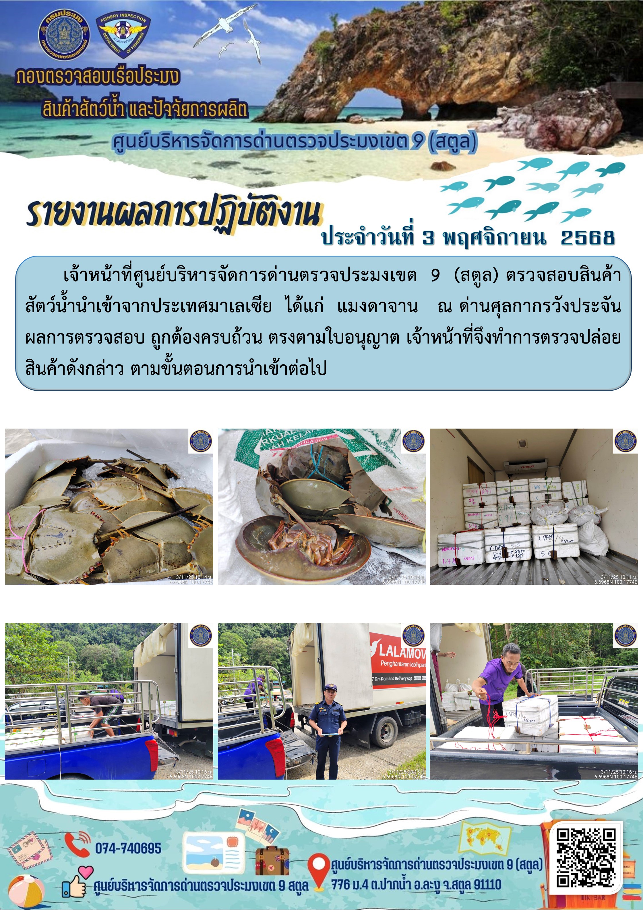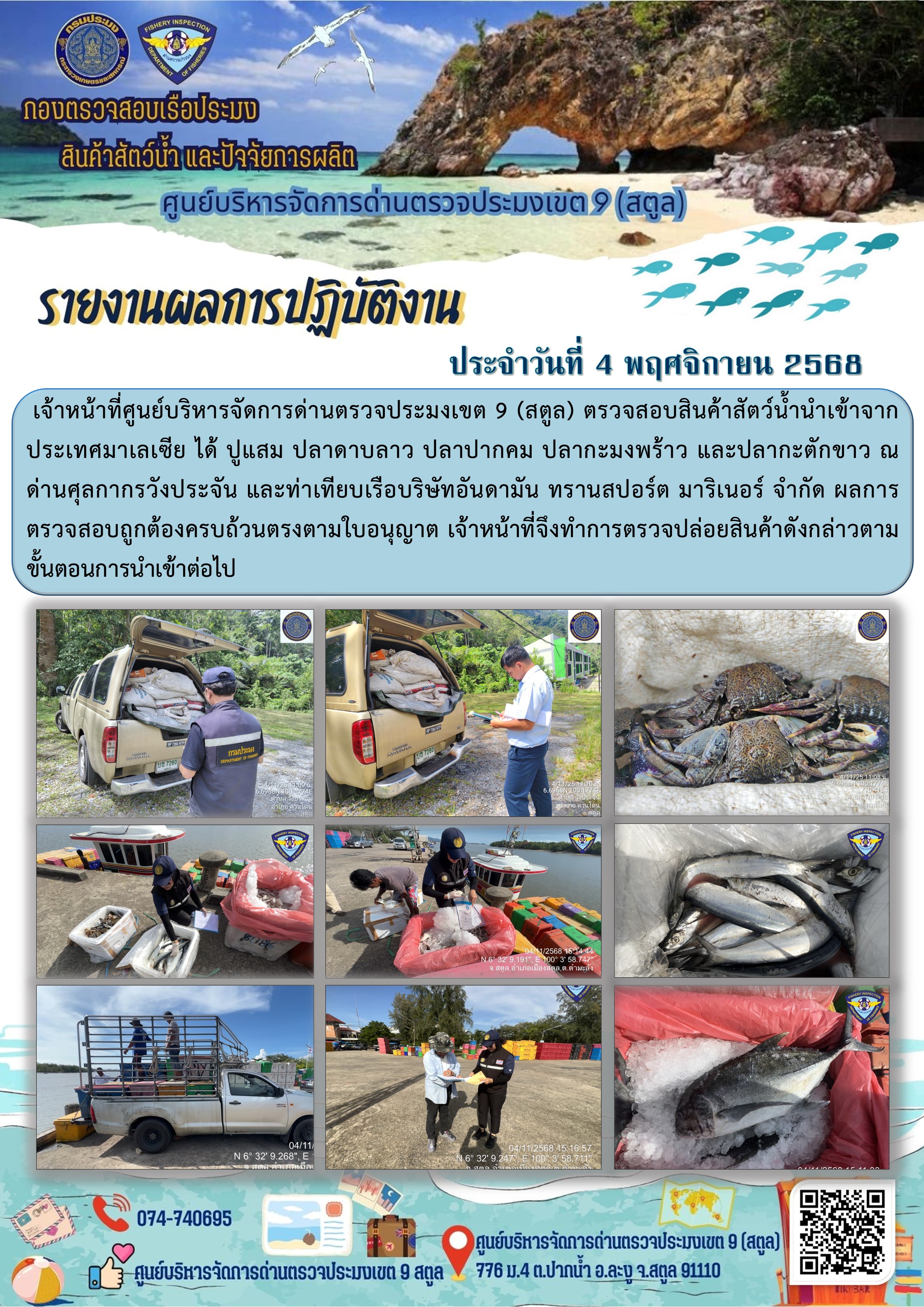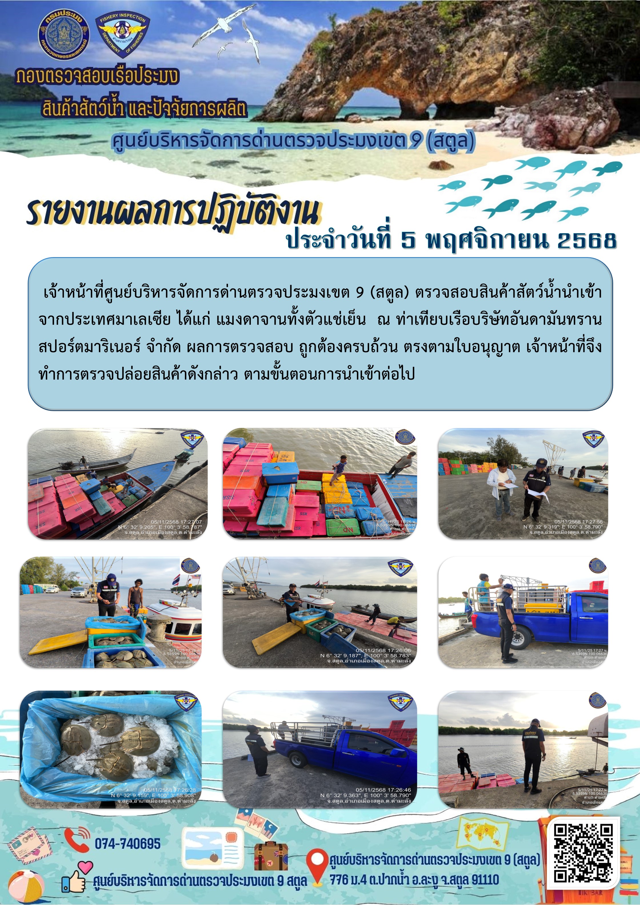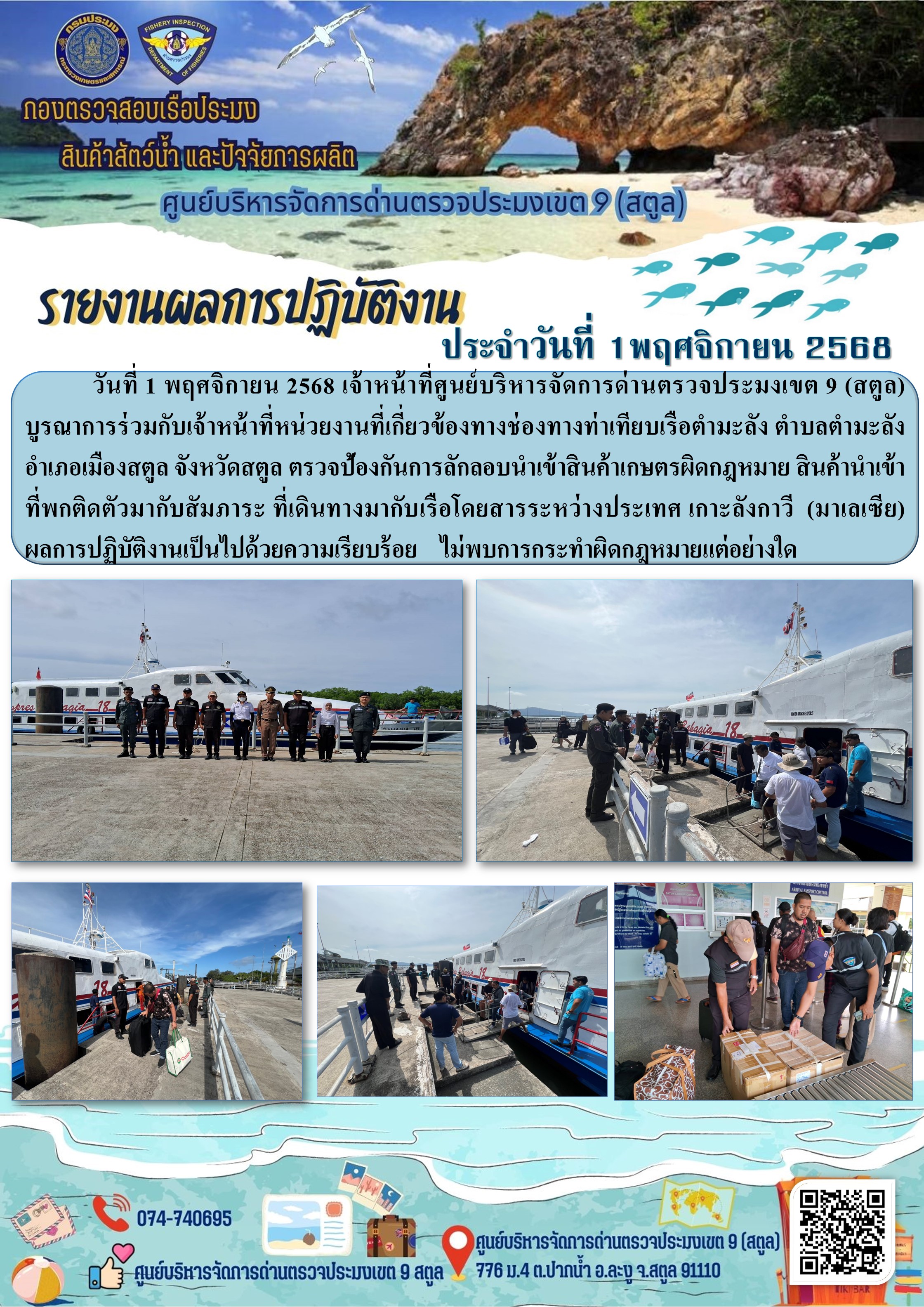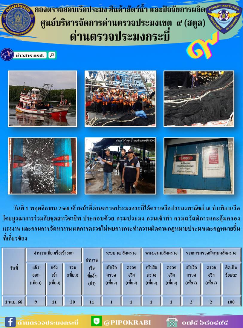 NEW ประชาสัมพันธ์การปฏิบัติงานศูนย์บริหารจัดการด่านตรวจประมงเขต 9 (สตูล) ประจำวันที่ 1-5 พฤศจิกายน 2568..คลิก