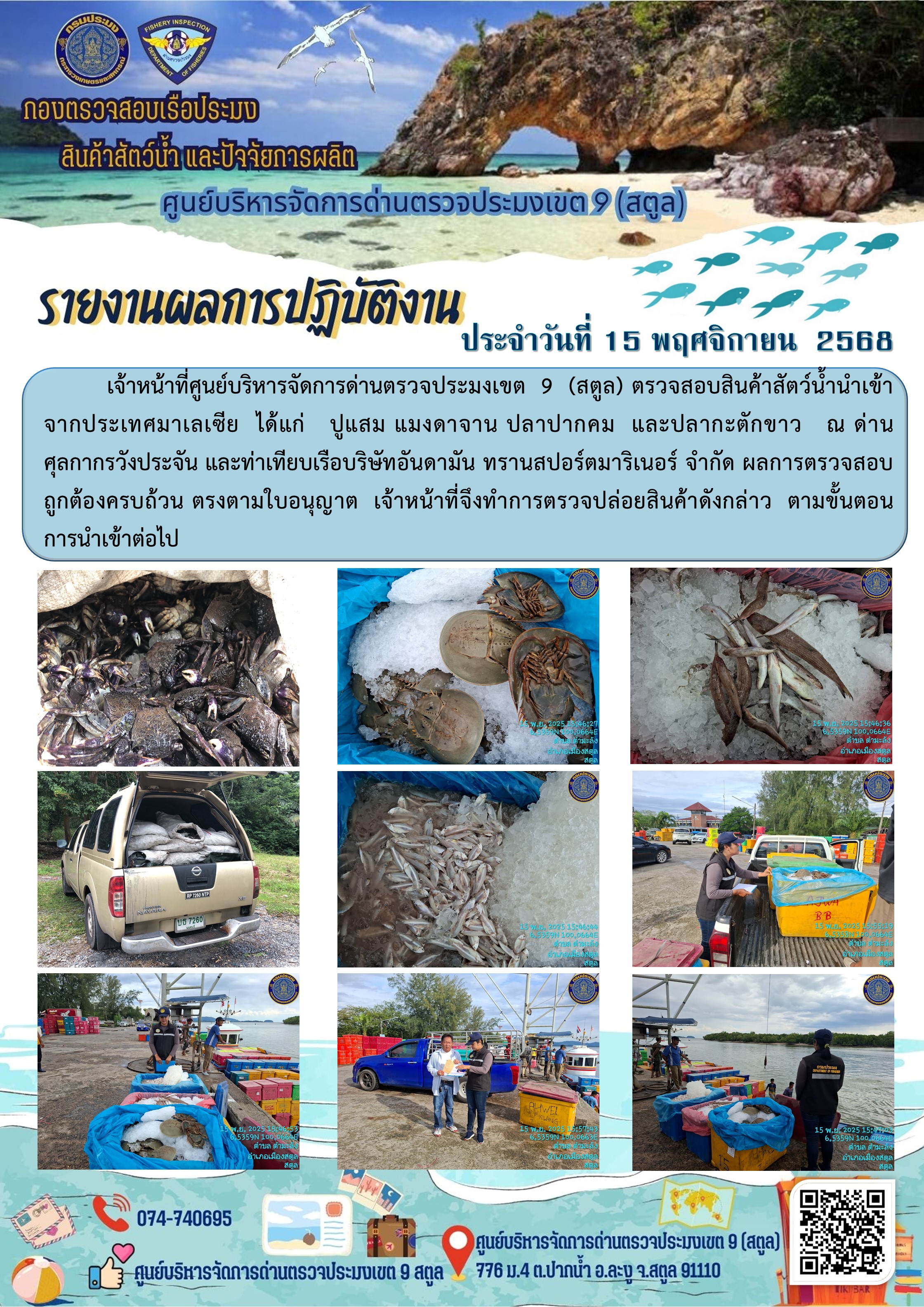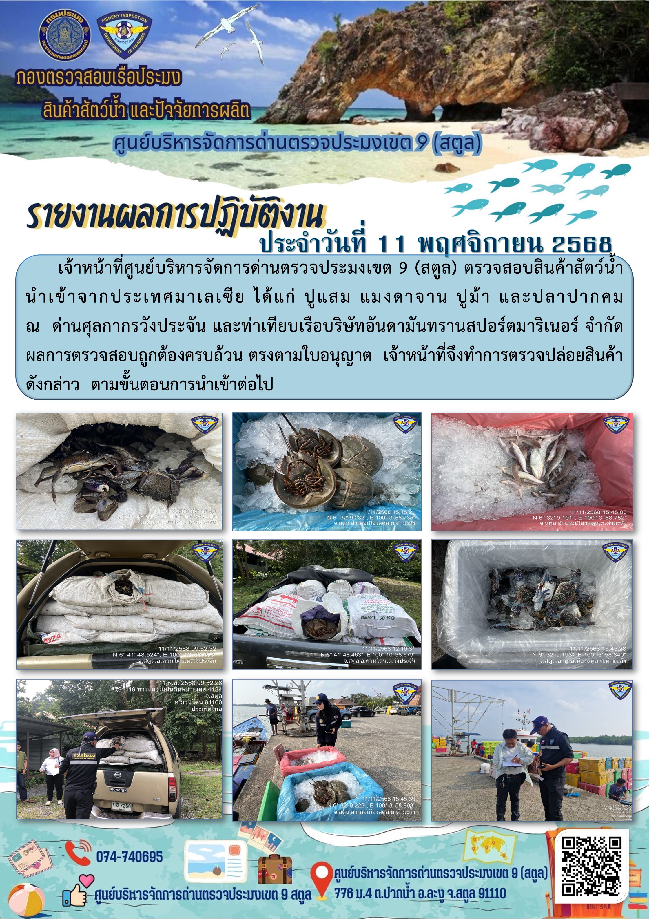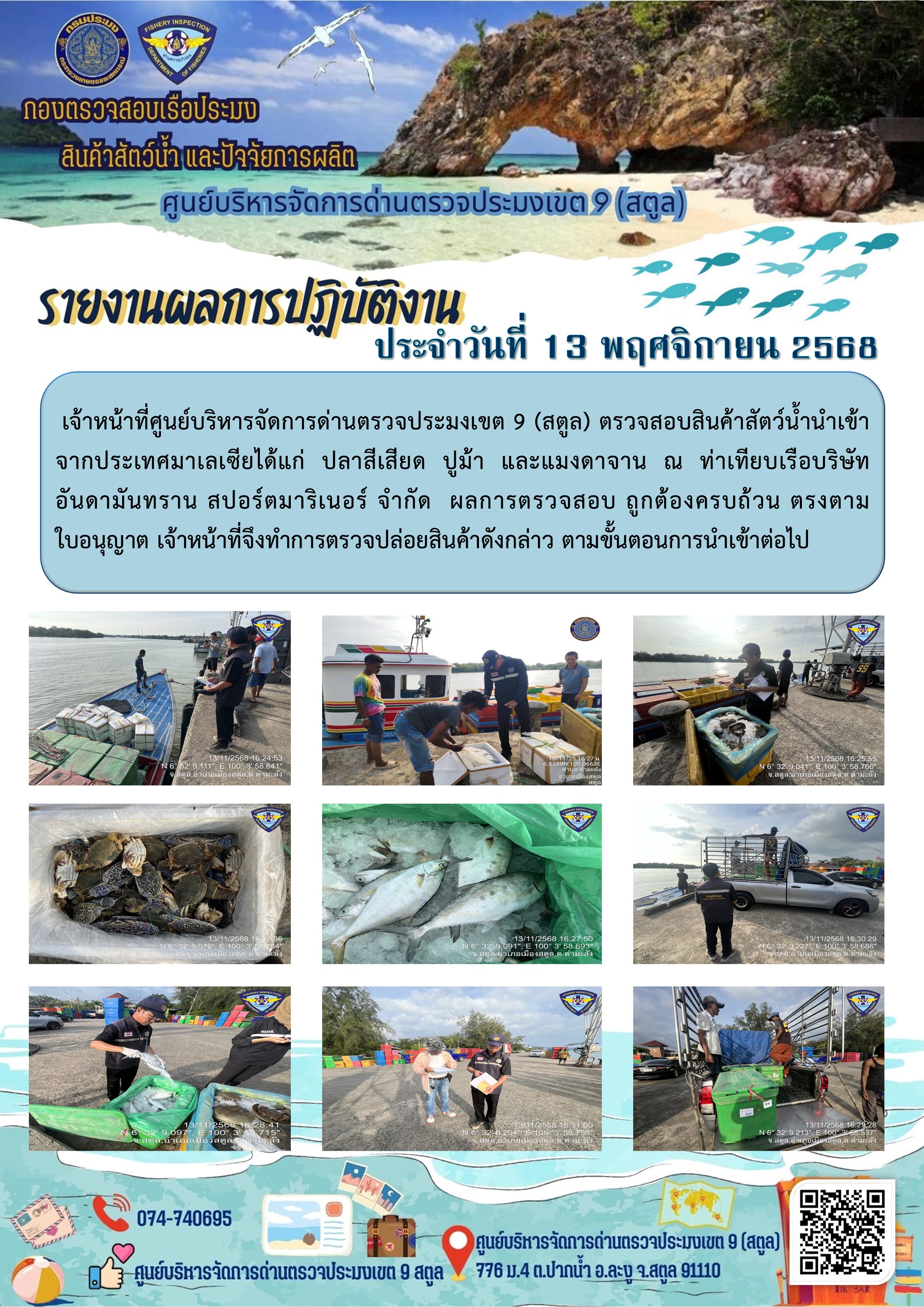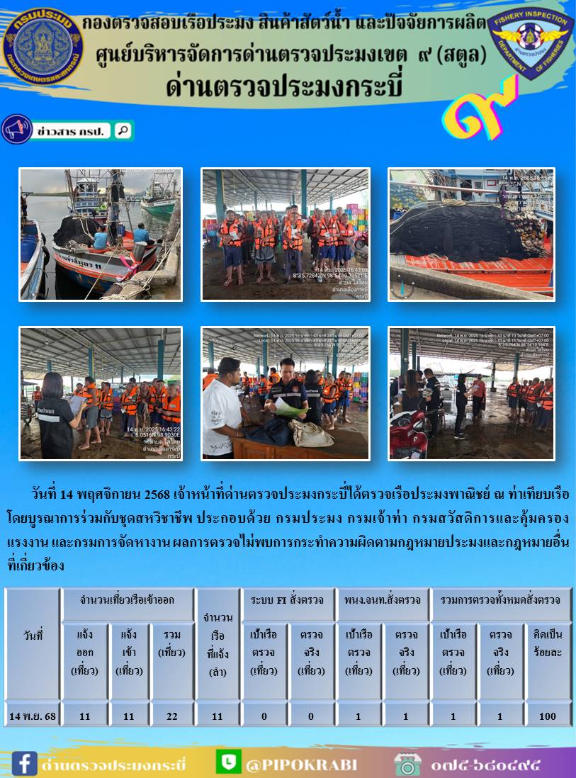 NEW ประชาสัมพันธ์การปฏิบัติงานศูนย์บริหารจัดการด่านตรวจประมงเขต 9 (สตูล) ประจำวันที่ 11-15 พฤศจิกายน 2568..คลิก
