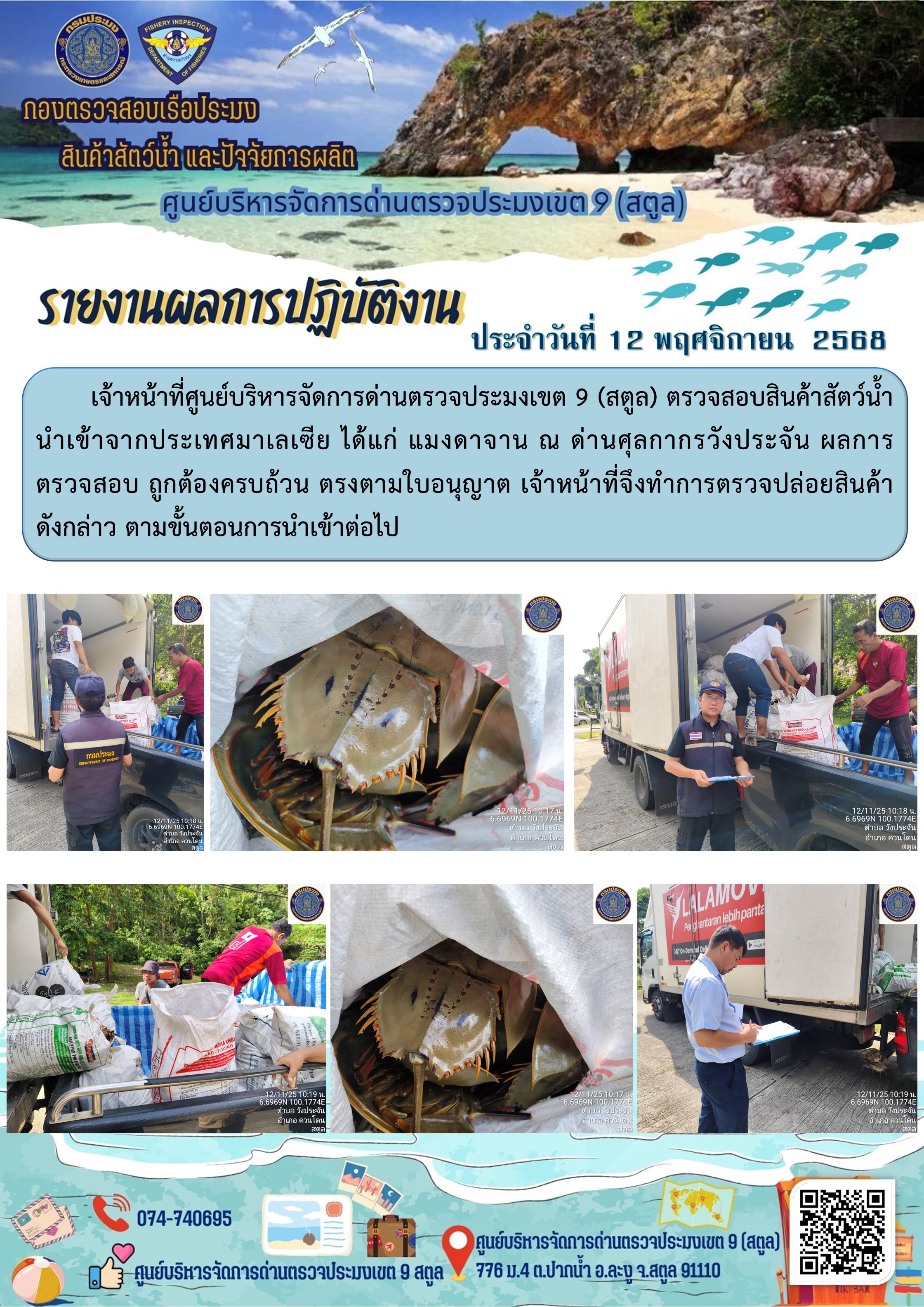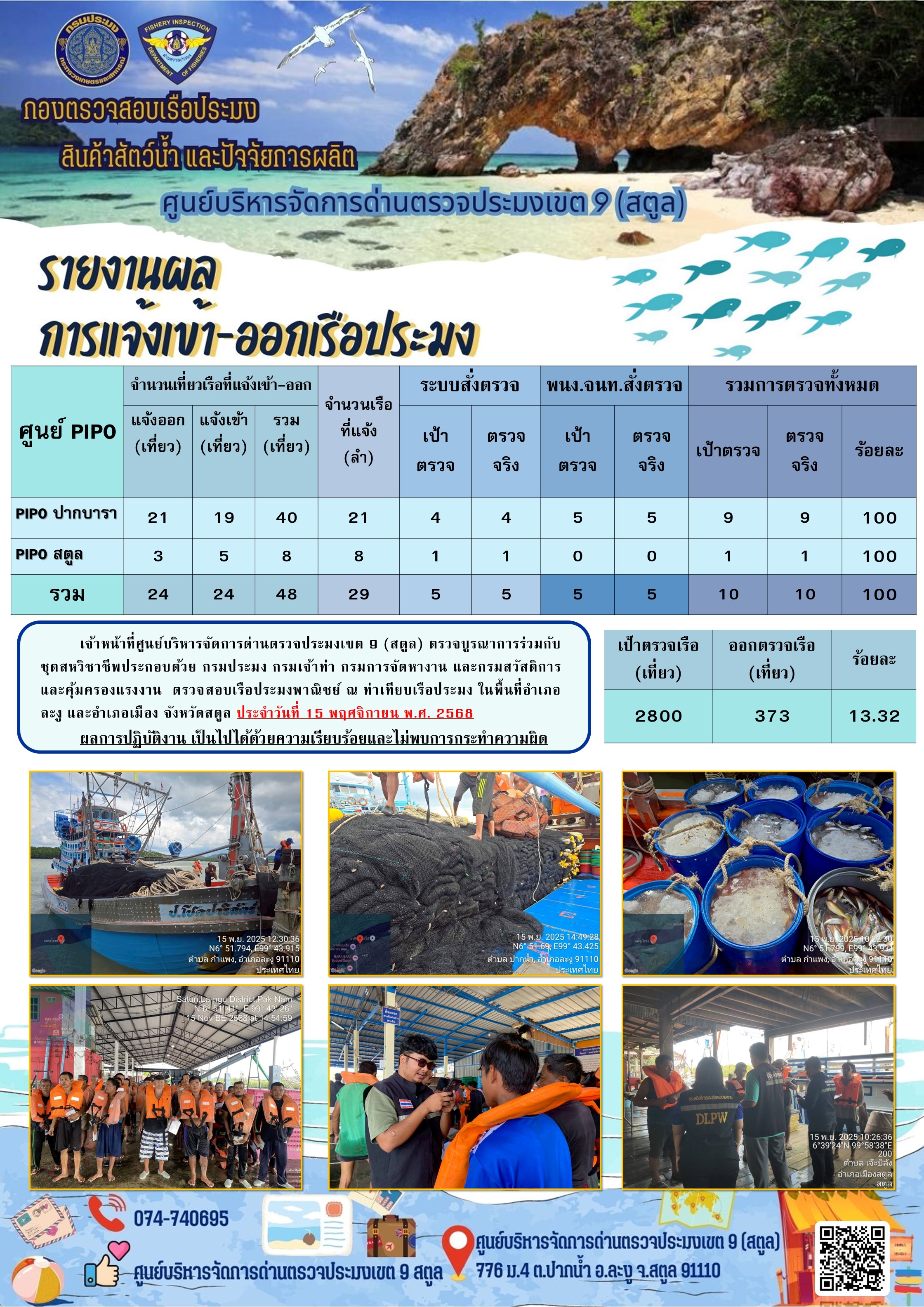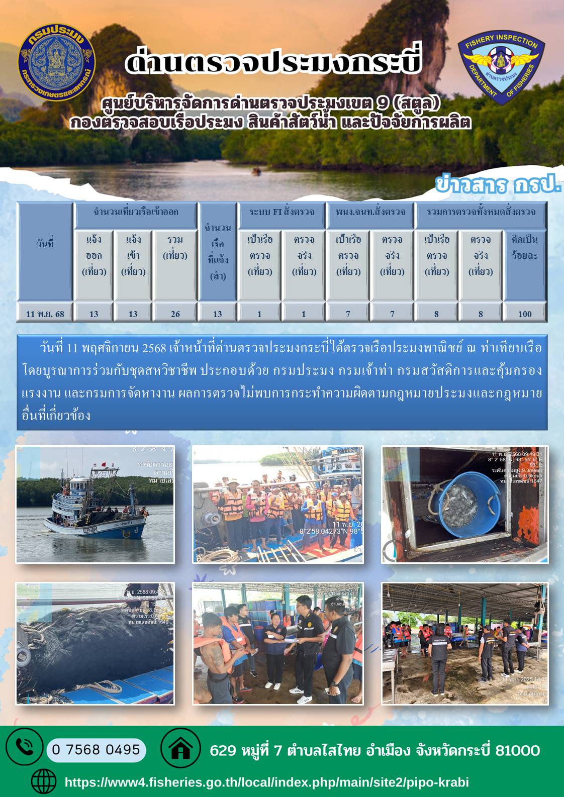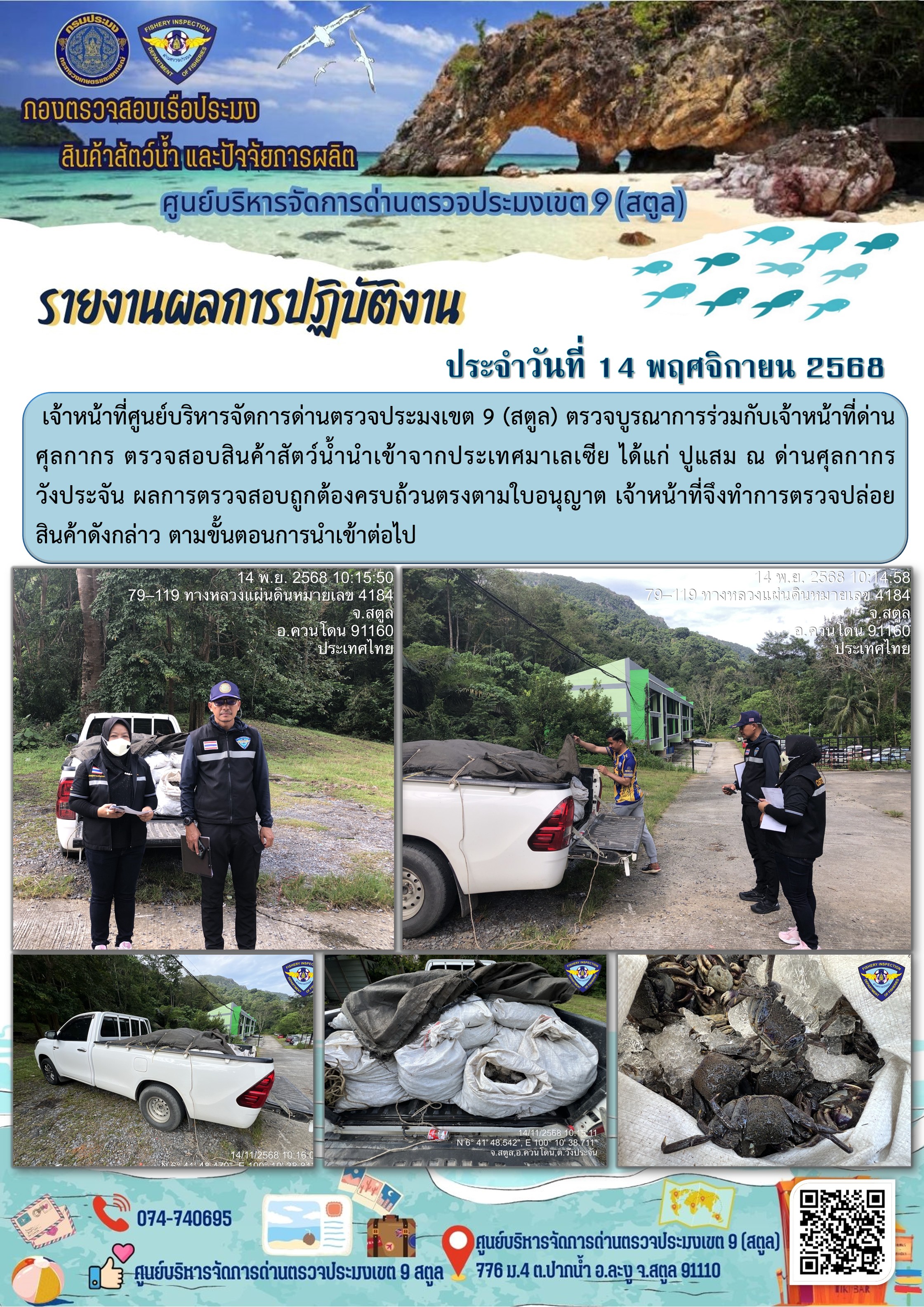 NEW ประชาสัมพันธ์การปฏิบัติงานศูนย์บริหารจัดการด่านตรวจประมงเขต 9 (สตูล) ประจำวันที่ 11-15 พฤศจิกายน 2568..คลิก
