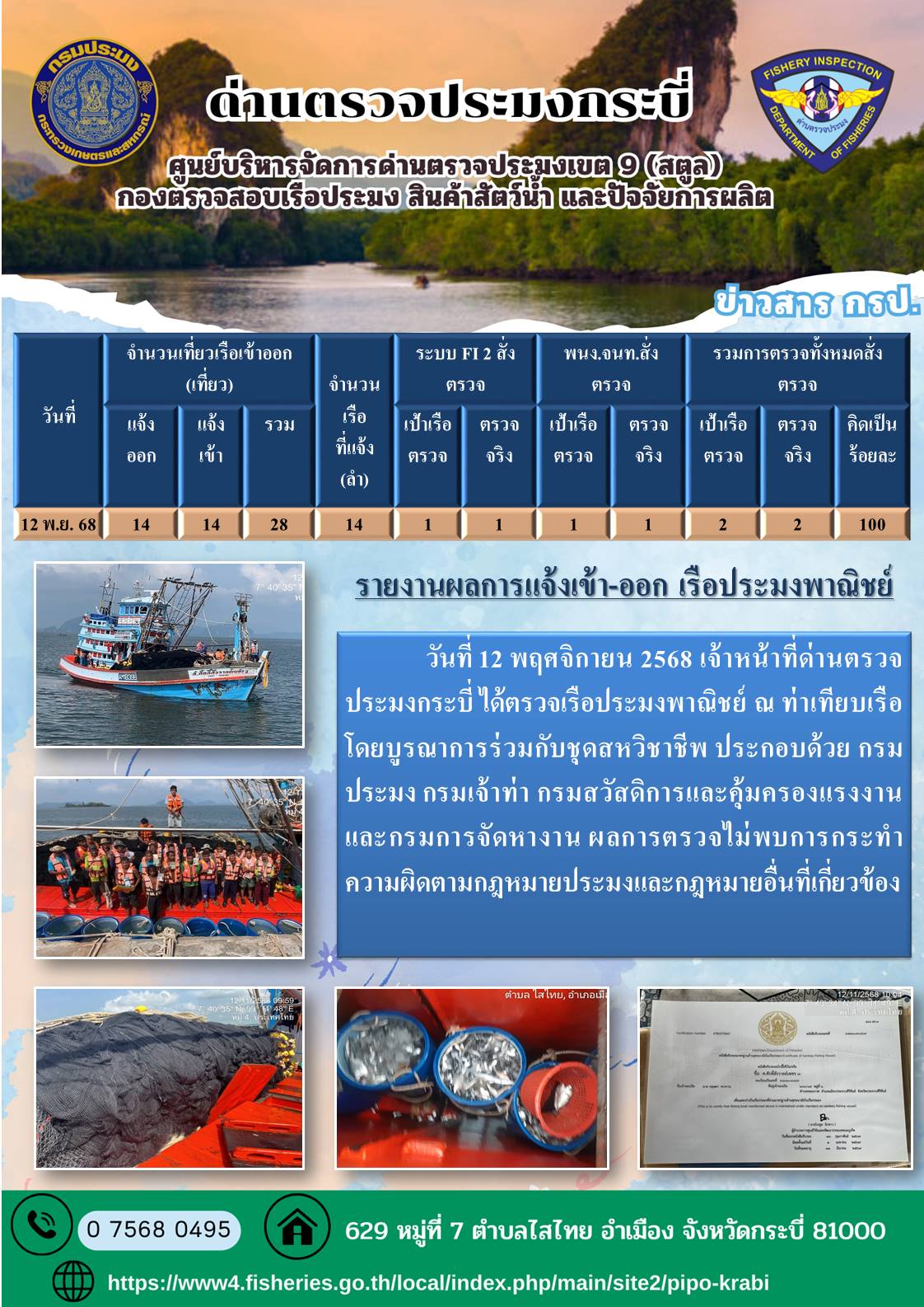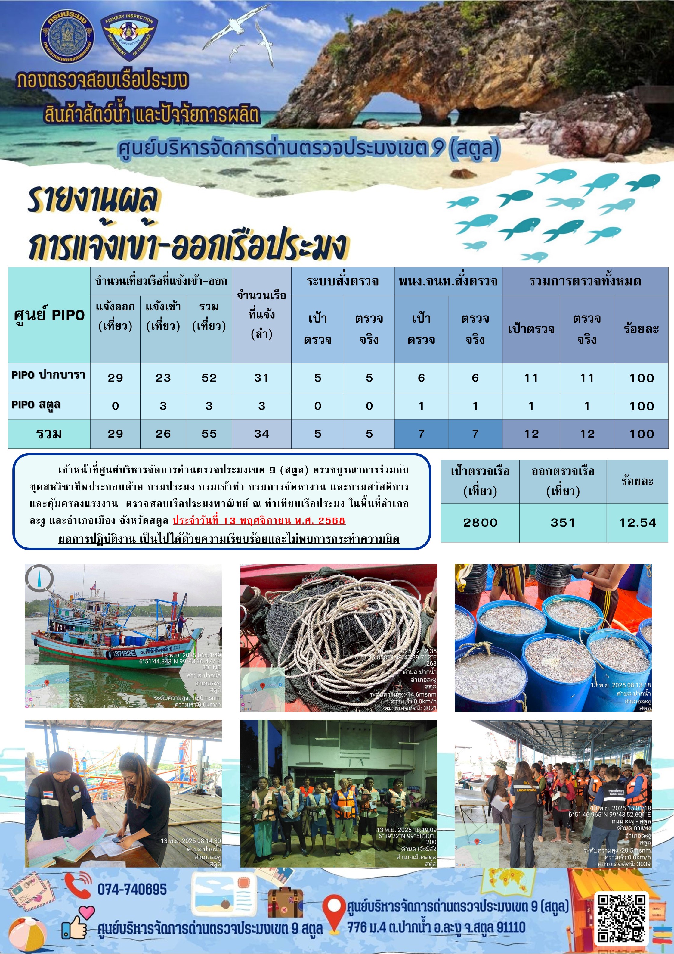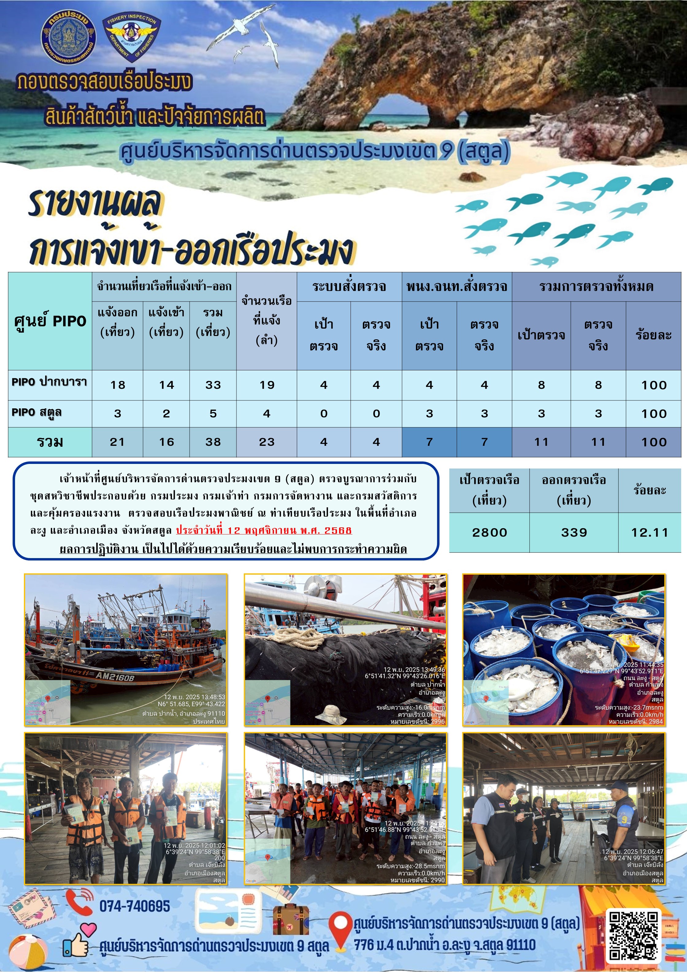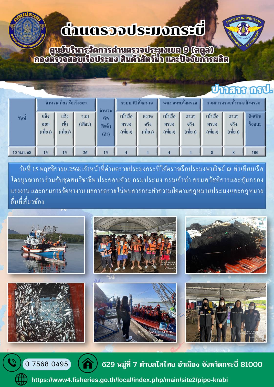 NEW ประชาสัมพันธ์การปฏิบัติงานศูนย์บริหารจัดการด่านตรวจประมงเขต 9 (สตูล) ประจำวันที่ 11-15 พฤศจิกายน 2568..คลิก