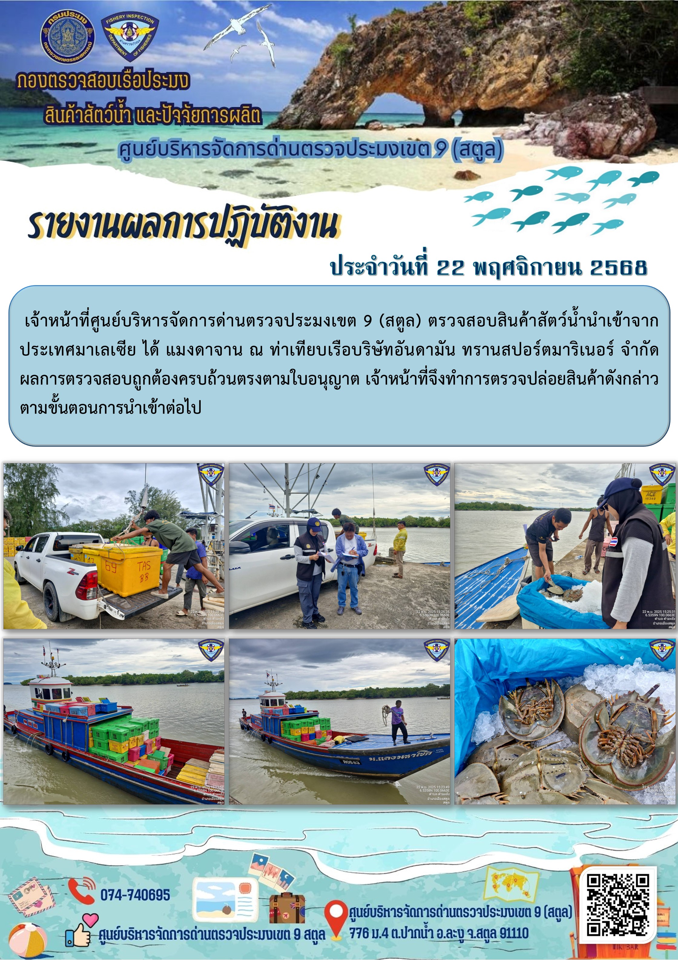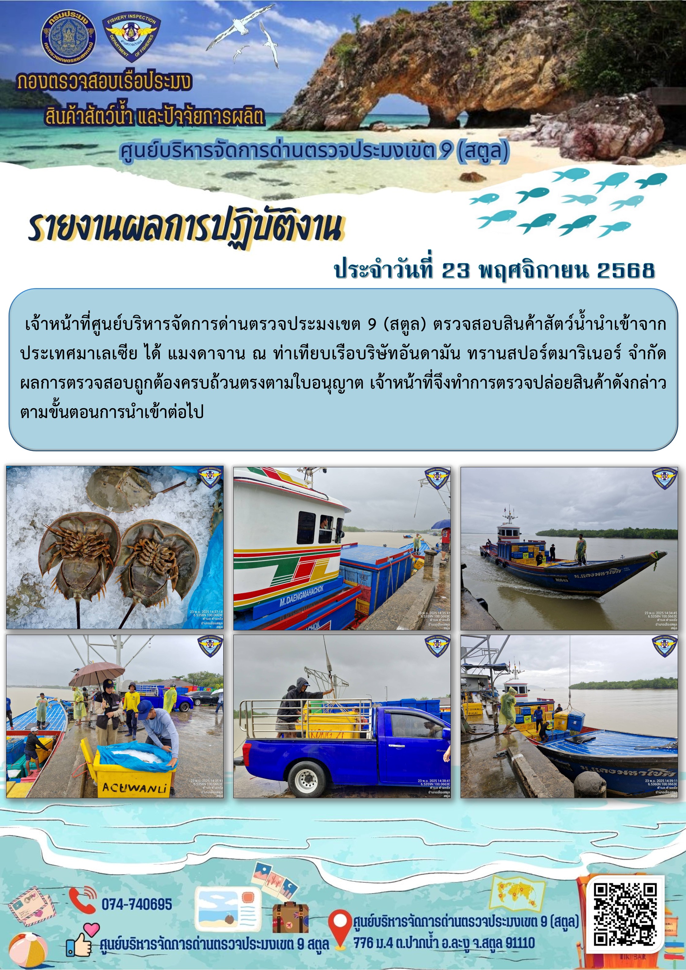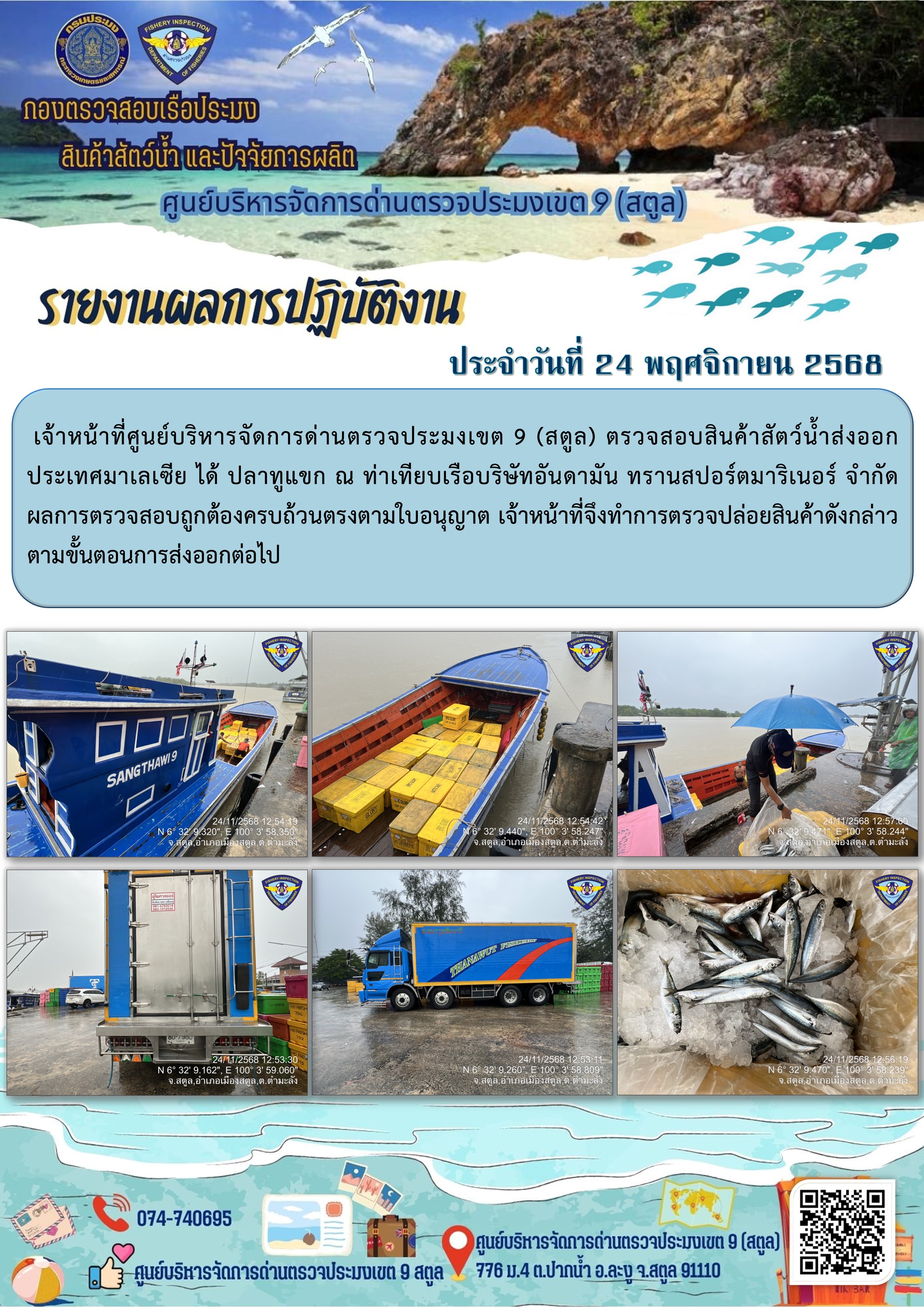 NEW ประชาสัมพันธ์การปฏิบัติงานศูนย์บริหารจัดการด่านตรวจประมงเขต 9 (สตูล) ประจำวันที่ 21-25 พฤศจิกายน 2568..คลิก