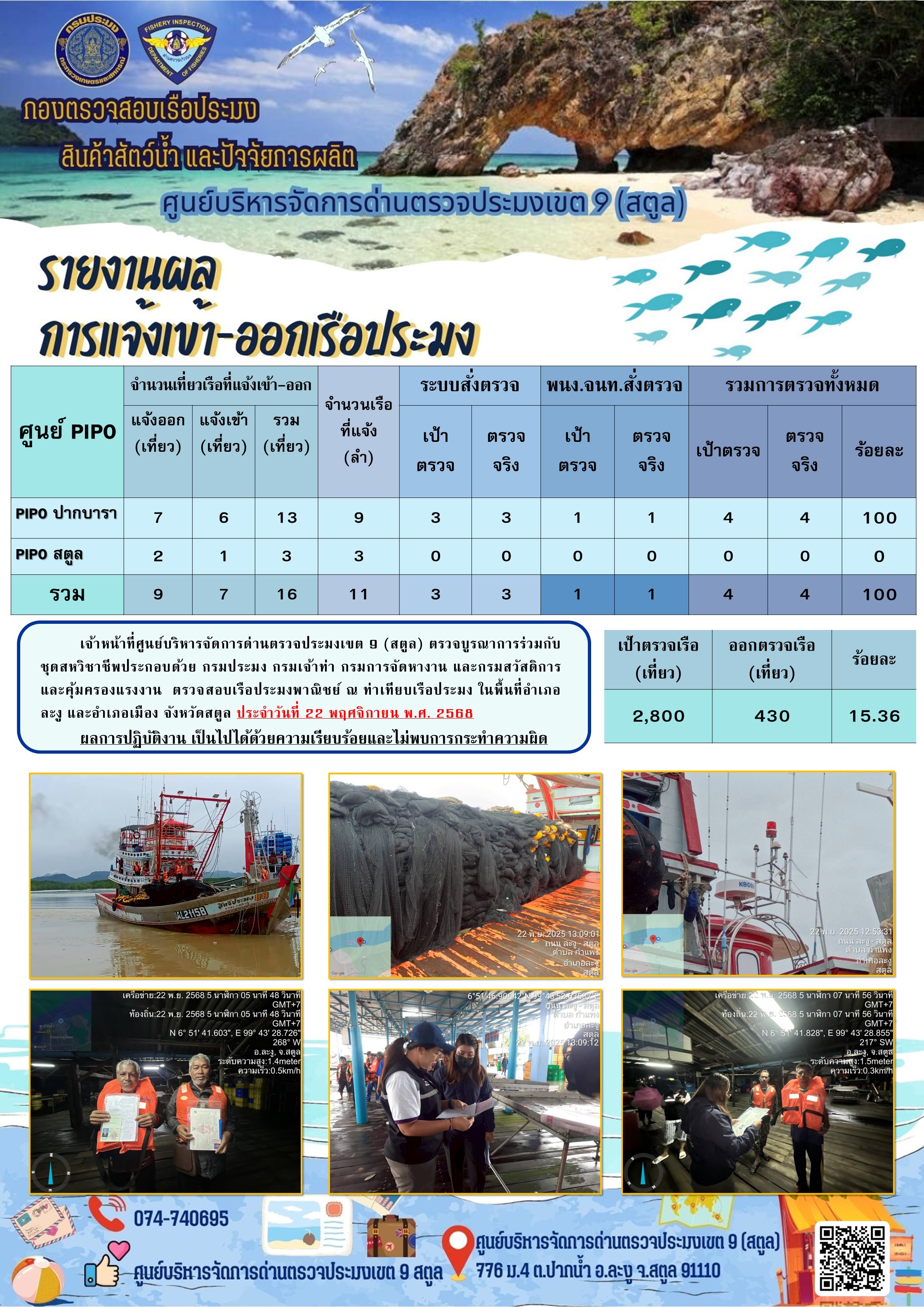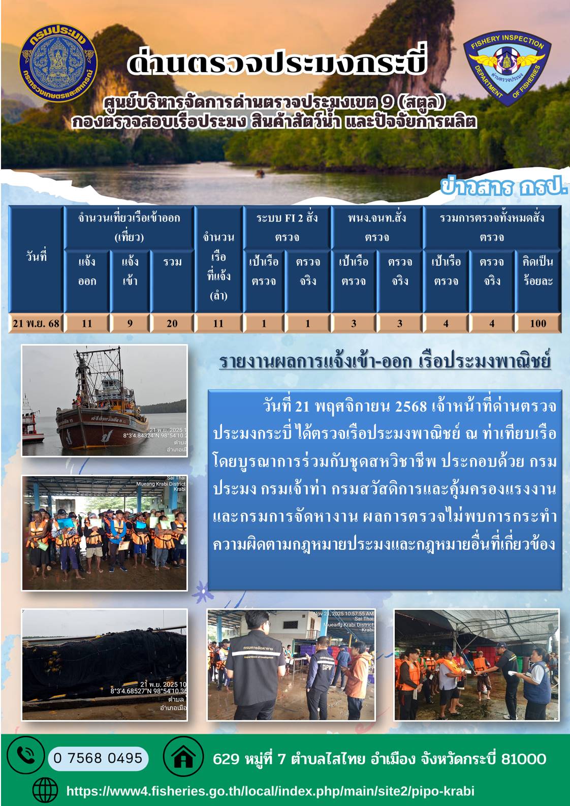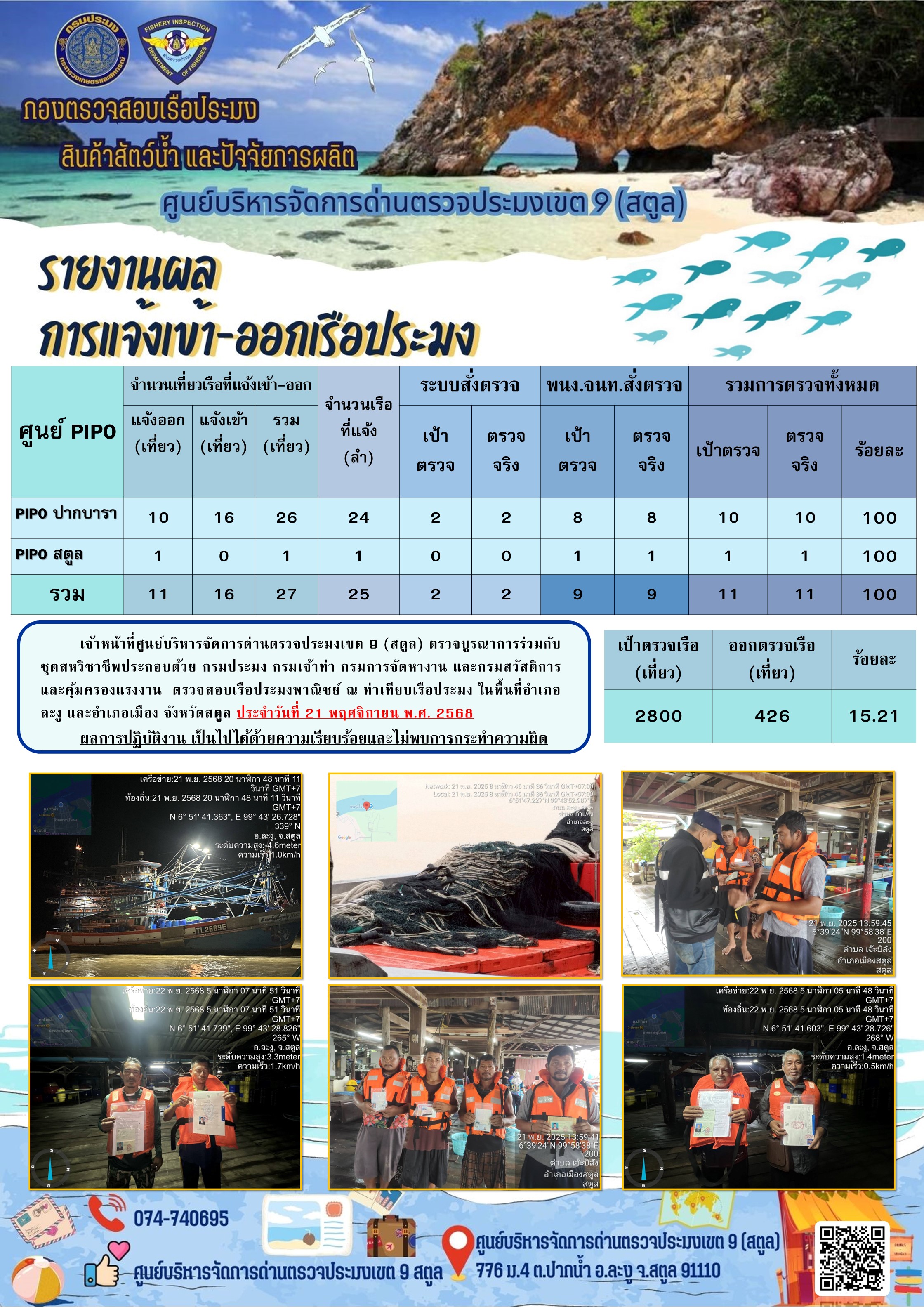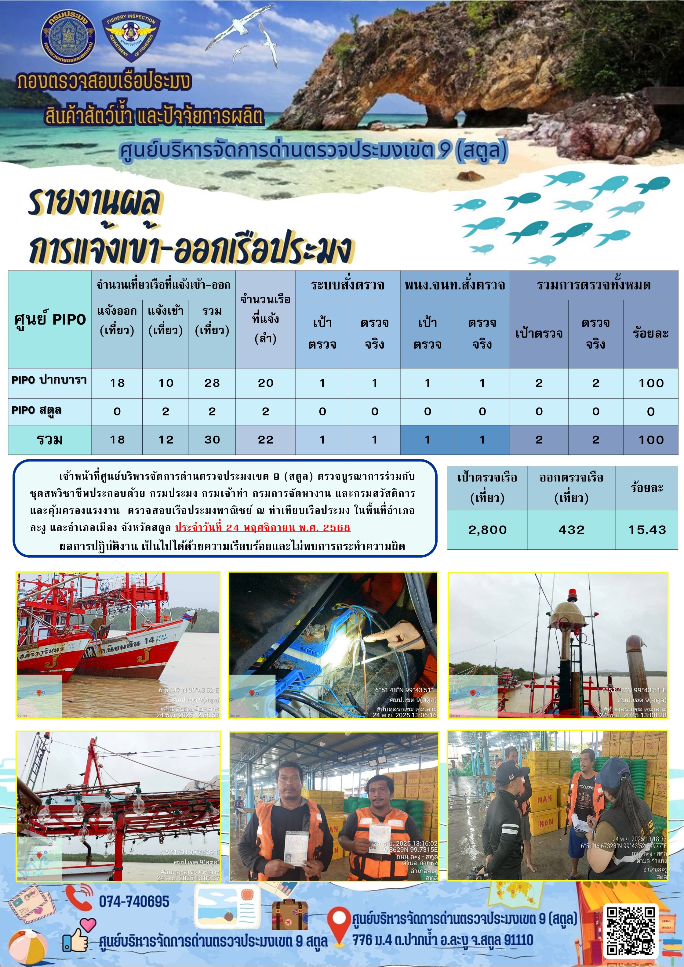 NEW ประชาสัมพันธ์การปฏิบัติงานศูนย์บริหารจัดการด่านตรวจประมงเขต 9 (สตูล) ประจำวันที่ 21-25 พฤศจิกายน 2568..คลิก