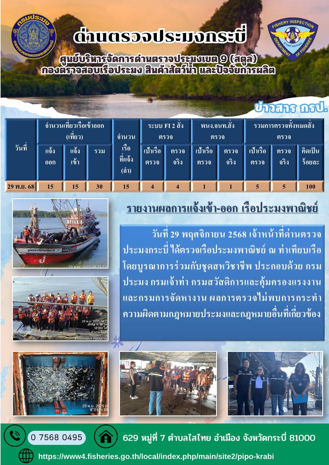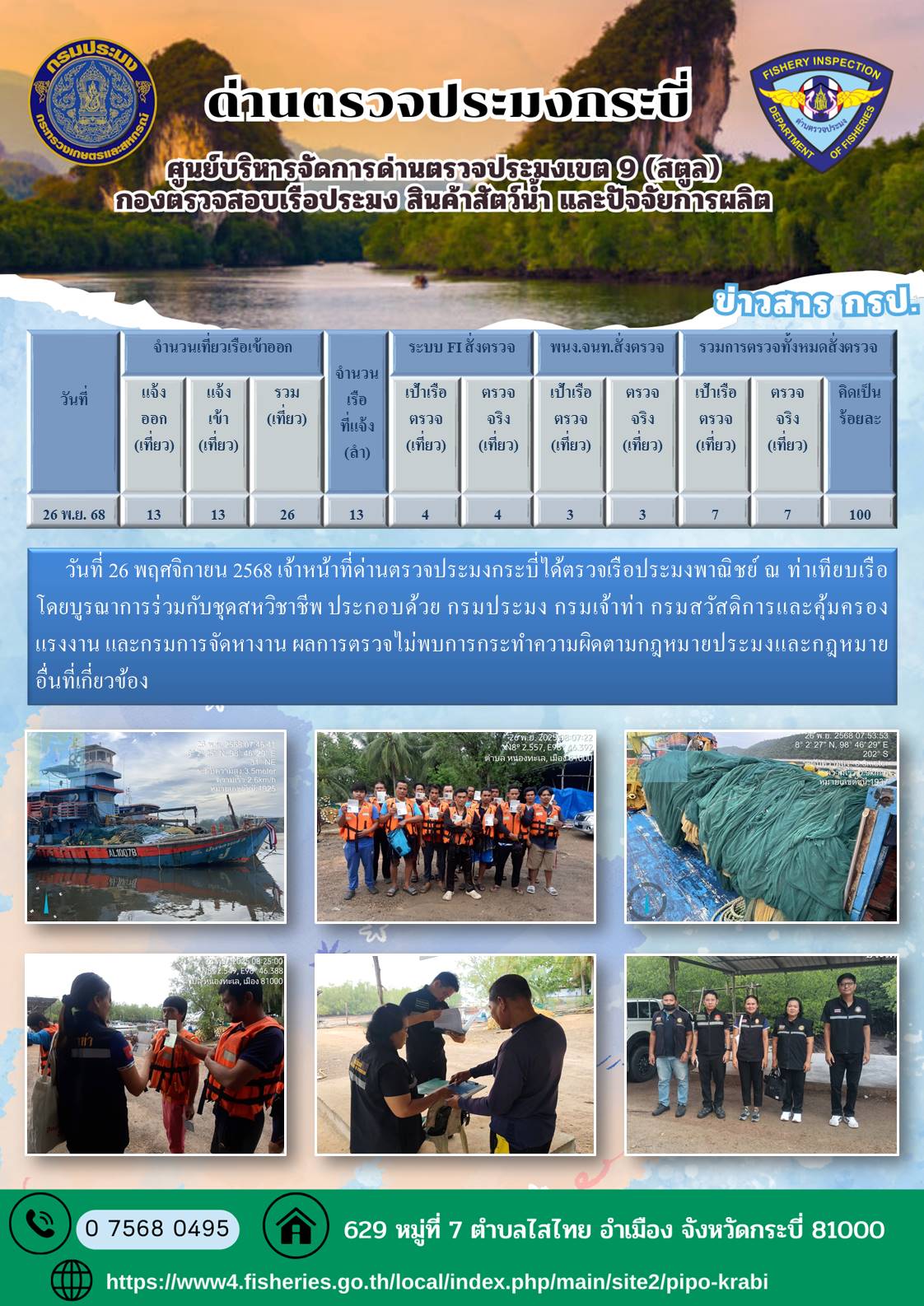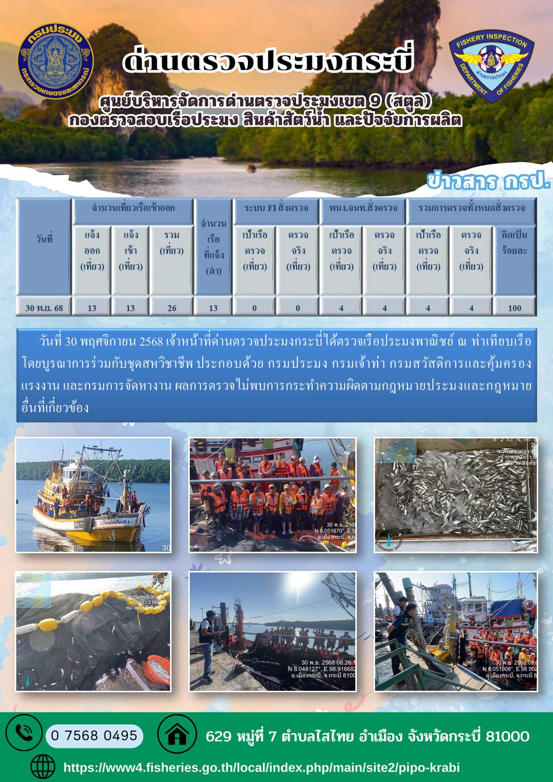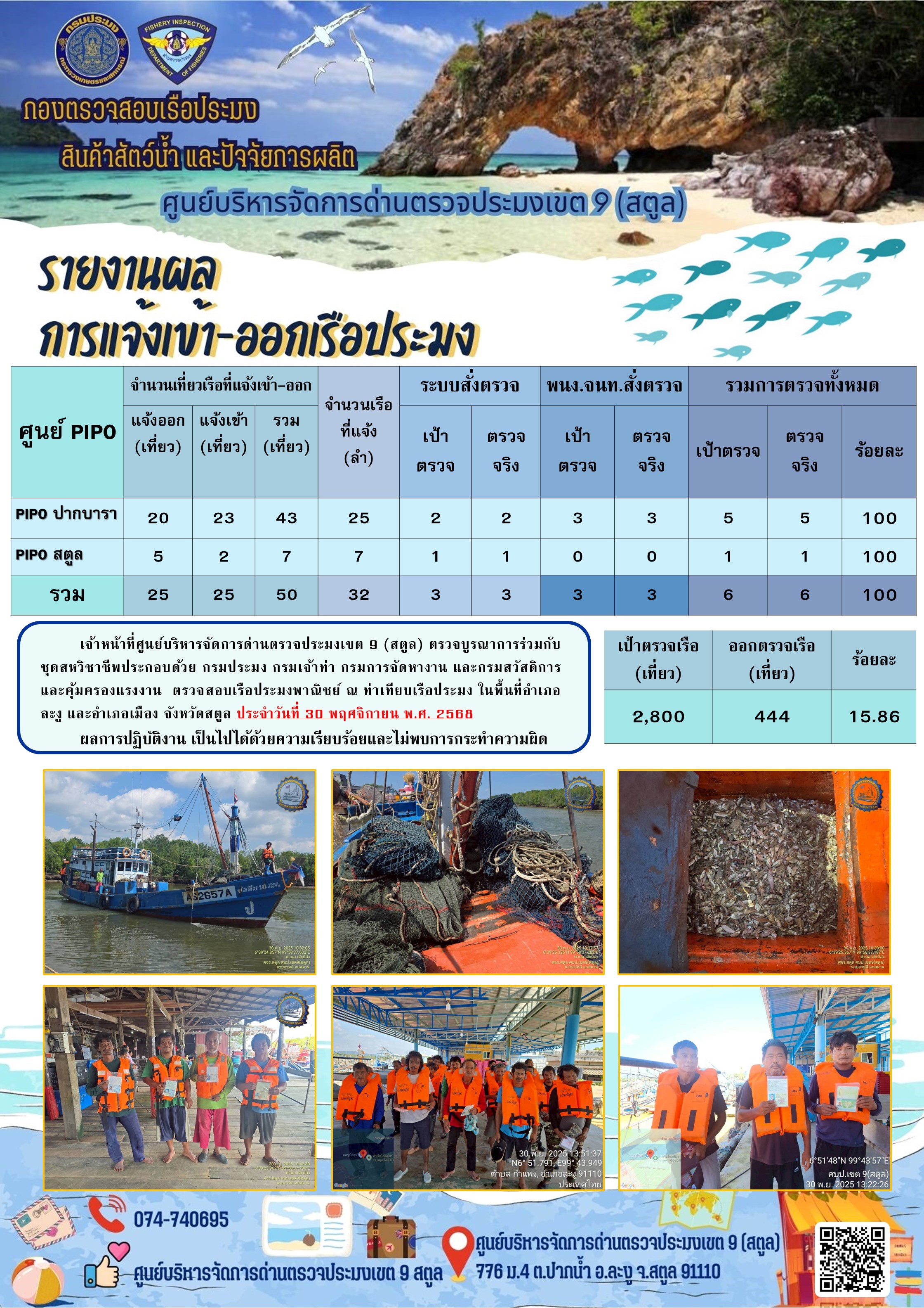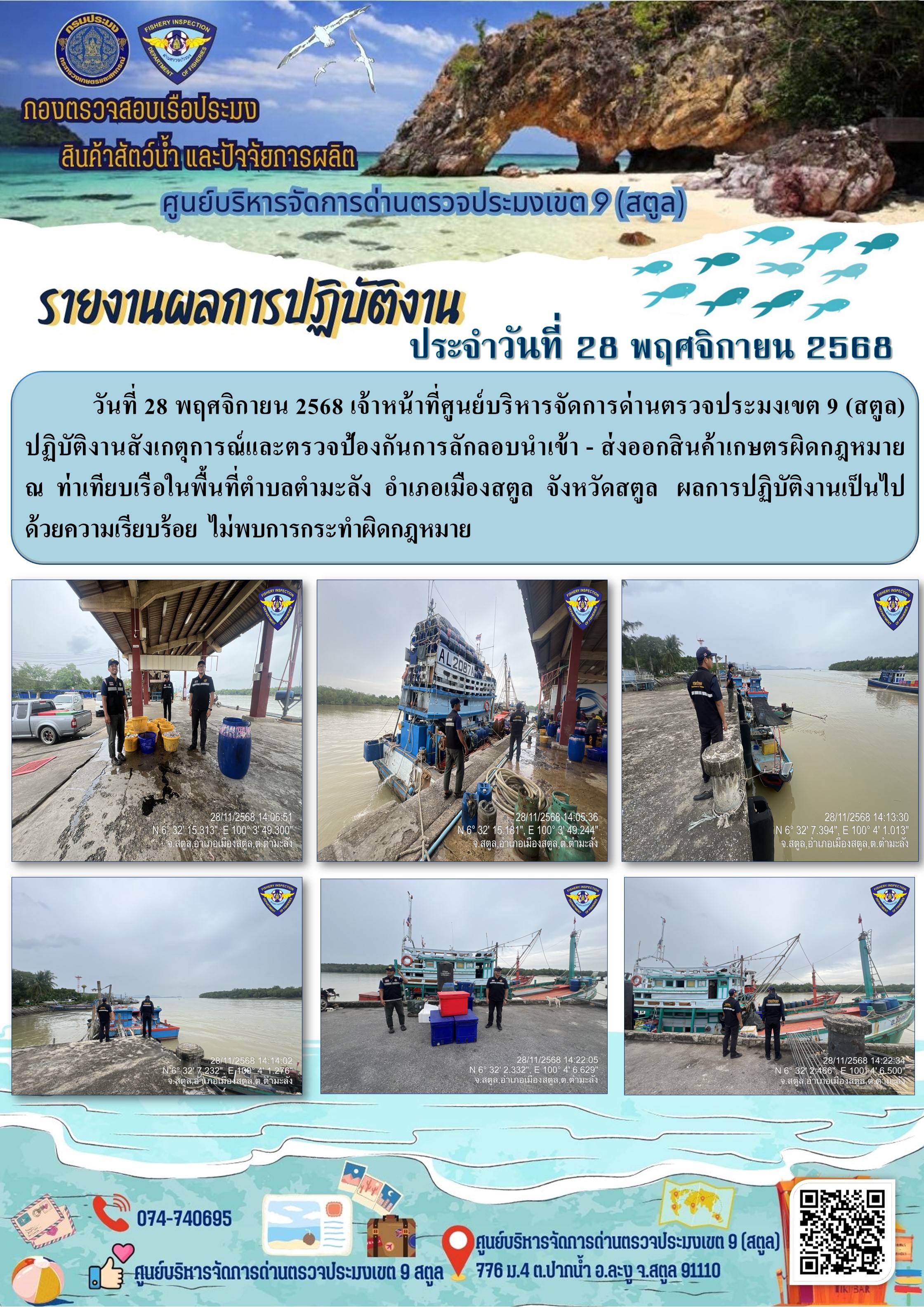 NEW ประชาสัมพันธ์การปฏิบัติงานศูนย์บริหารจัดการด่านตรวจประมงเขต 9 (สตูล) ประจำวันที่ 26-30 พฤศจิกายน 2568..คลิก