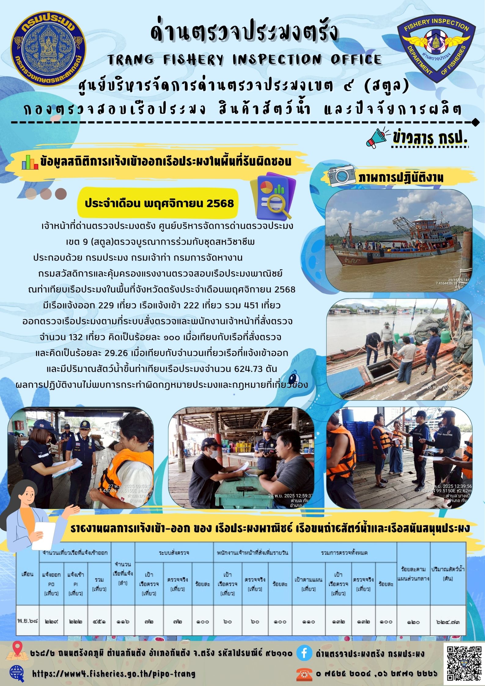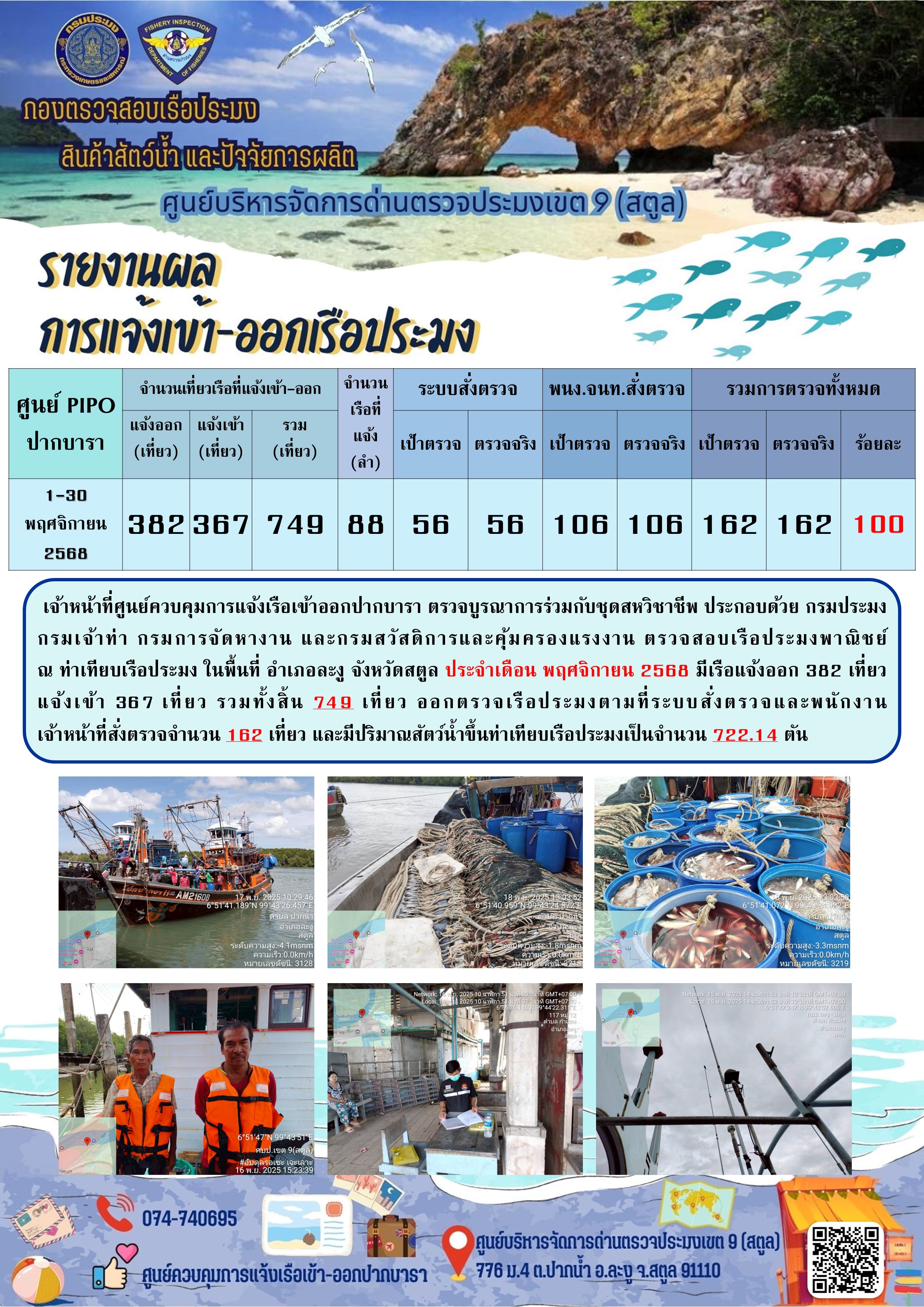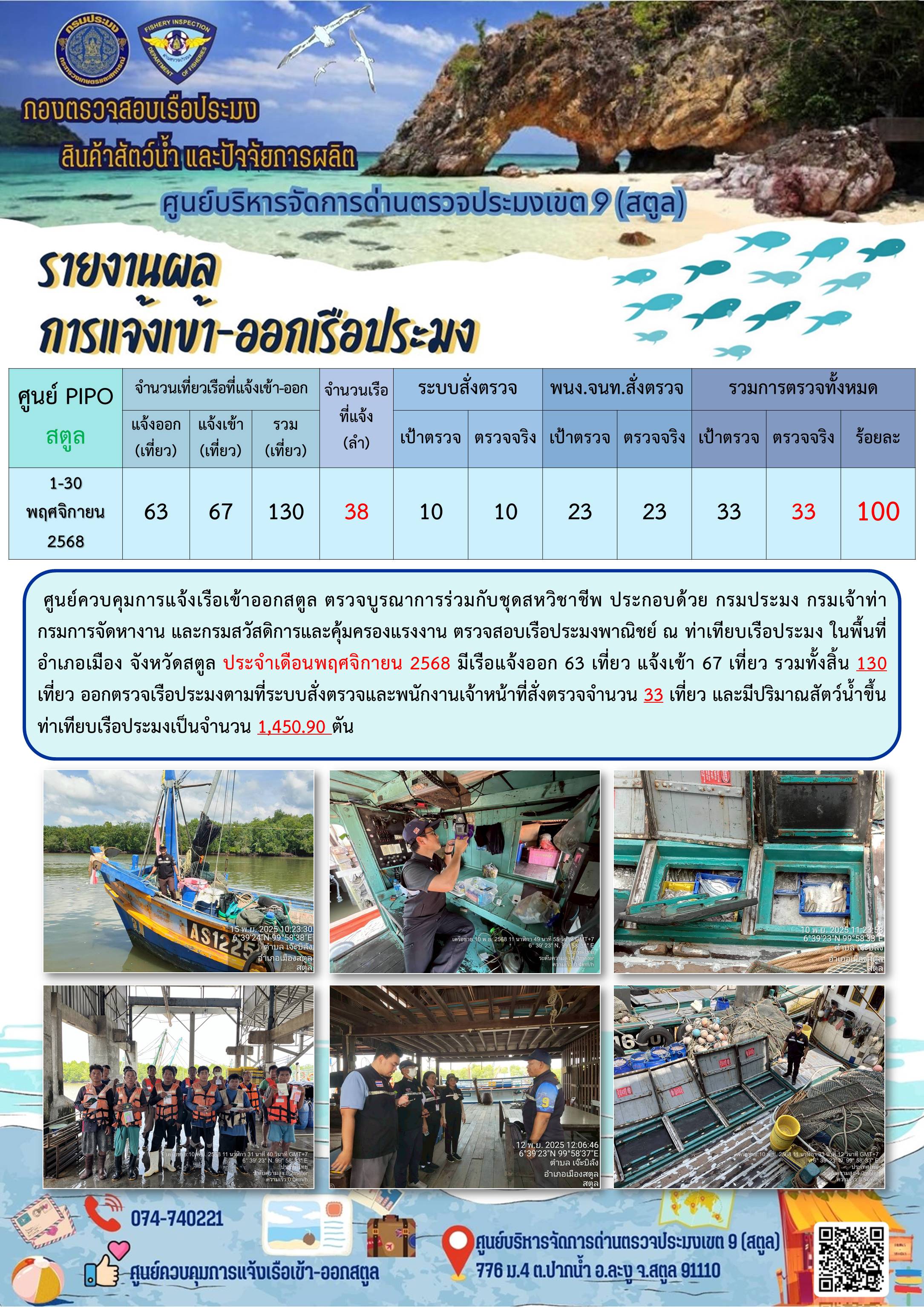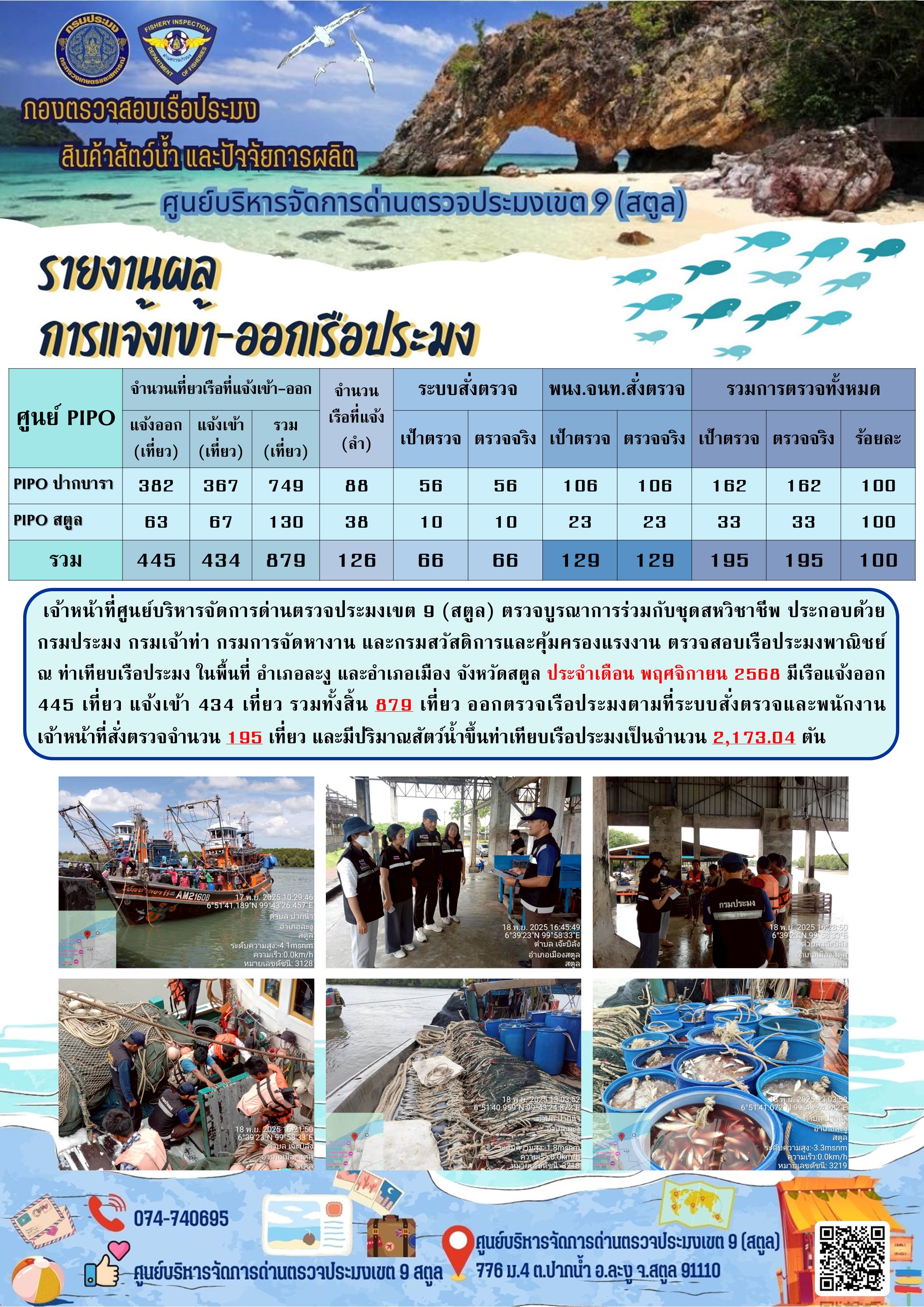 ผลการปฏิบัติงาน การตรวจสอบเรือประมงไทยที่แจ้งเข้าออก และการตรวจสอบการนำเข้า-ส่งออกสินค้าสัตว์น้ำ ในเขตพื้นที่รับผิดชอบของศูนย์บริหารจัดการด่านตรวจประมงเขต 9 (สตูล) ประจำเดือน พฤศจิกายน 2568
