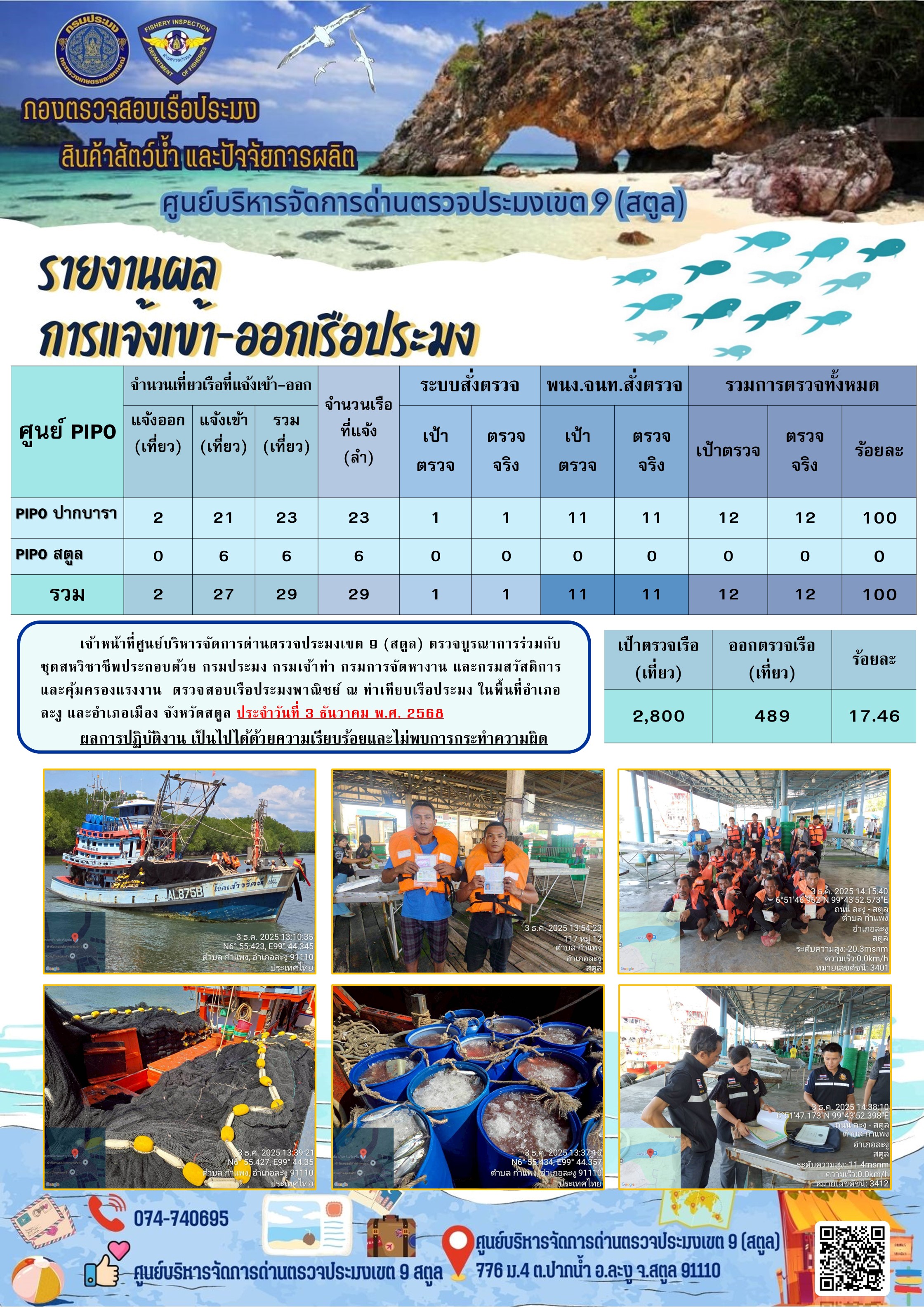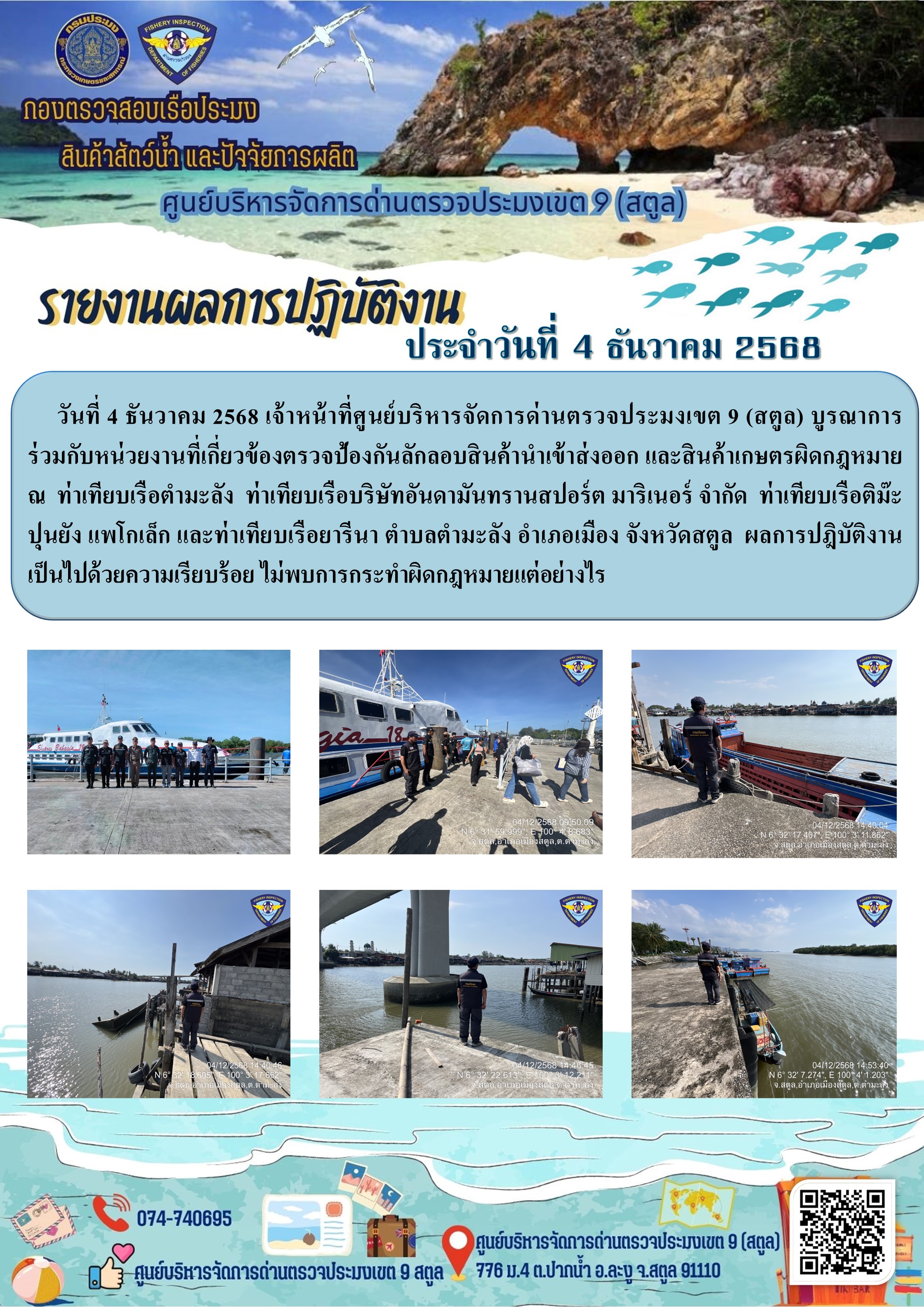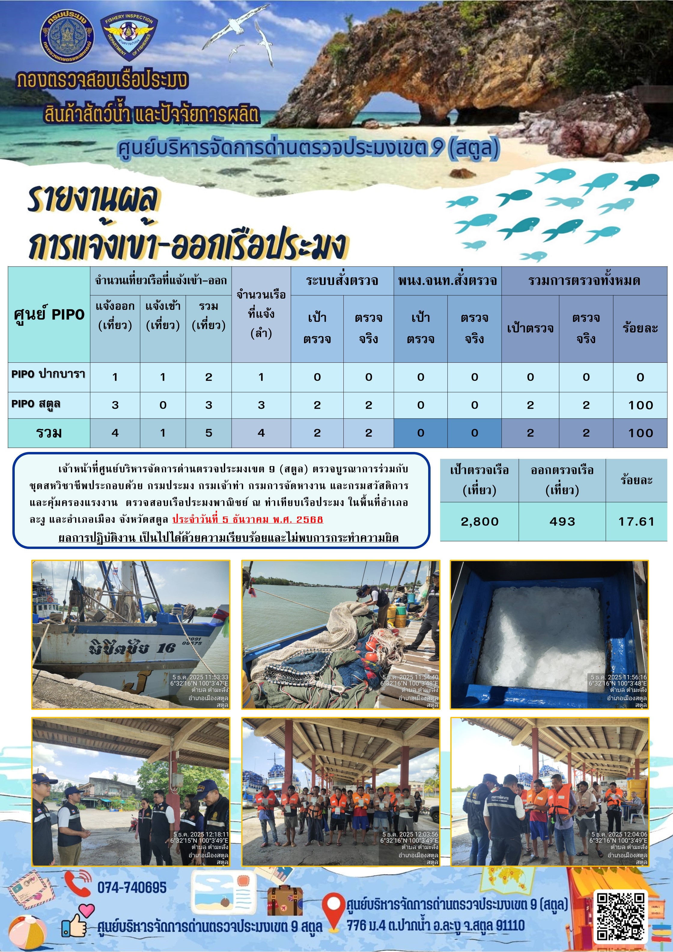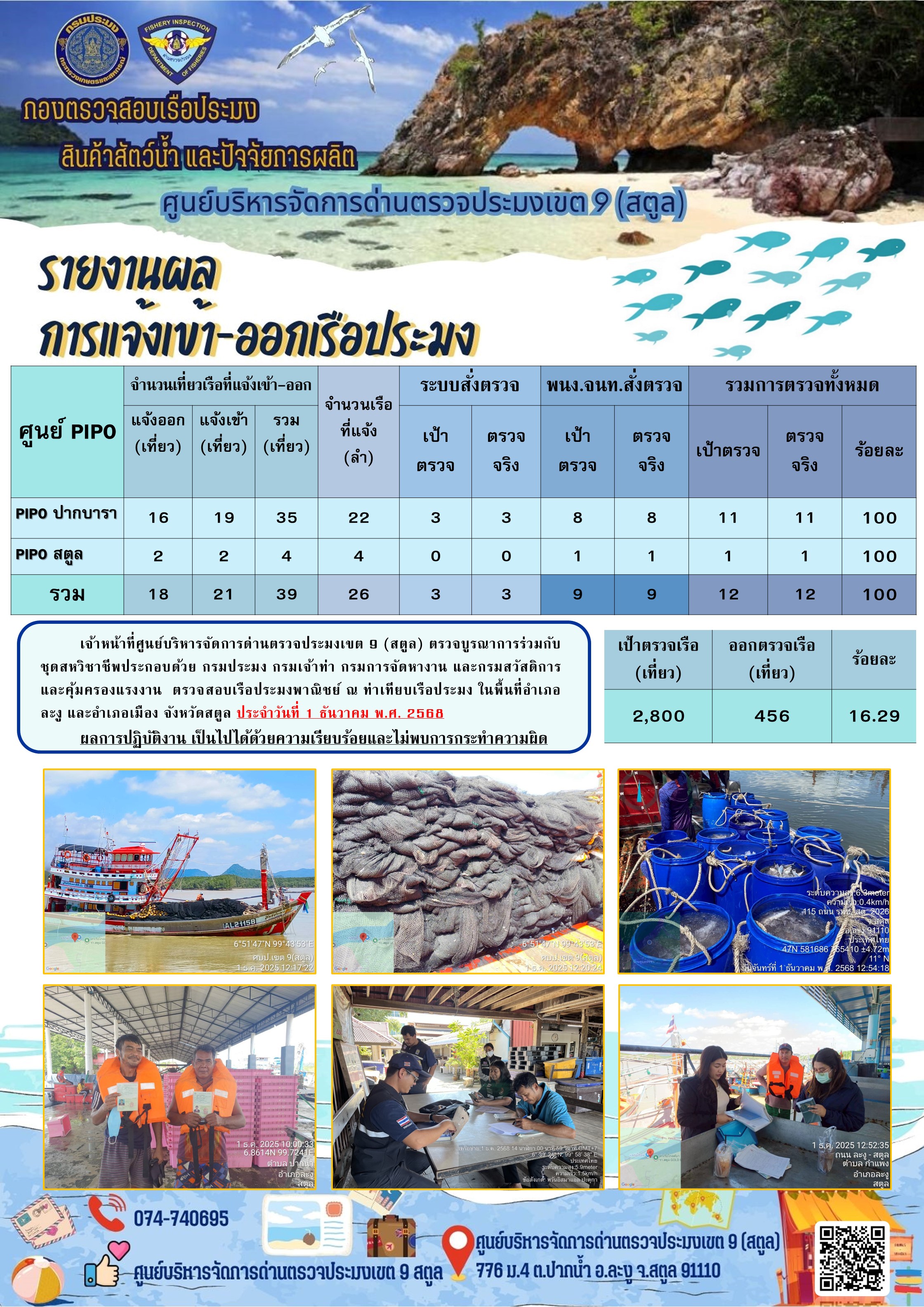 ประชาสัมพันธ์การปฏิบัติงานศูนย์บริหารจัดการด่านตรวจประมงเขต 9 (สตูล) ประจำวันที่ 1-5 ธันวาคม 2568