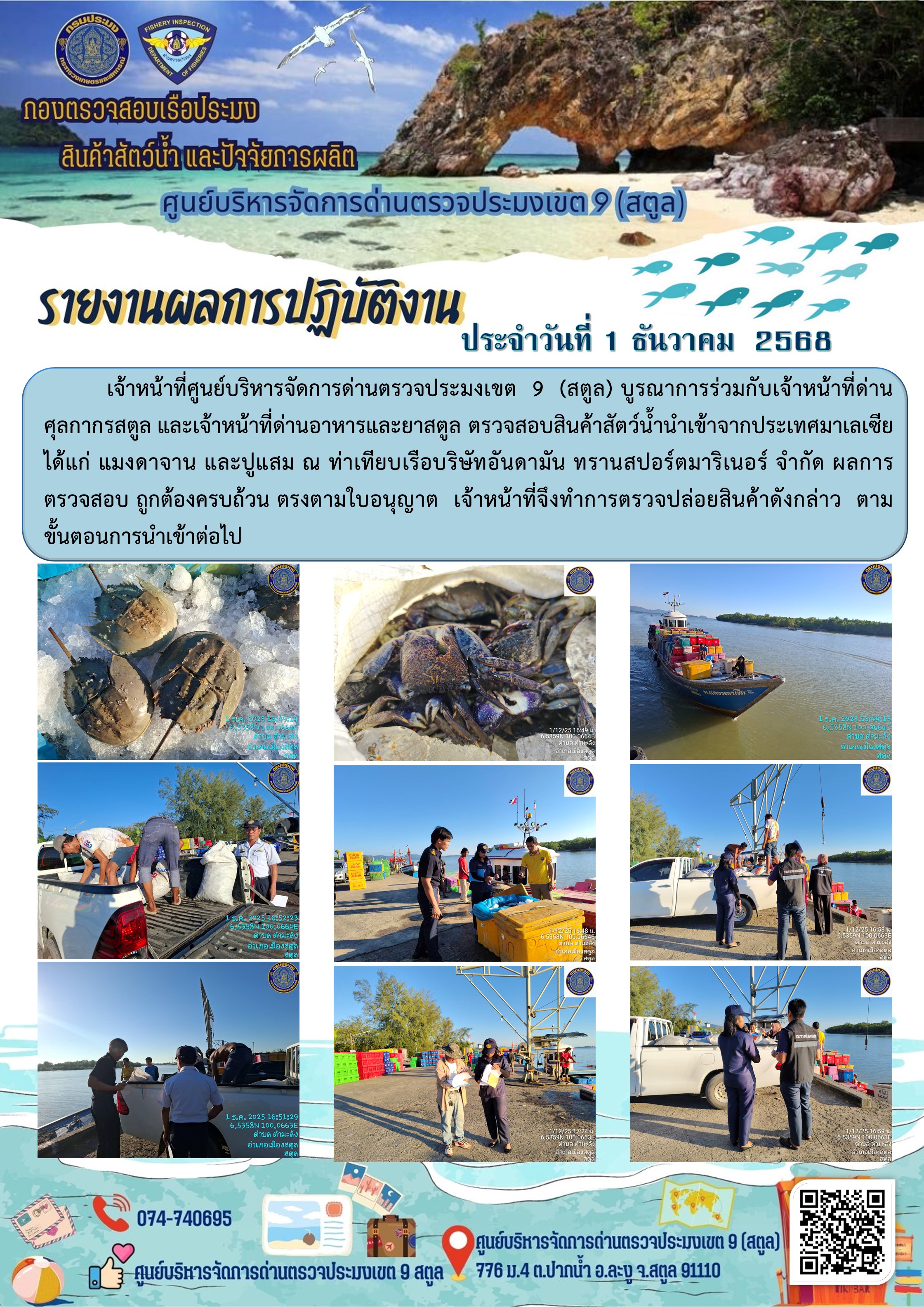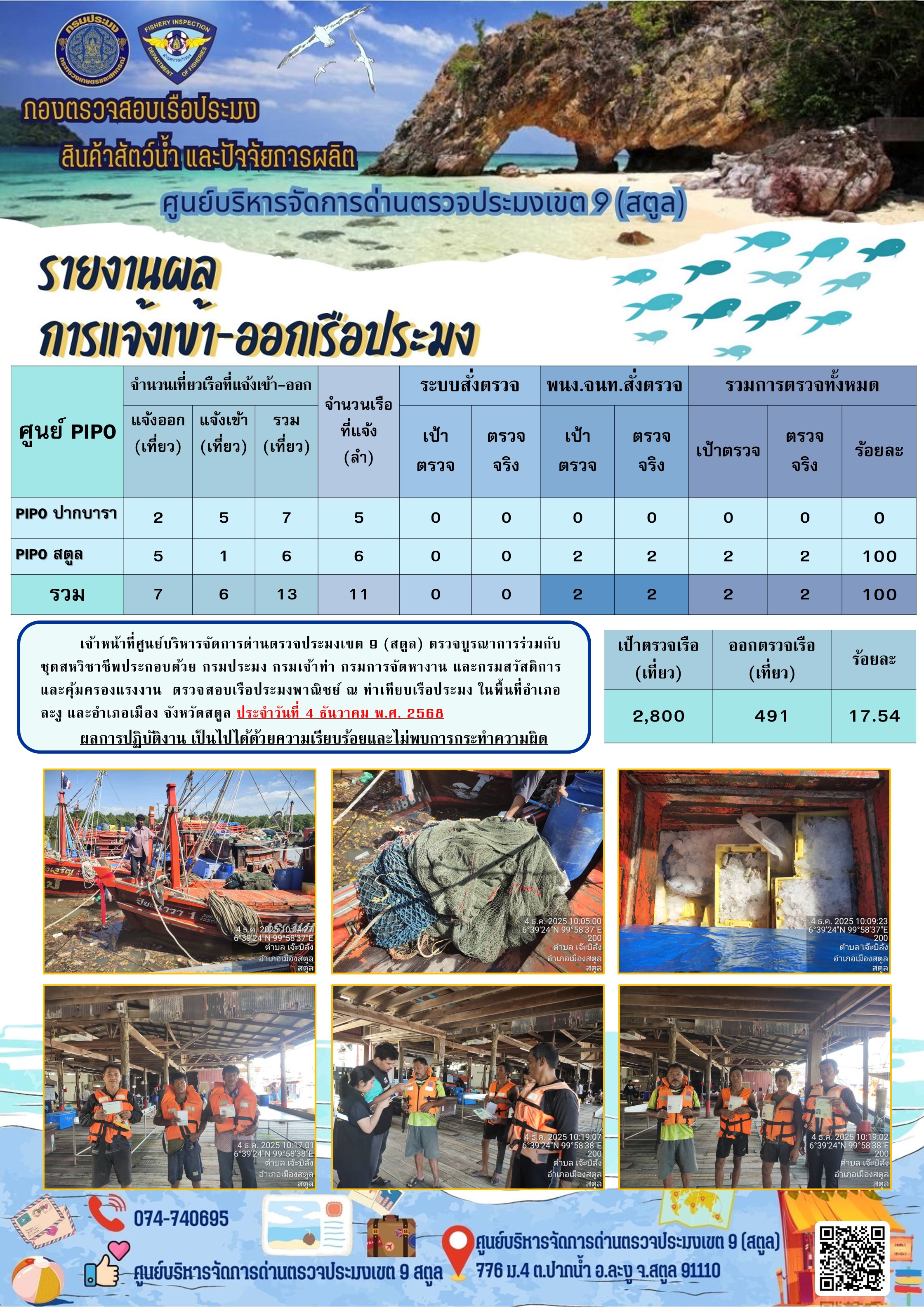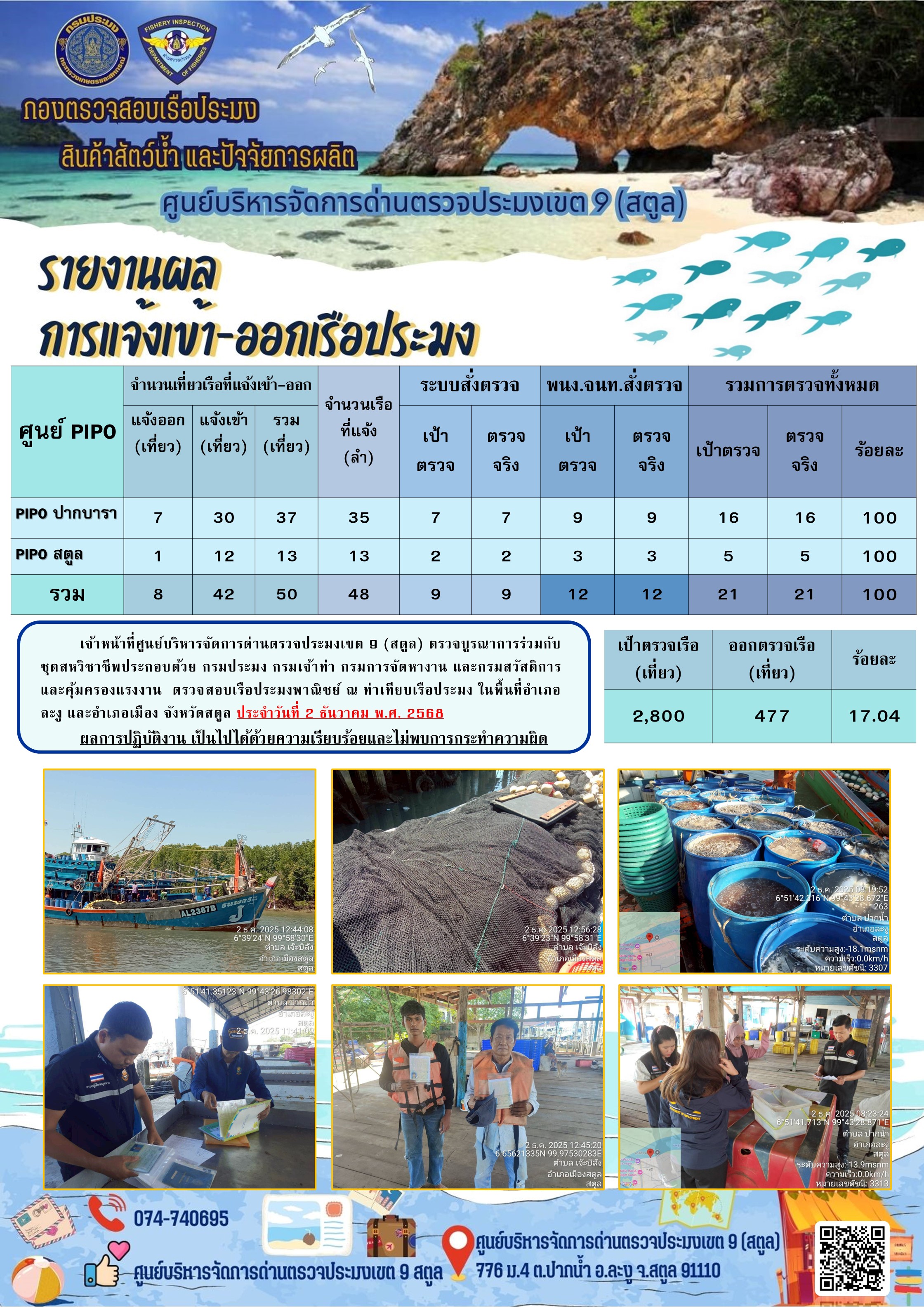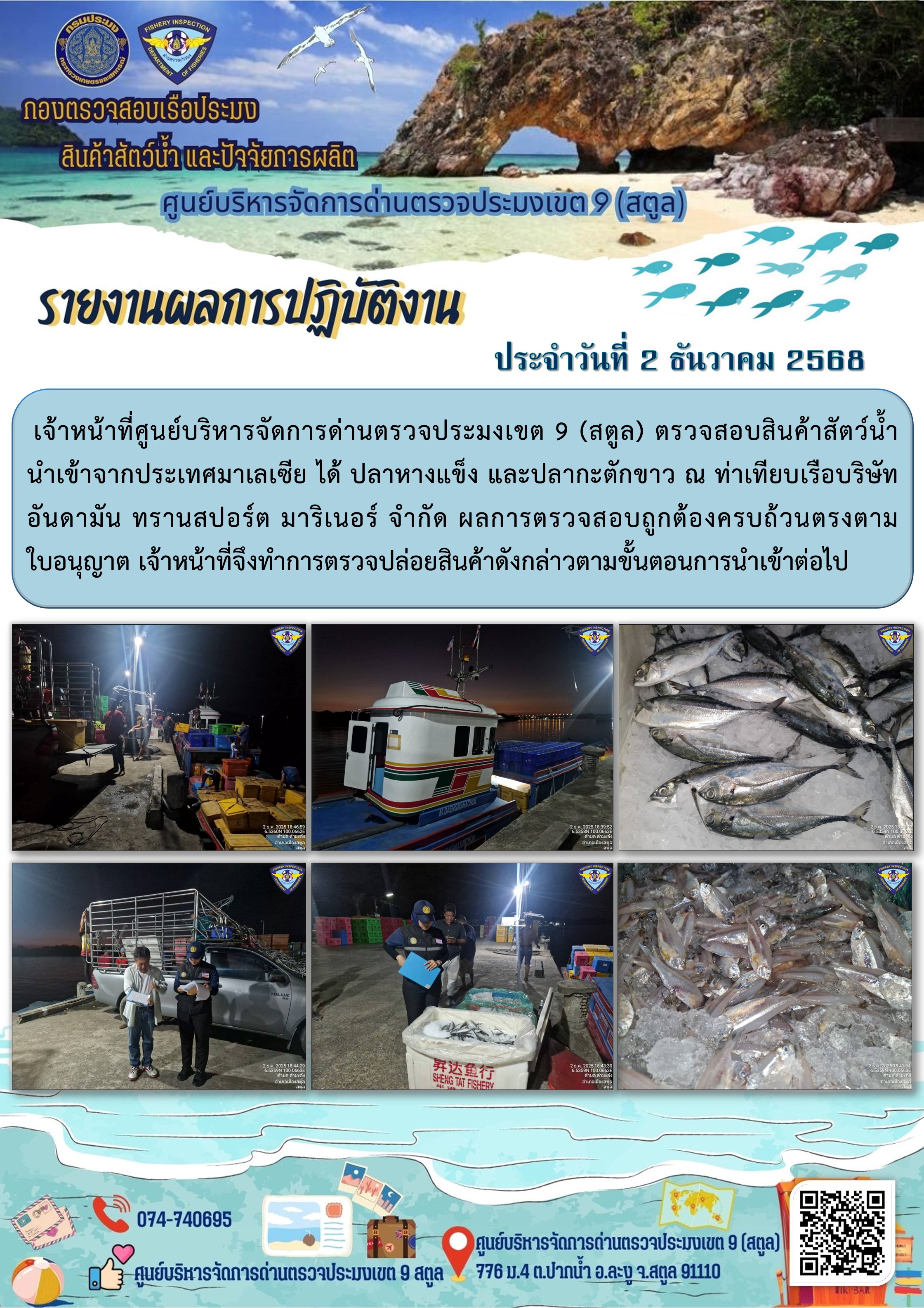 ประชาสัมพันธ์การปฏิบัติงานศูนย์บริหารจัดการด่านตรวจประมงเขต 9 (สตูล) ประจำวันที่ 1-5 ธันวาคม 2568