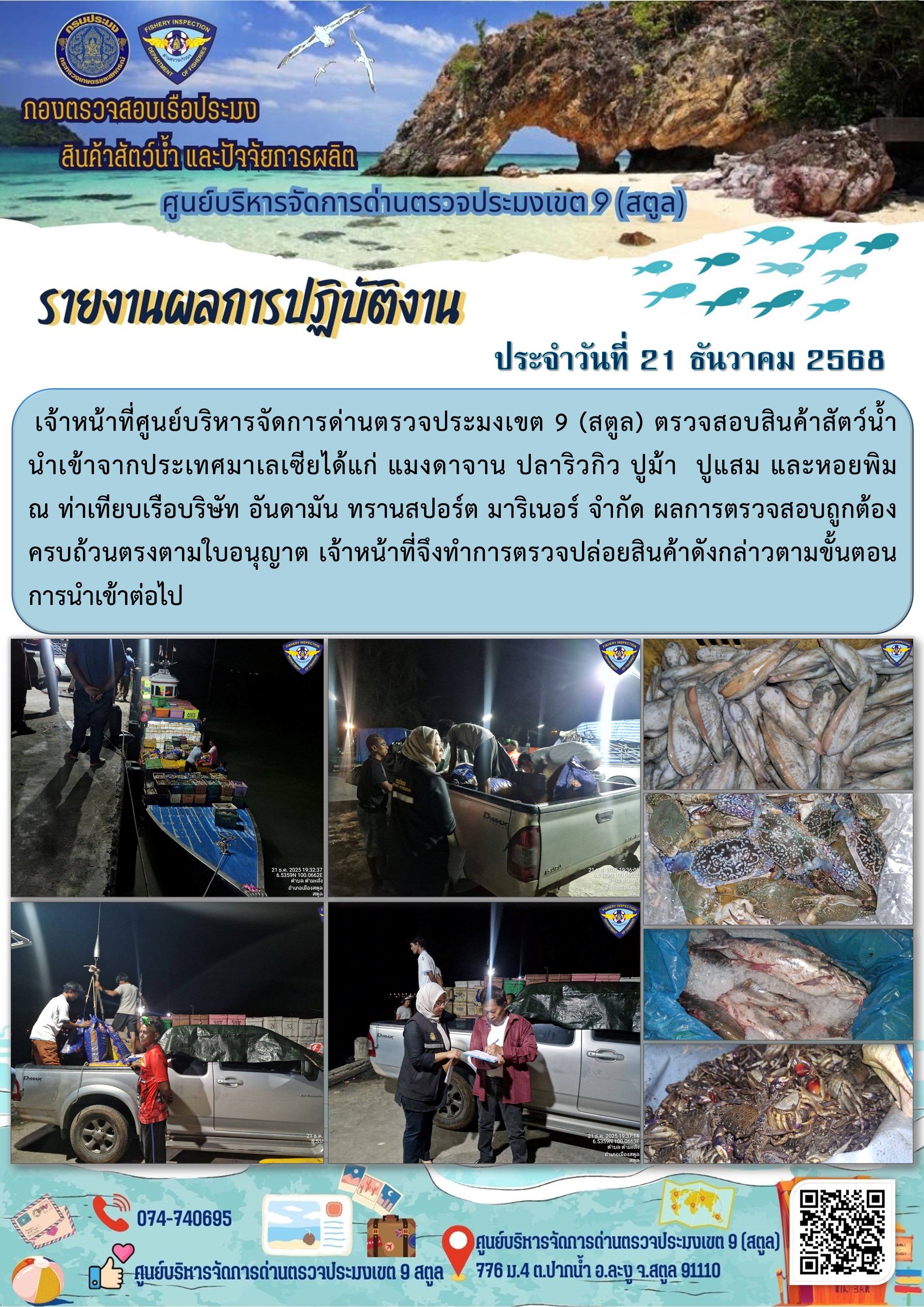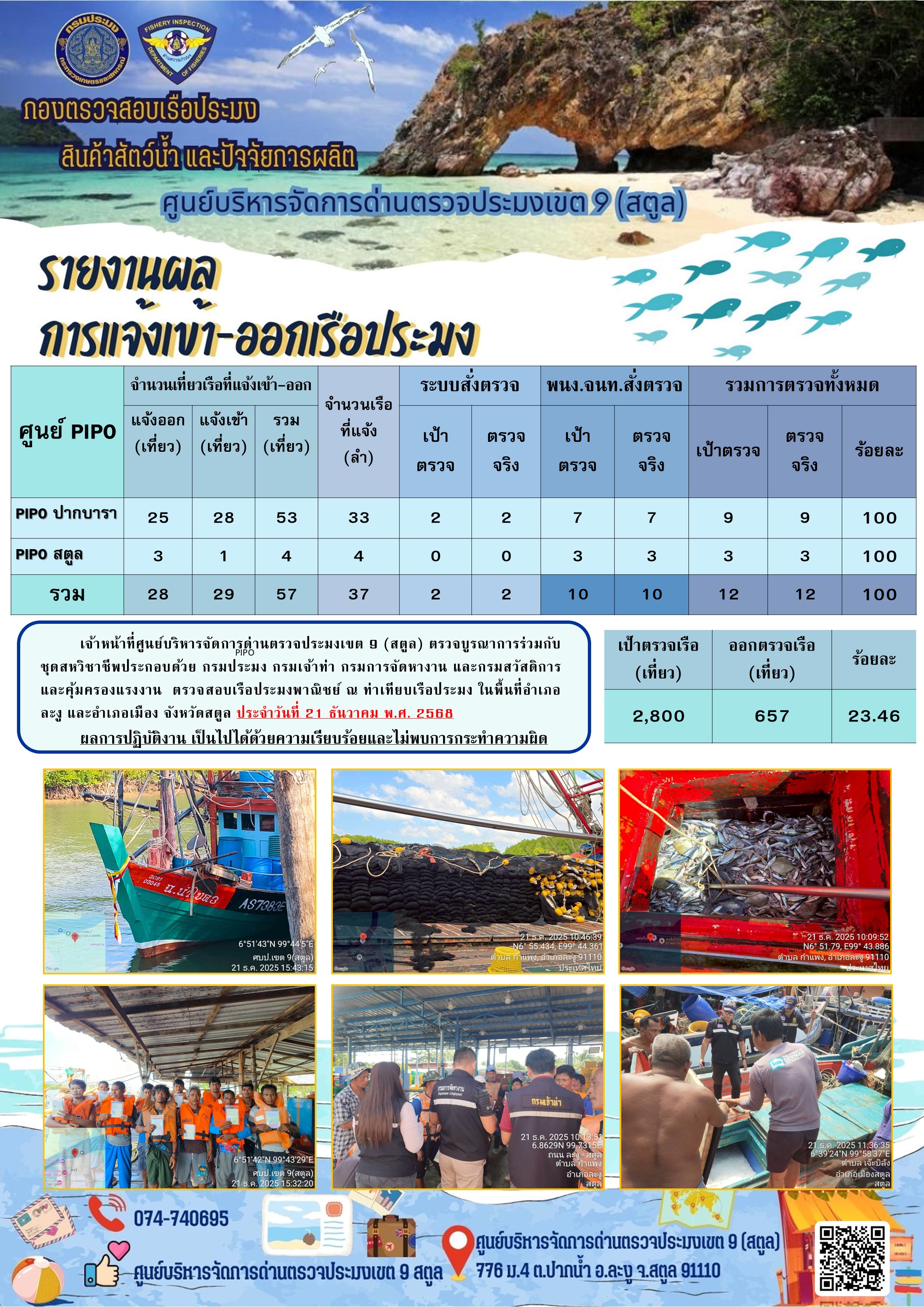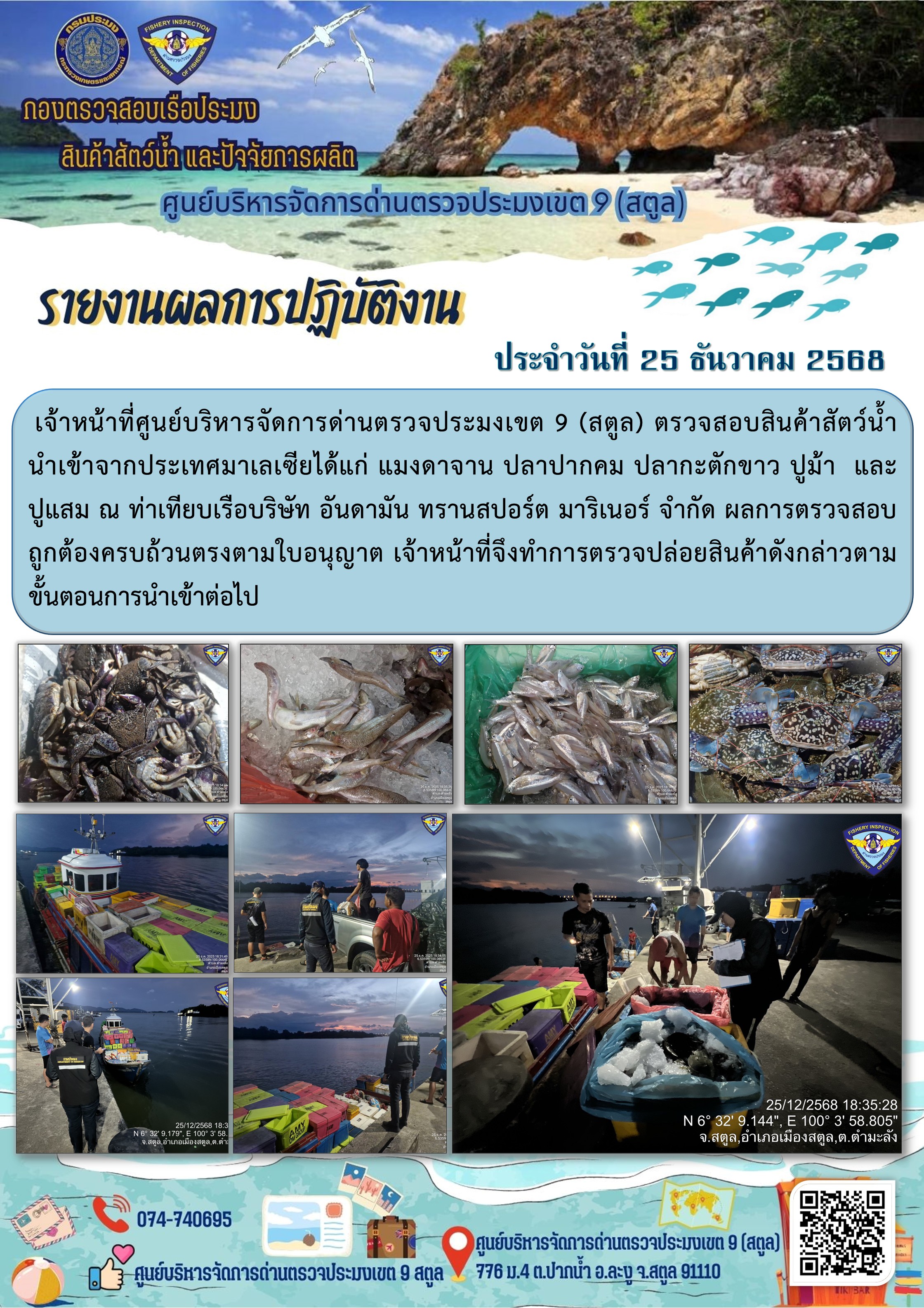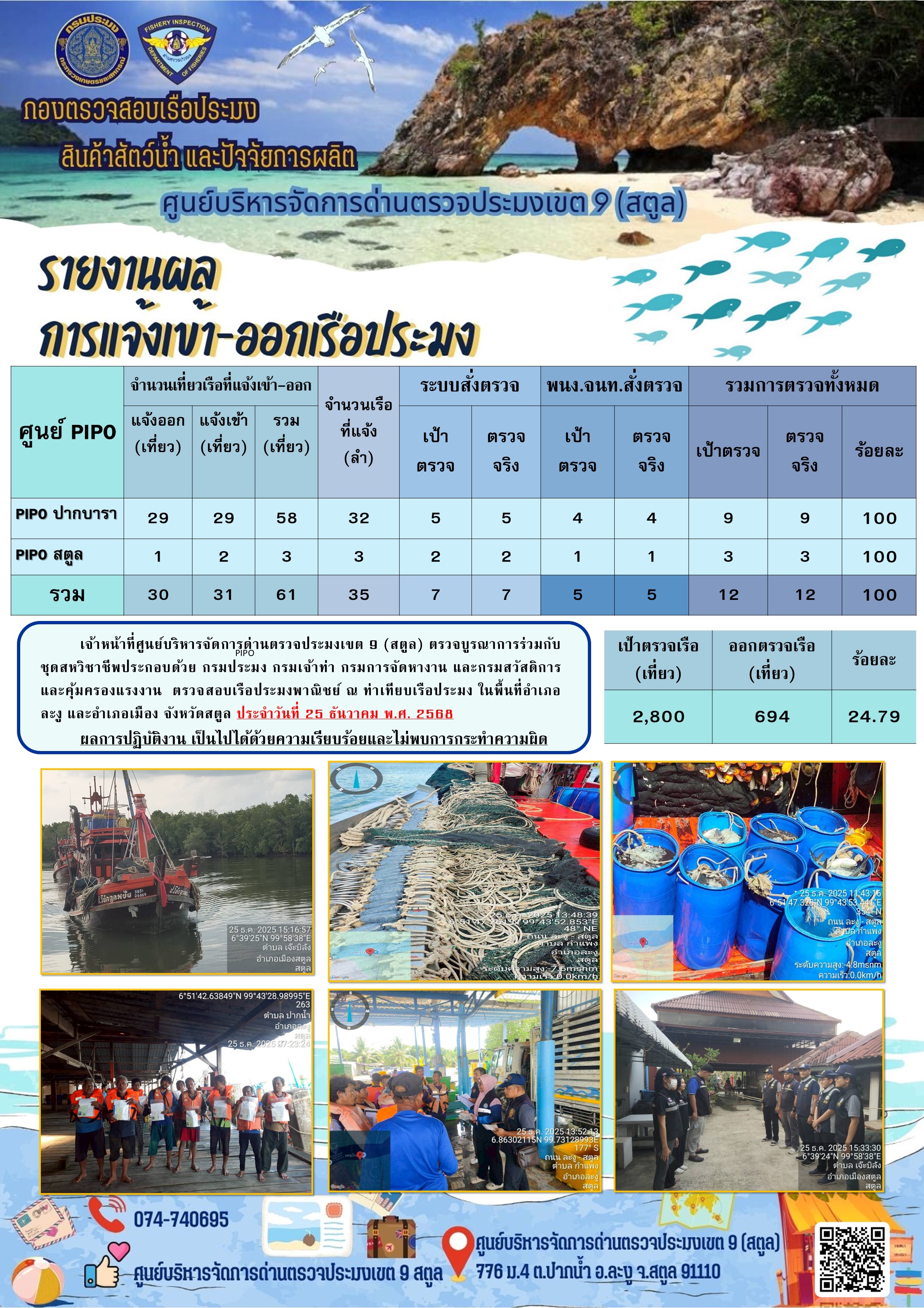 ประชาสัมพันธ์การปฏิบัติงานศูนย์บริหารจัดการด่านตรวจประมงเขต 9 (สตูล) ประจำวันที่ 21-25 ธันวาคม 2568
