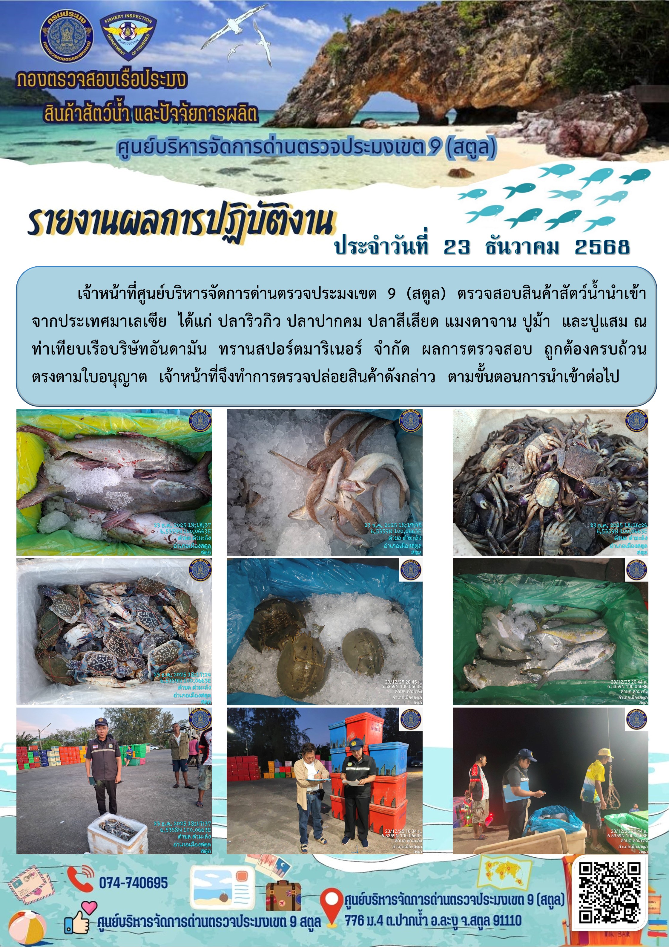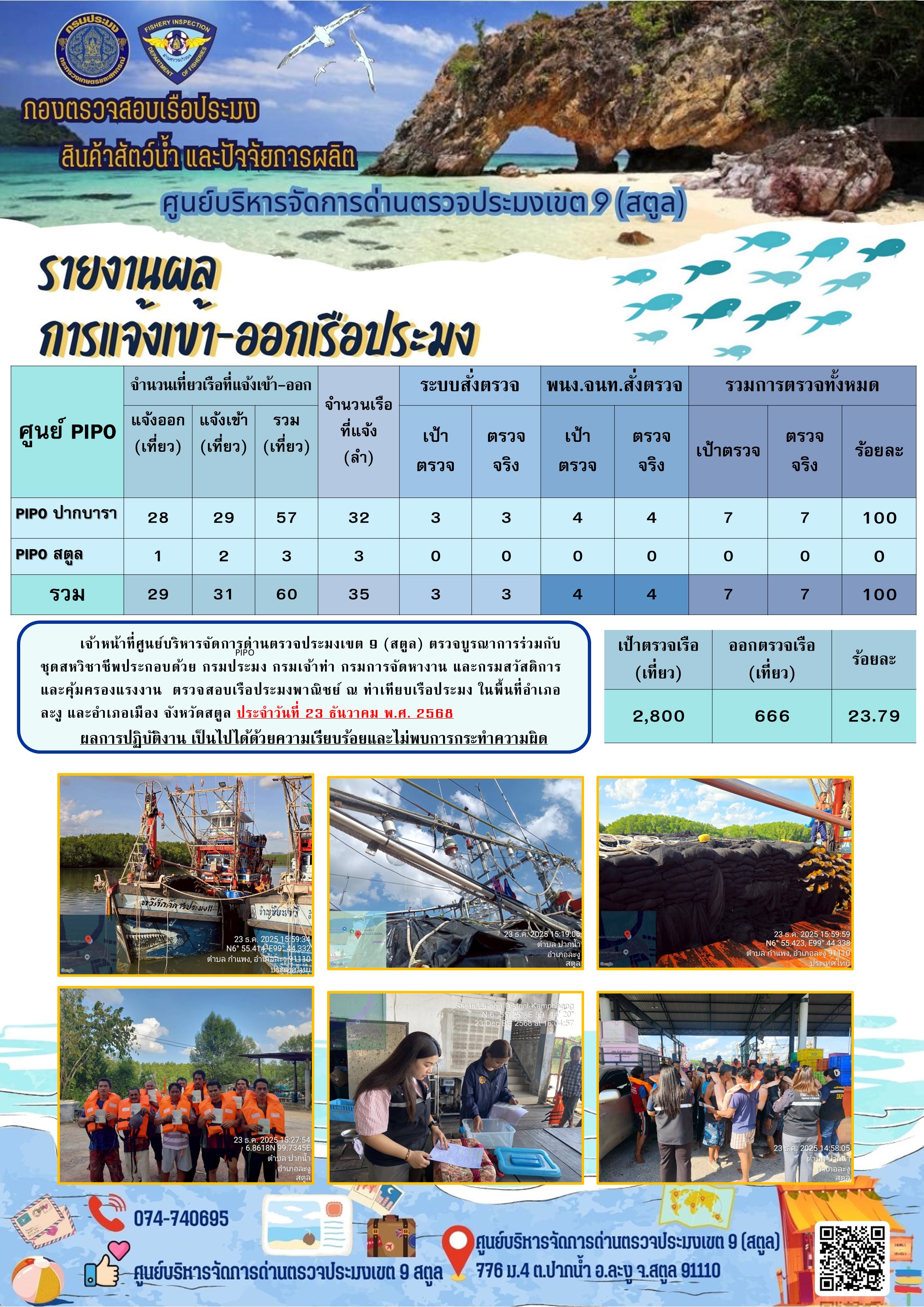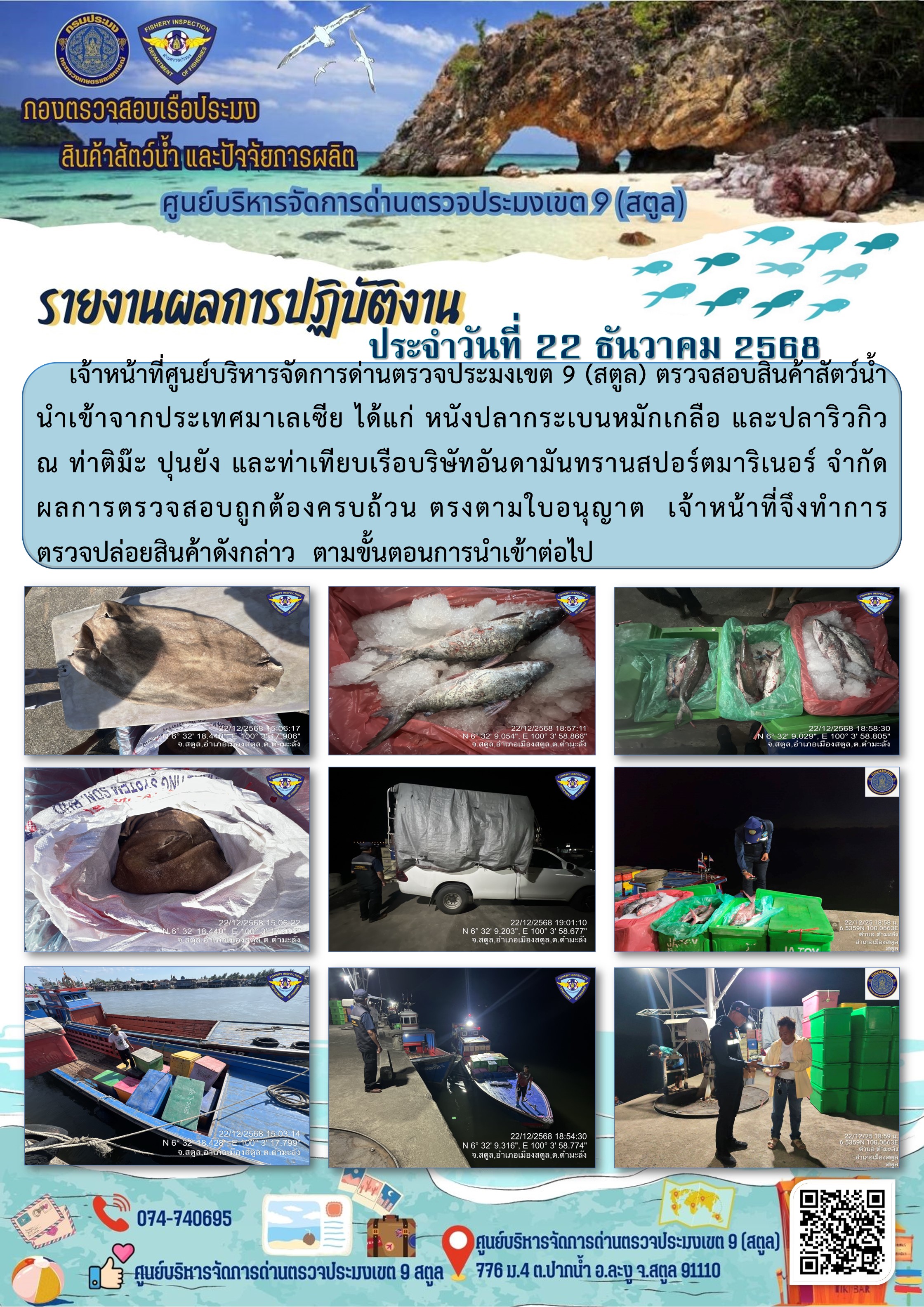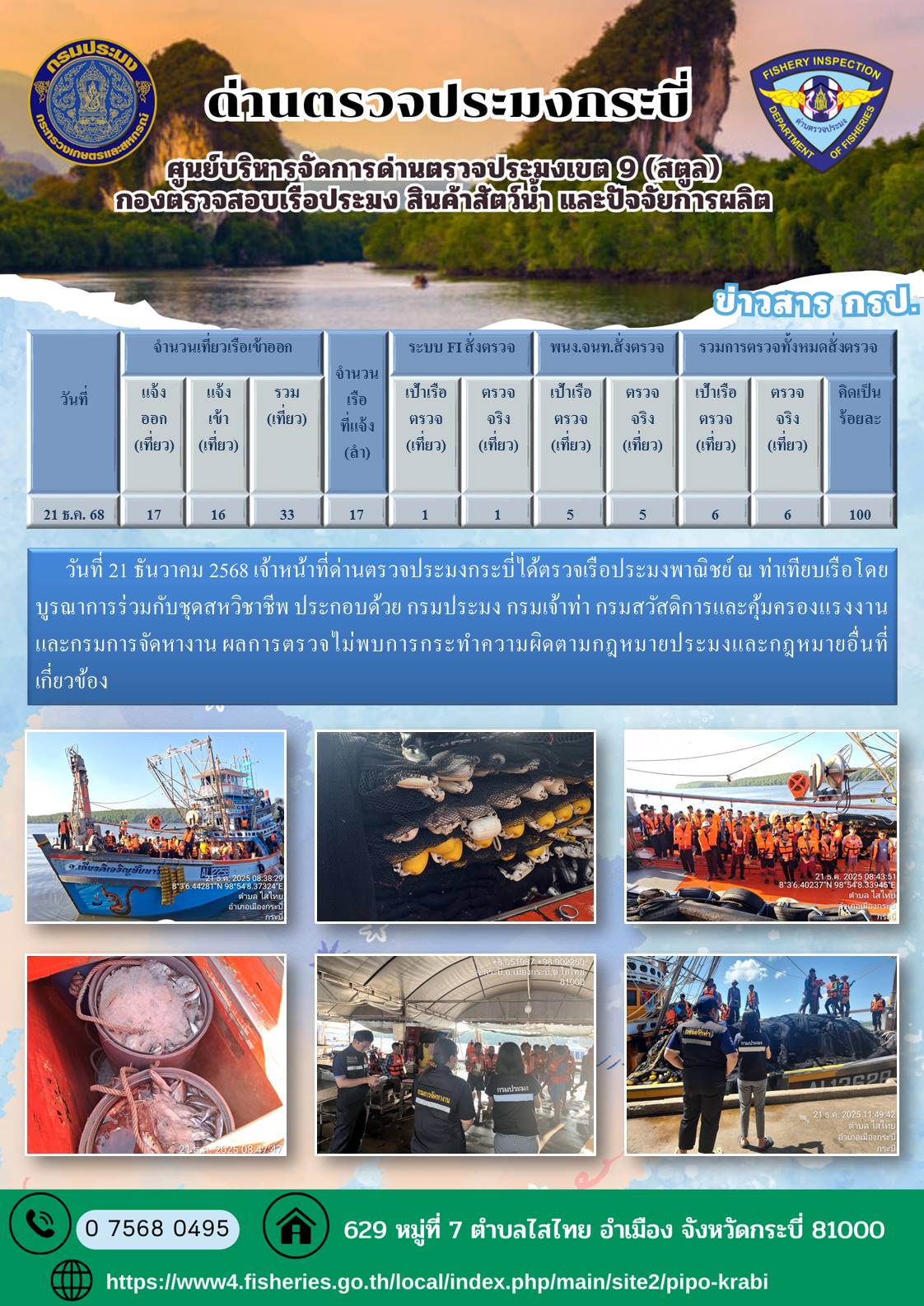ประชาสัมพันธ์การปฏิบัติงานศูนย์บริหารจัดการด่านตรวจประมงเขต 9 (สตูล) ประจำวันที่ 21-25 ธันวาคม 2568