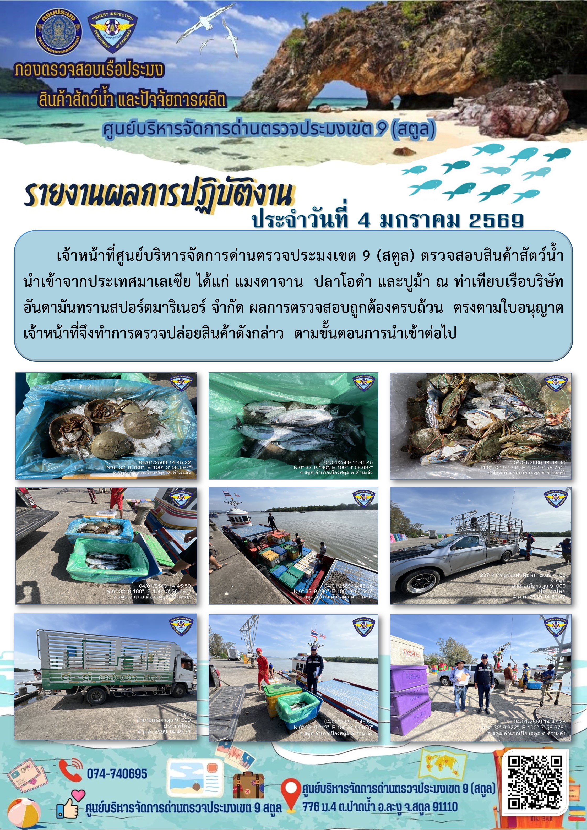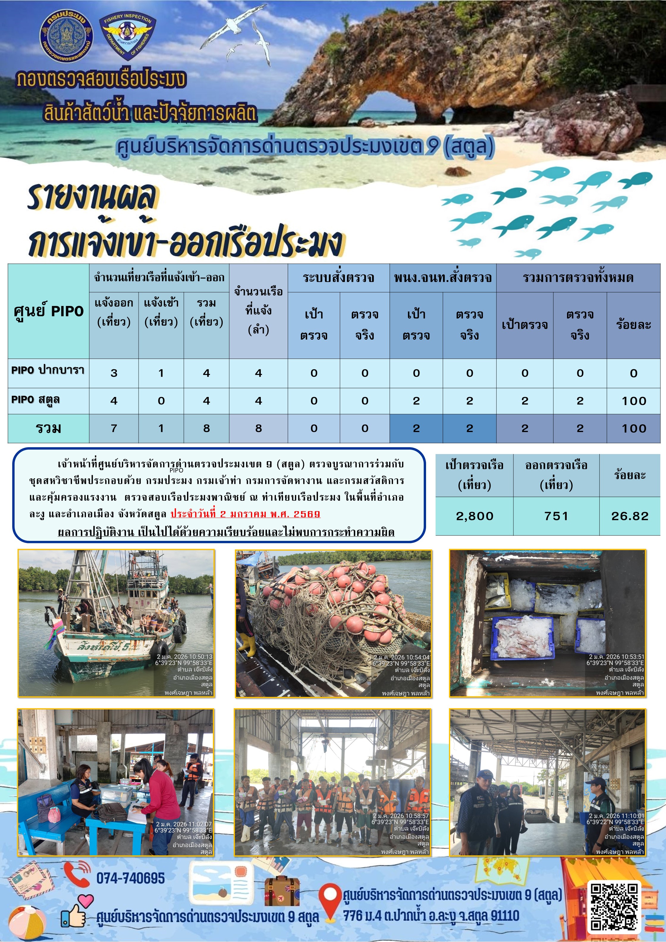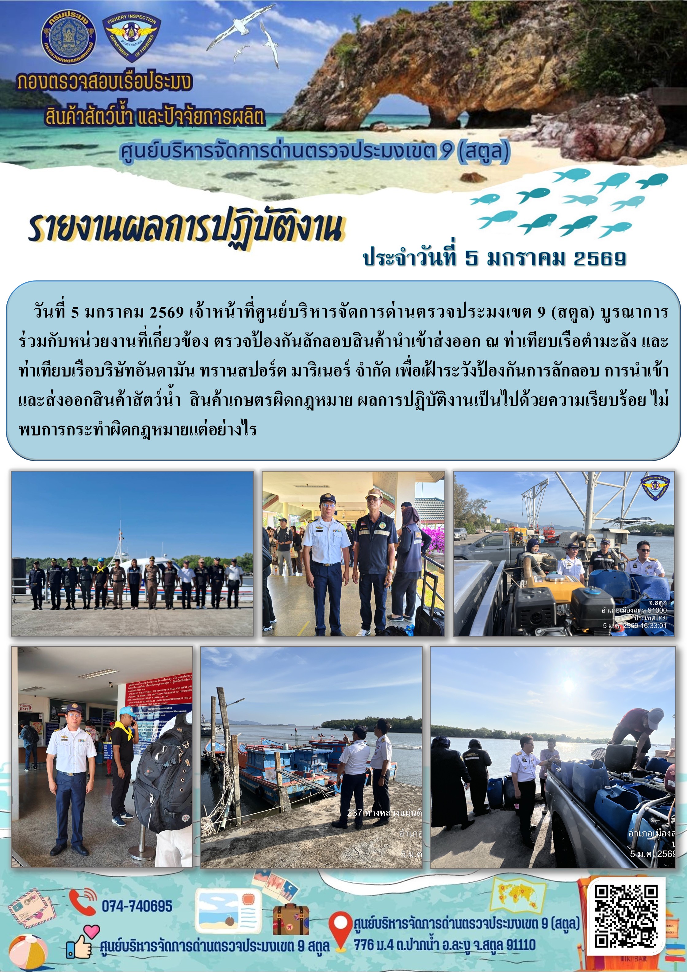 ประชาสัมพันธ์การปฏิบัติงานศูนย์บริหารจัดการด่านตรวจประมงเขต 9 (สตูล) ประจำวันที่ 1 - 5 มกราคม 2569