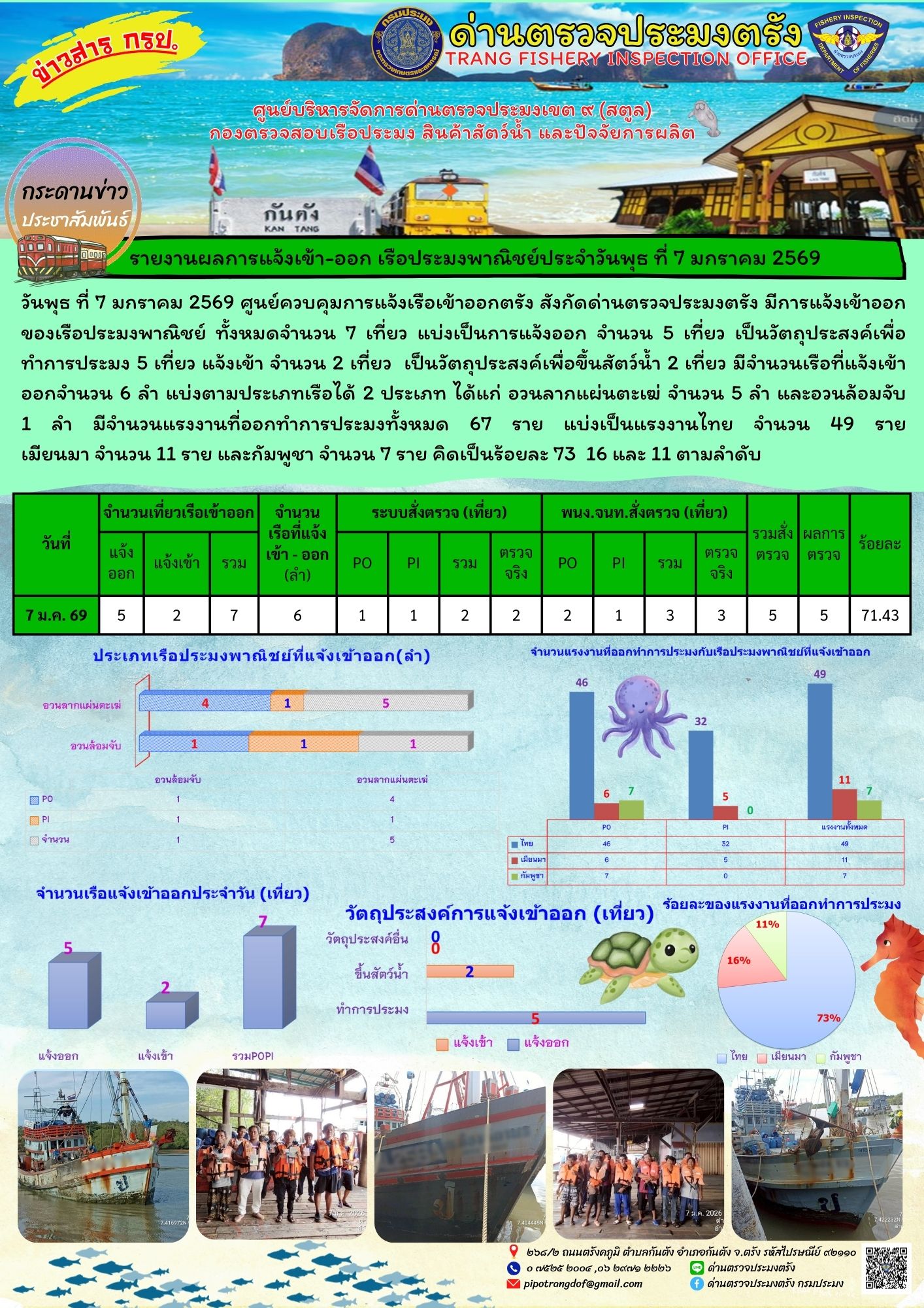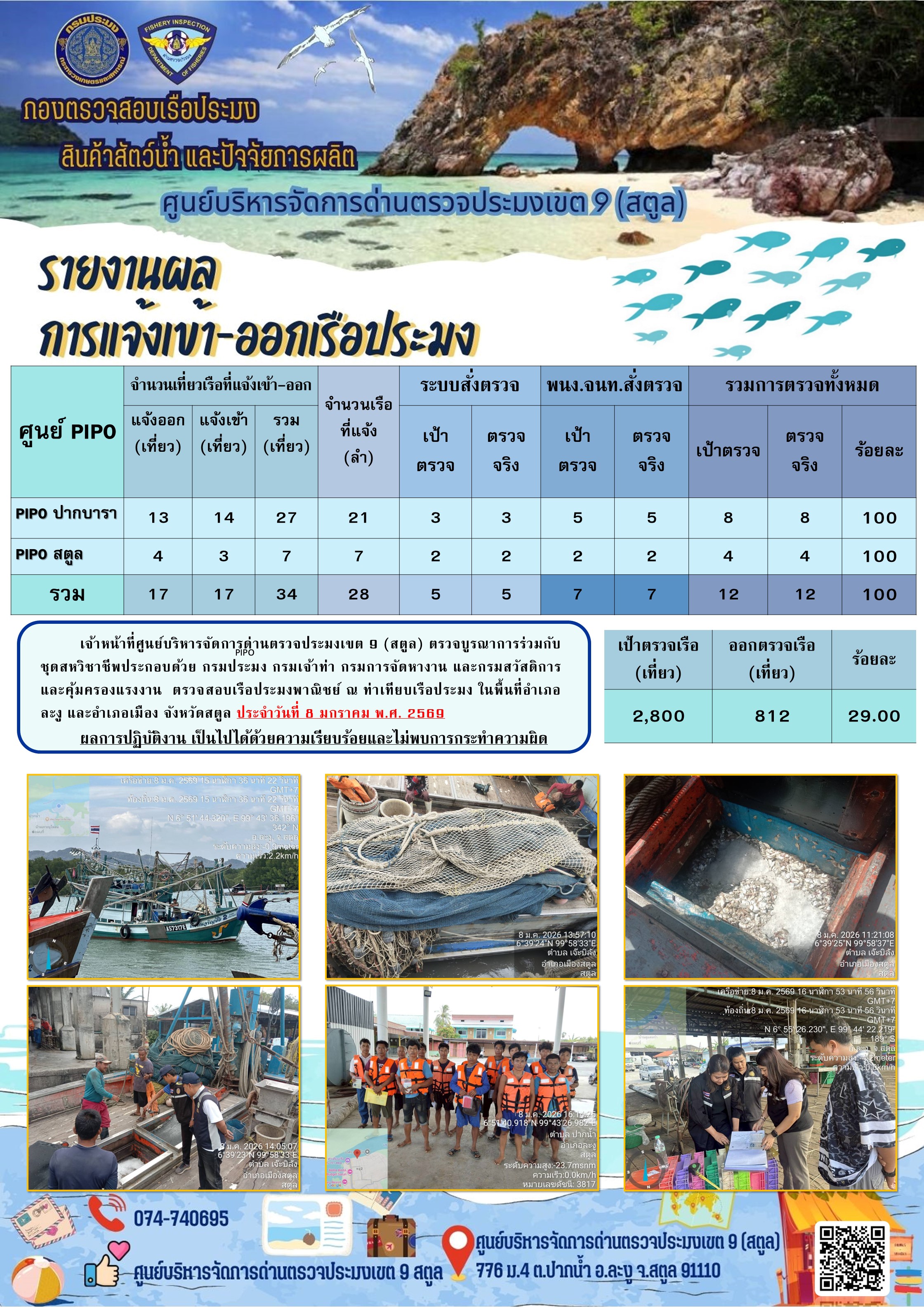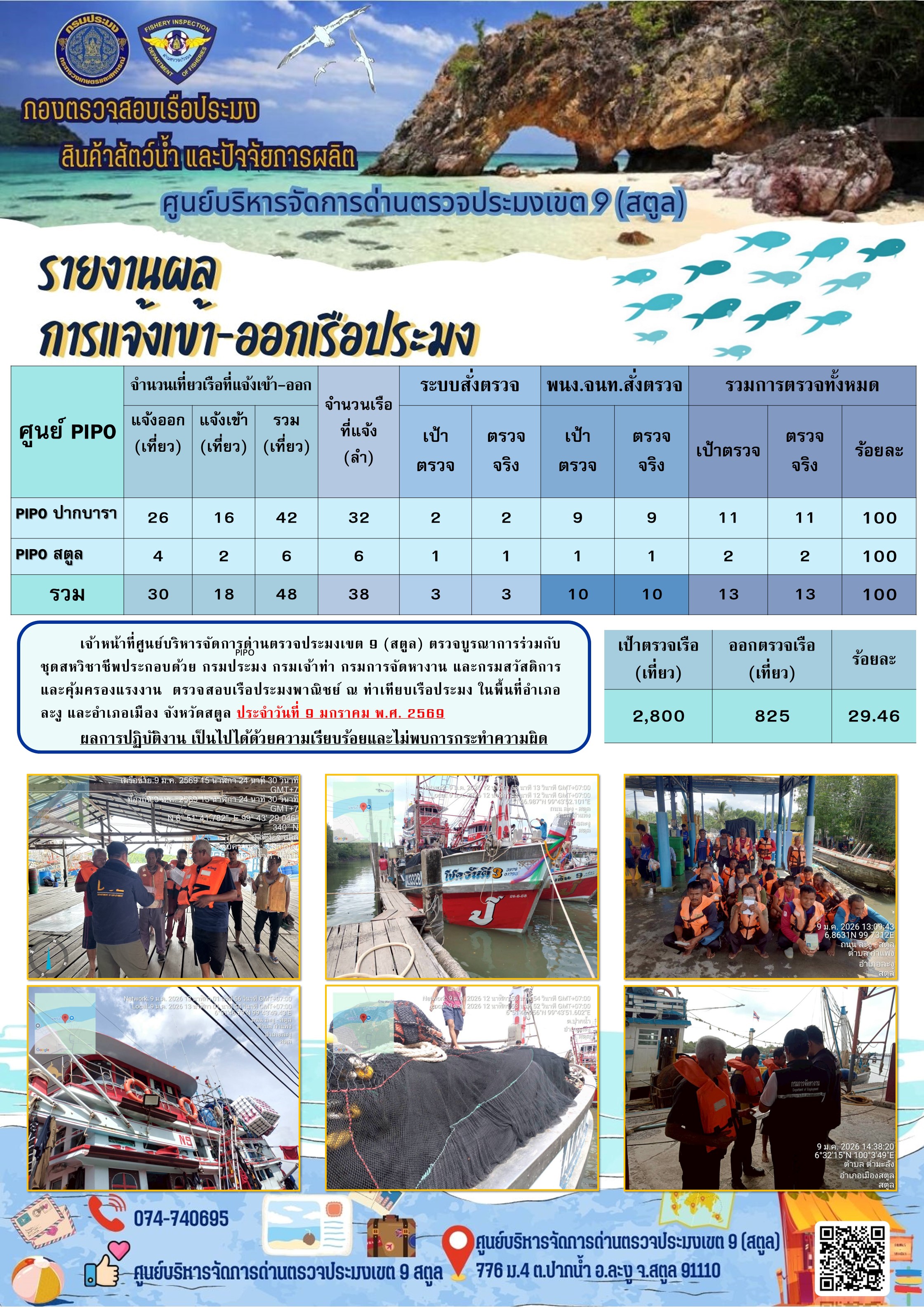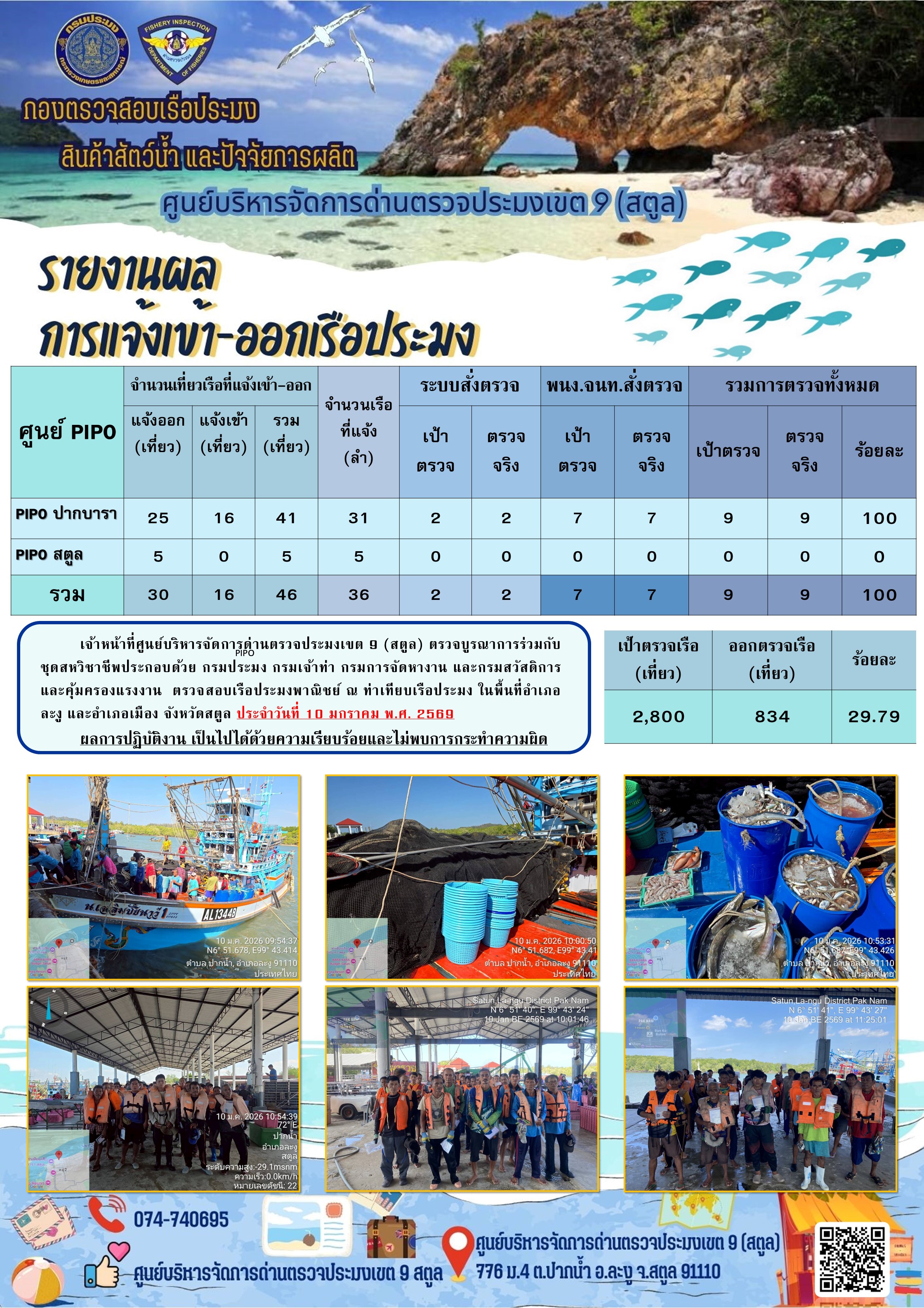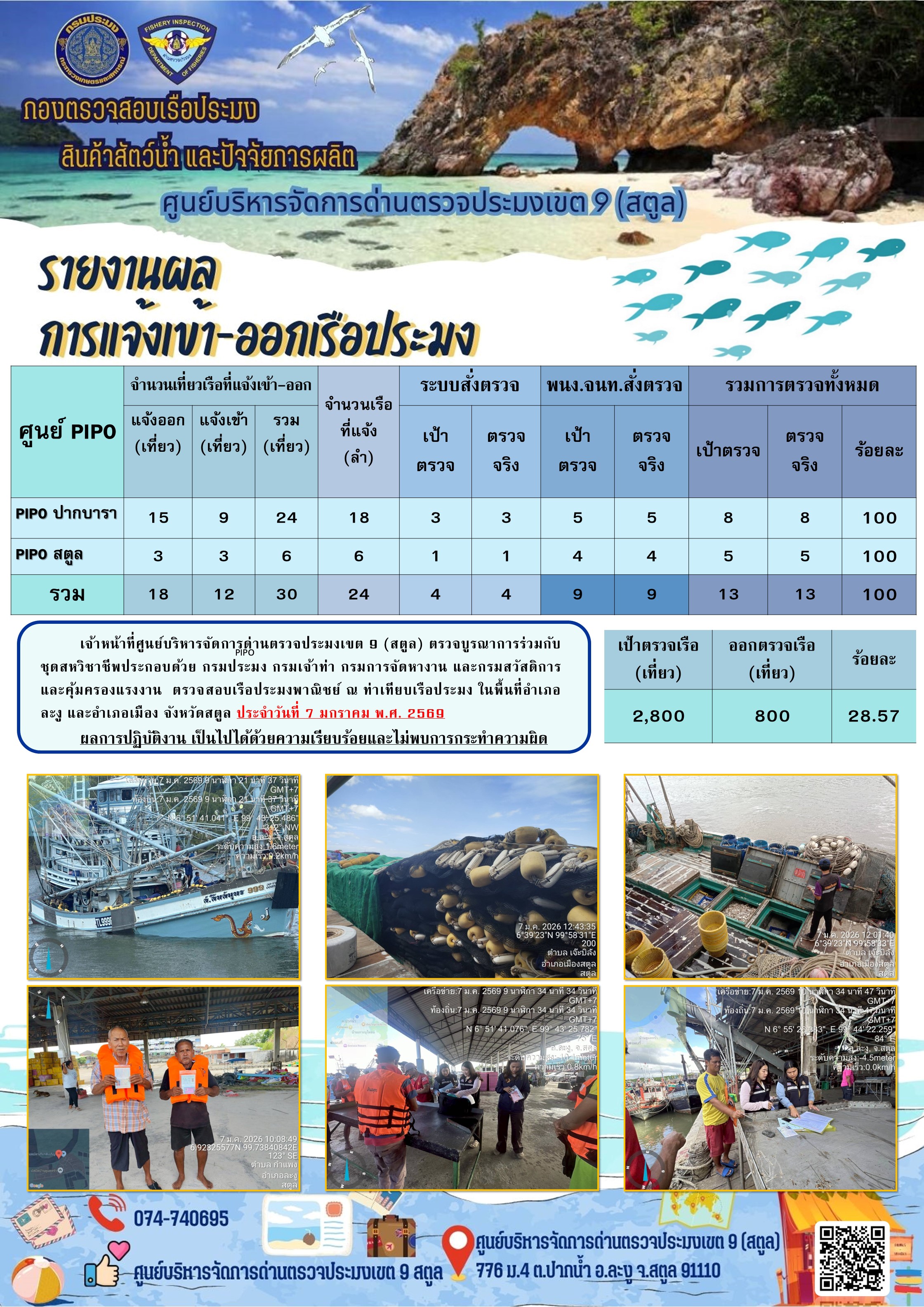 ประชาสัมพันธ์การปฏิบัติงานศูนย์บริหารจัดการด่านตรวจประมงเขต 9 (สตูล) ประจำวันที่ 6 - 10 มกราคม 2569