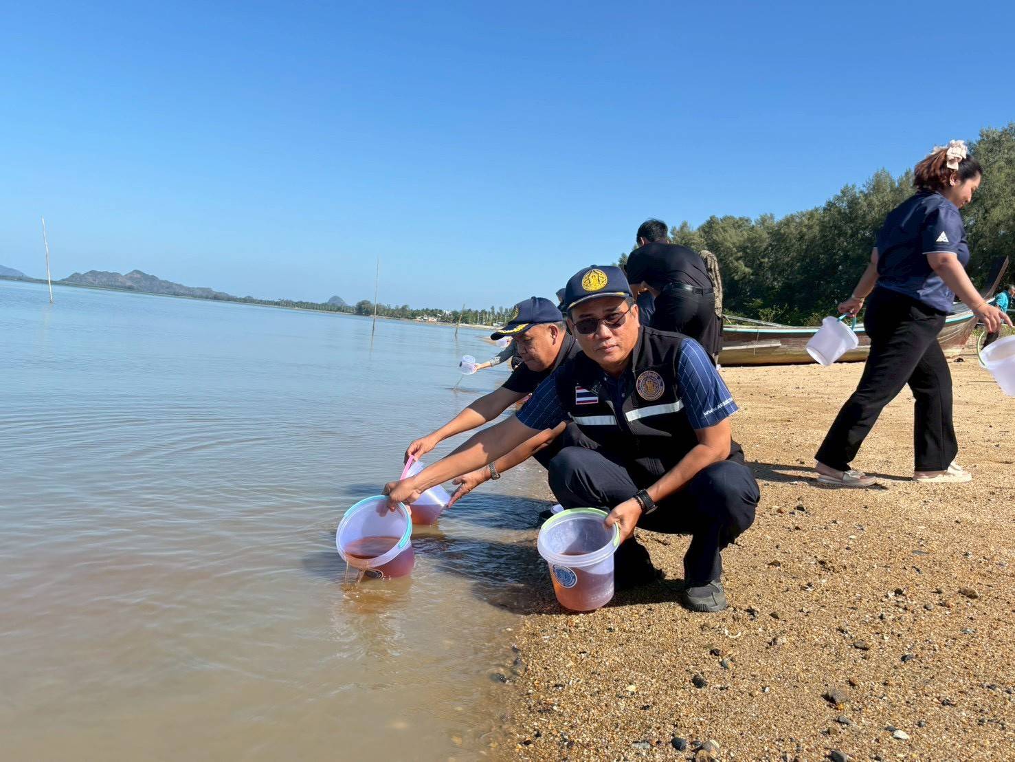 วันที่ 3 กุมภาพันธ์ 2569 นายตะวัน คงสี ผู้อำนวยการศูนย์บริหารจัดการด่านตรวจประมงเขต 9 (สตูล) พร้อมเจ้าหน้าที่ศูนย์ฯ เข้าร่วมโครงการหนึ่งความดี ล้านความรัก ภูมิใจภักดิ์พระพันปีหลวง เพื่อเป็นการสำนึกในพระมหากรุณาธิคุณ สมเด็จพระนางเจ้าสิริกิติ์ พระบรมราชินีนาถ พระบรมราชชนนีพันปีหลวง โดยการปล่อยพันธุ์สัตว์น้ำ กุ้งแชบ๊วย จำนวน 5,000,000 ตัว เพื่อเพิ่มจำนวนสัตว์น้ำในแหล่งน้ำธรรมชาติ และส่งเสริมการมีส่วนร่วมของประชาชนในการอนุรักษ์ทรัพยากรธรรมชาติ พร้อมเจ้าหน้าที่ภายใต้สังกัดกรมประมง เข้าร่วมกิจกรรม ณ บ้านหัวหิน ตำบลละงู อำเภอละงู จังหวัดสตูล