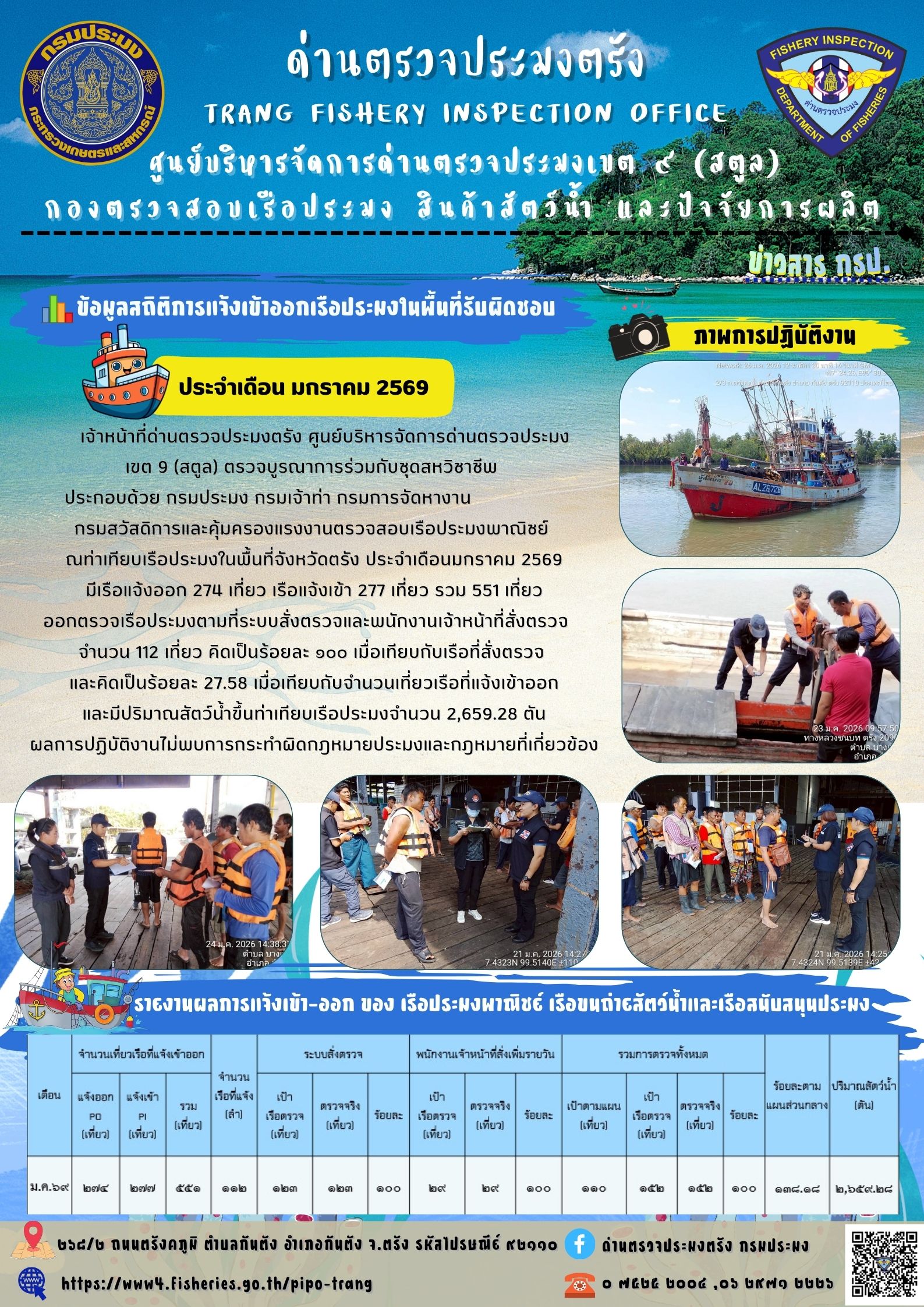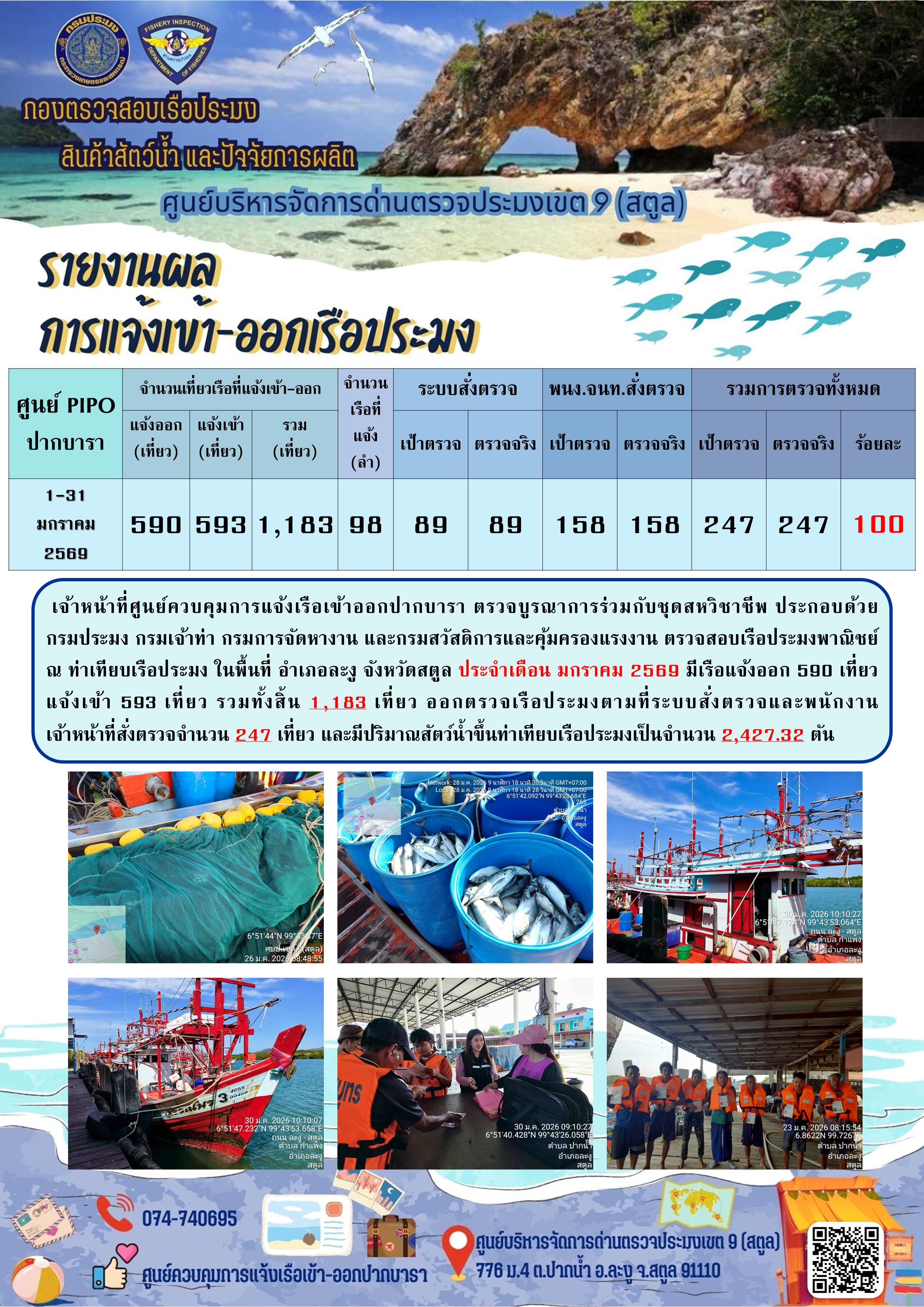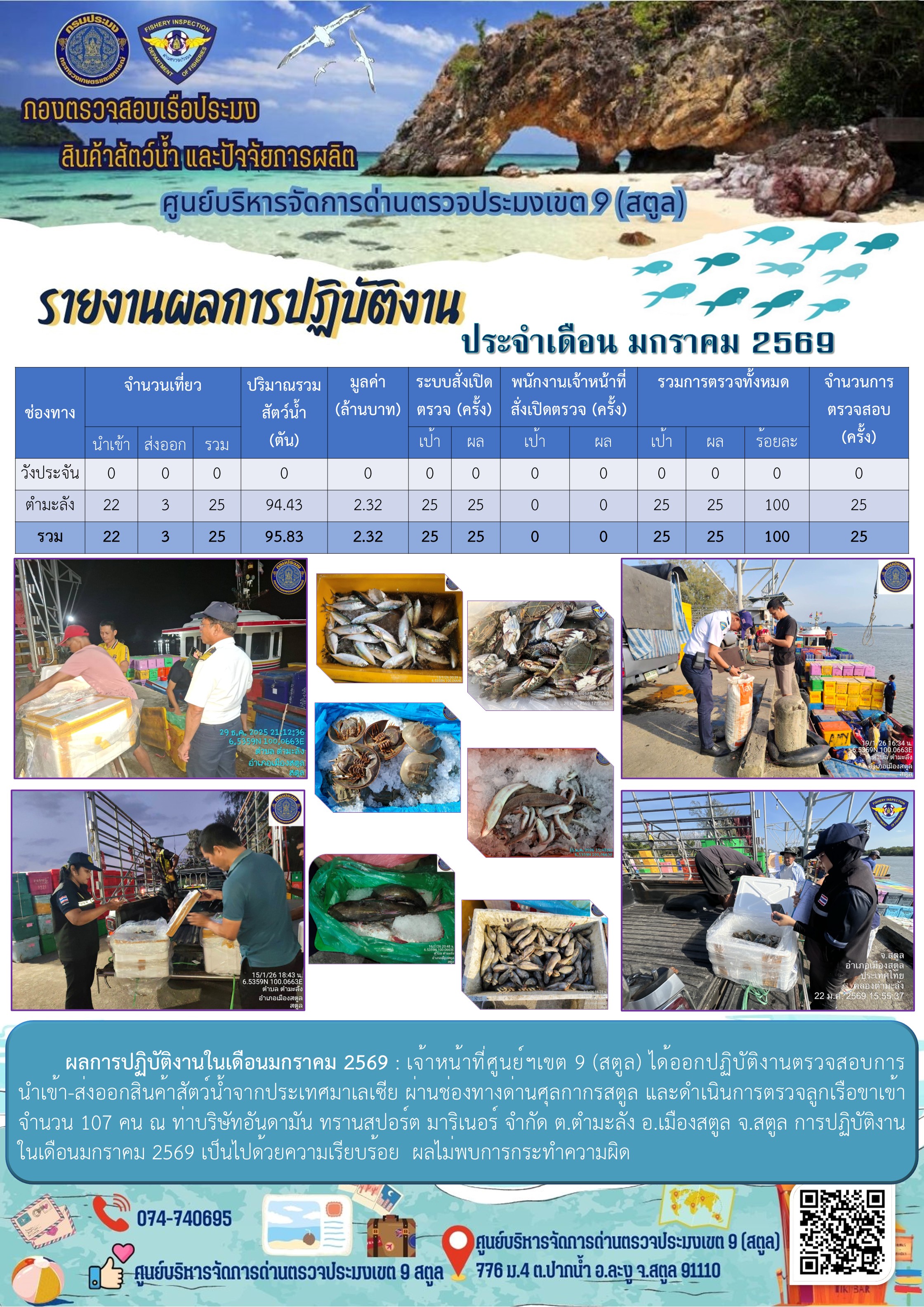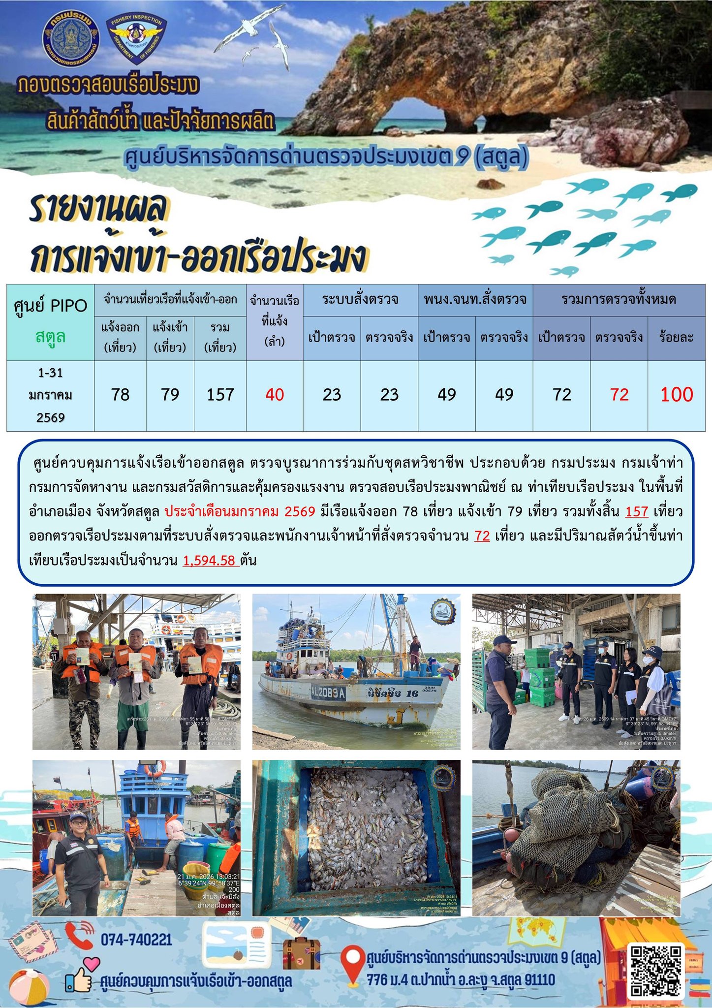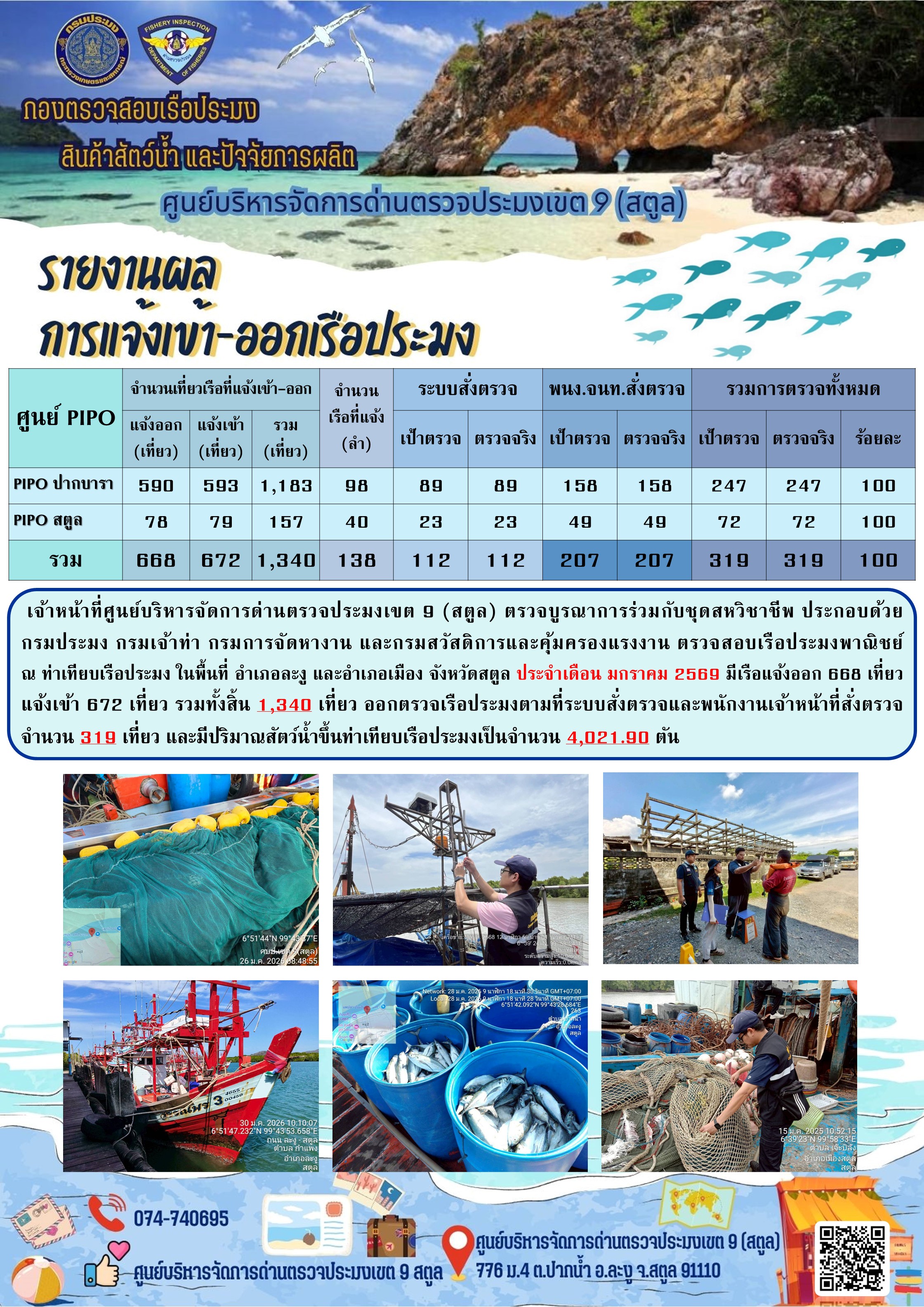 ผลการปฏิบัติงาน ประจำเดือน มกราคม 2569 การตรวจสอบเรือประมงไทยที่แจ้งเข้าออก และการตรวจสอบการนำเข้า-ส่งออกสินค้าสัตว์น้ำ ในเขตพื้นที่รับผิดชอบของศูนย์บริหารจัดการด่านตรวจประมงเขต 9 (สตูล)
