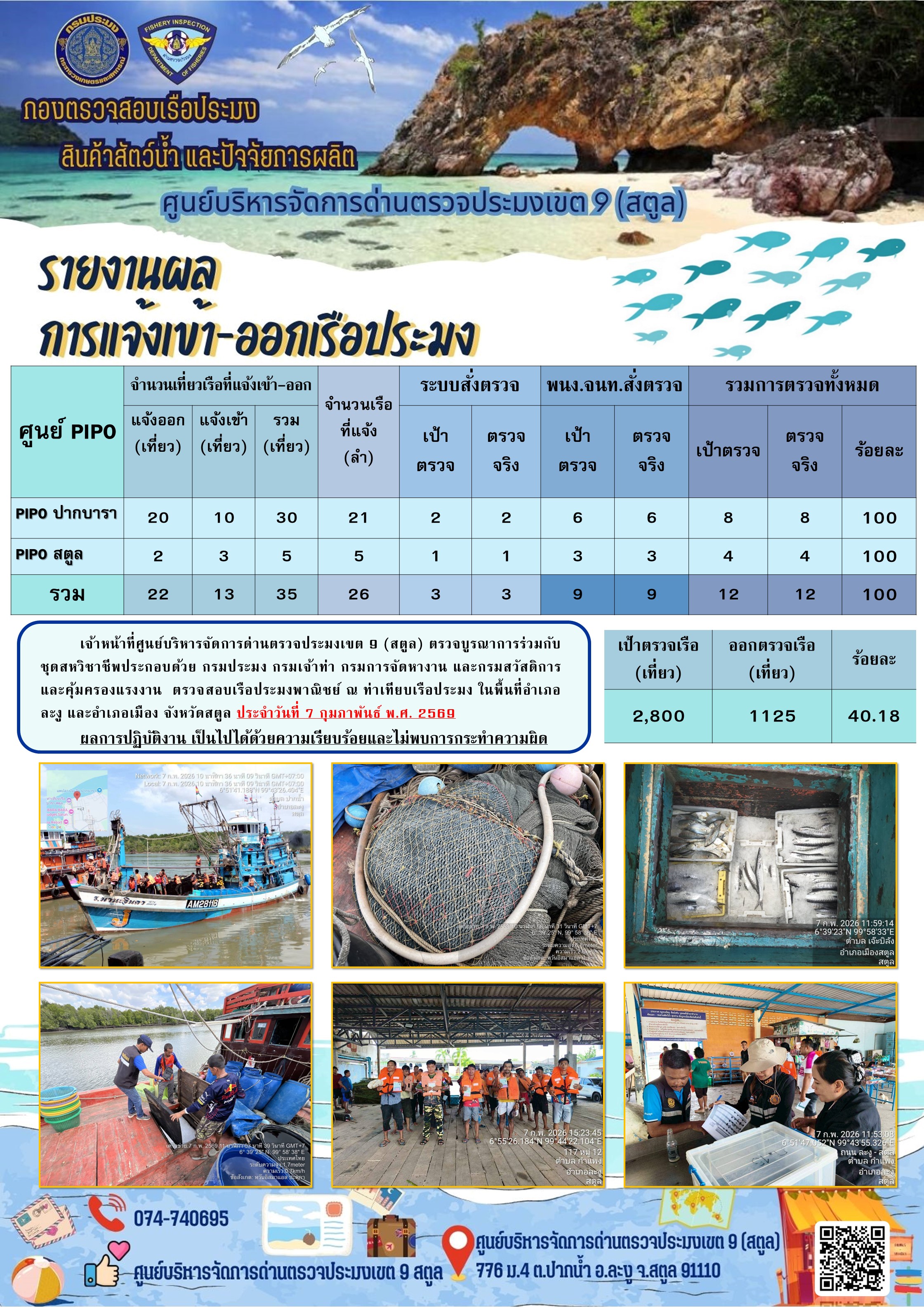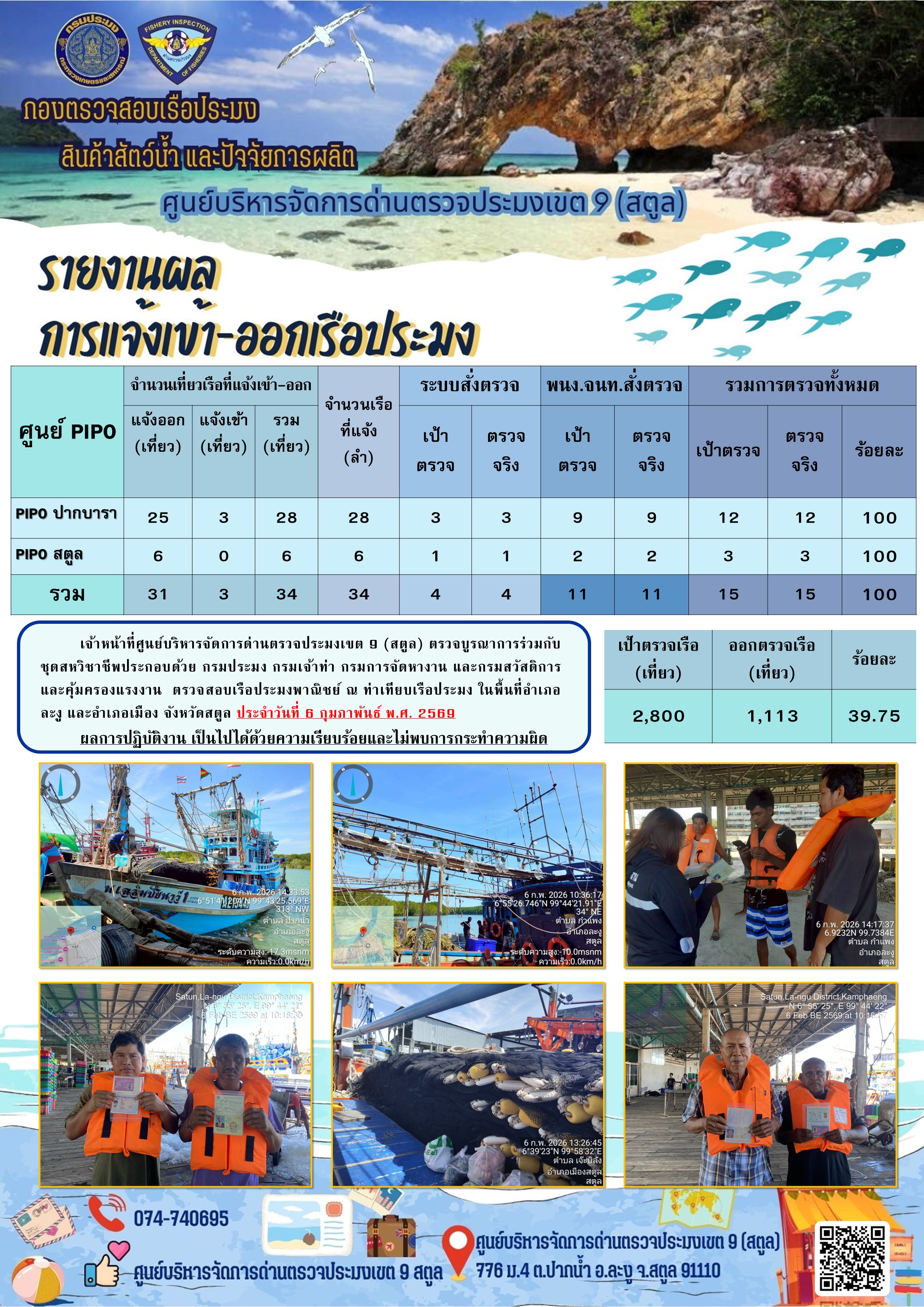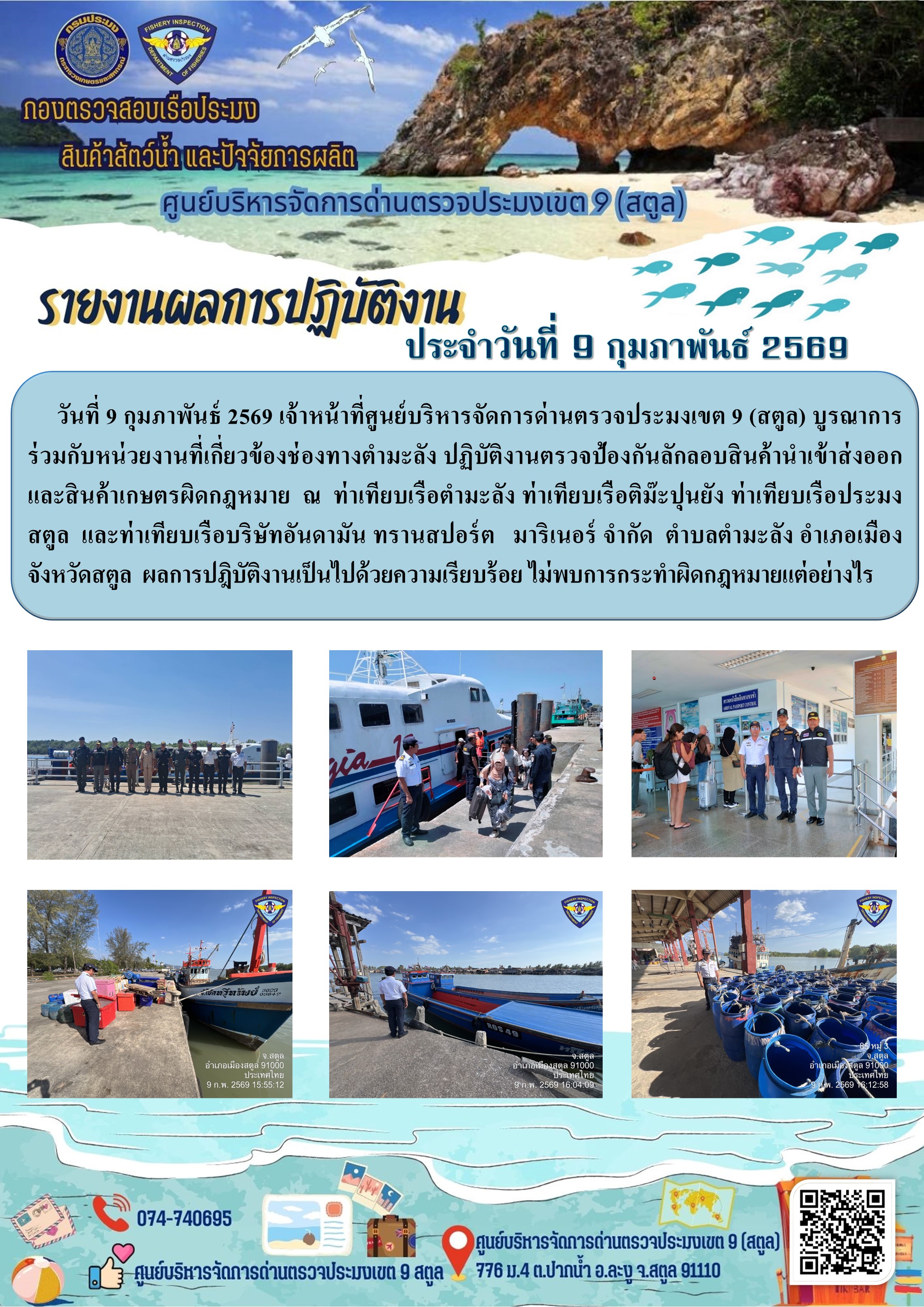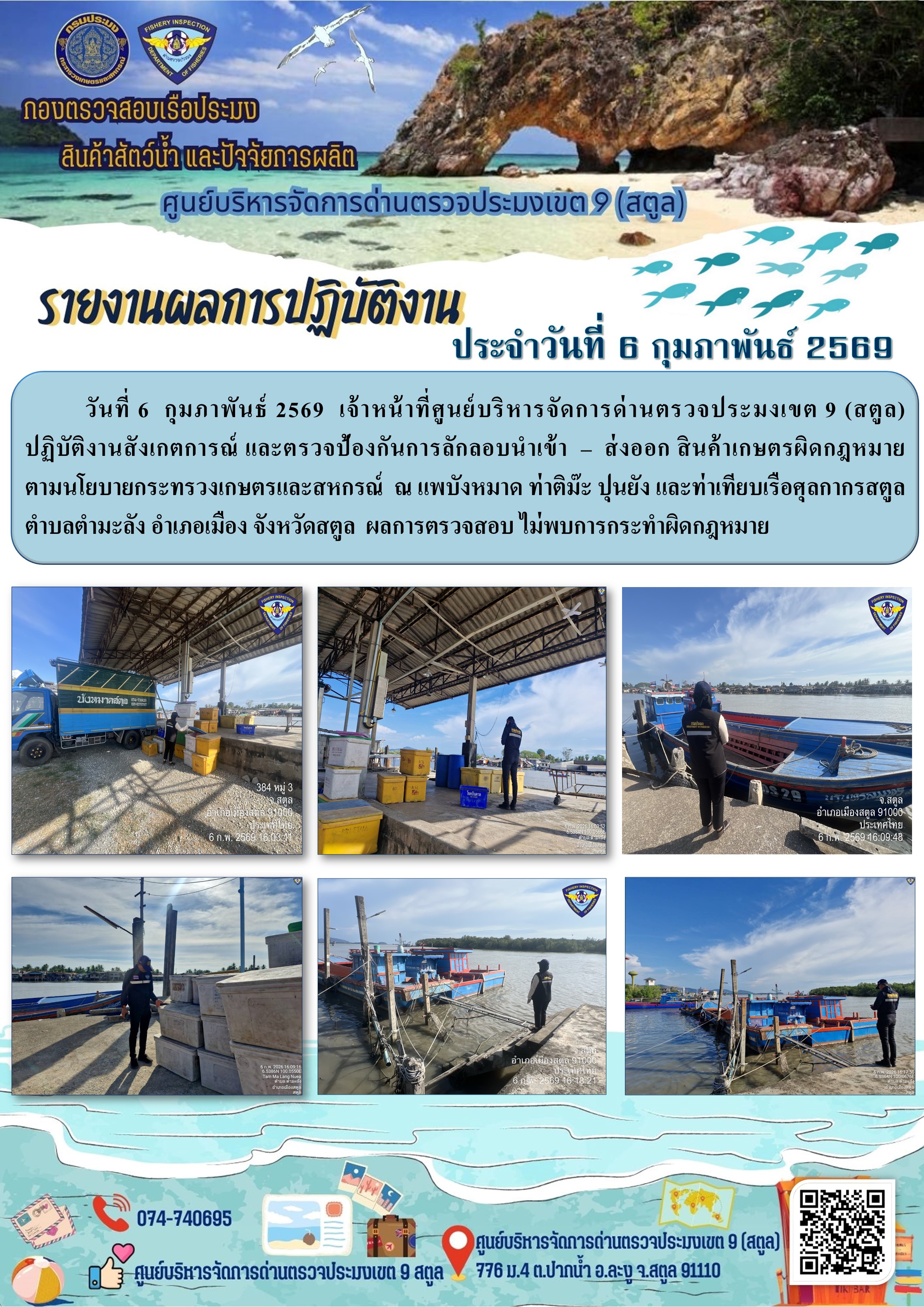 ประชาสัมพันธ์การปฏิบัติงานศูนย์บริหารจัดการด่านตรวจประมงเขต 9 (สตูล) ประจำวันที่ 6 - 10 กุมภาพันธ์ 2569