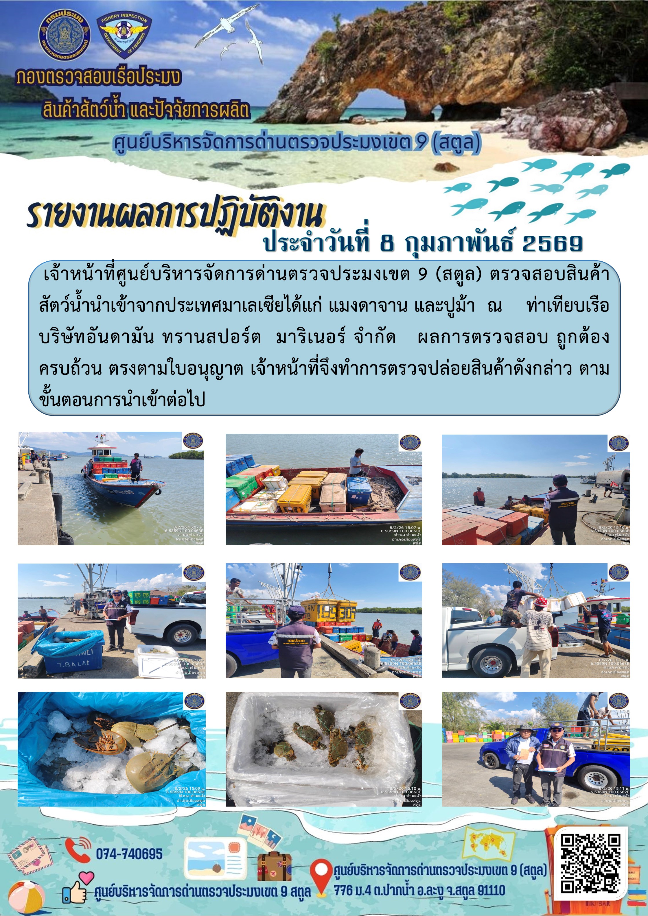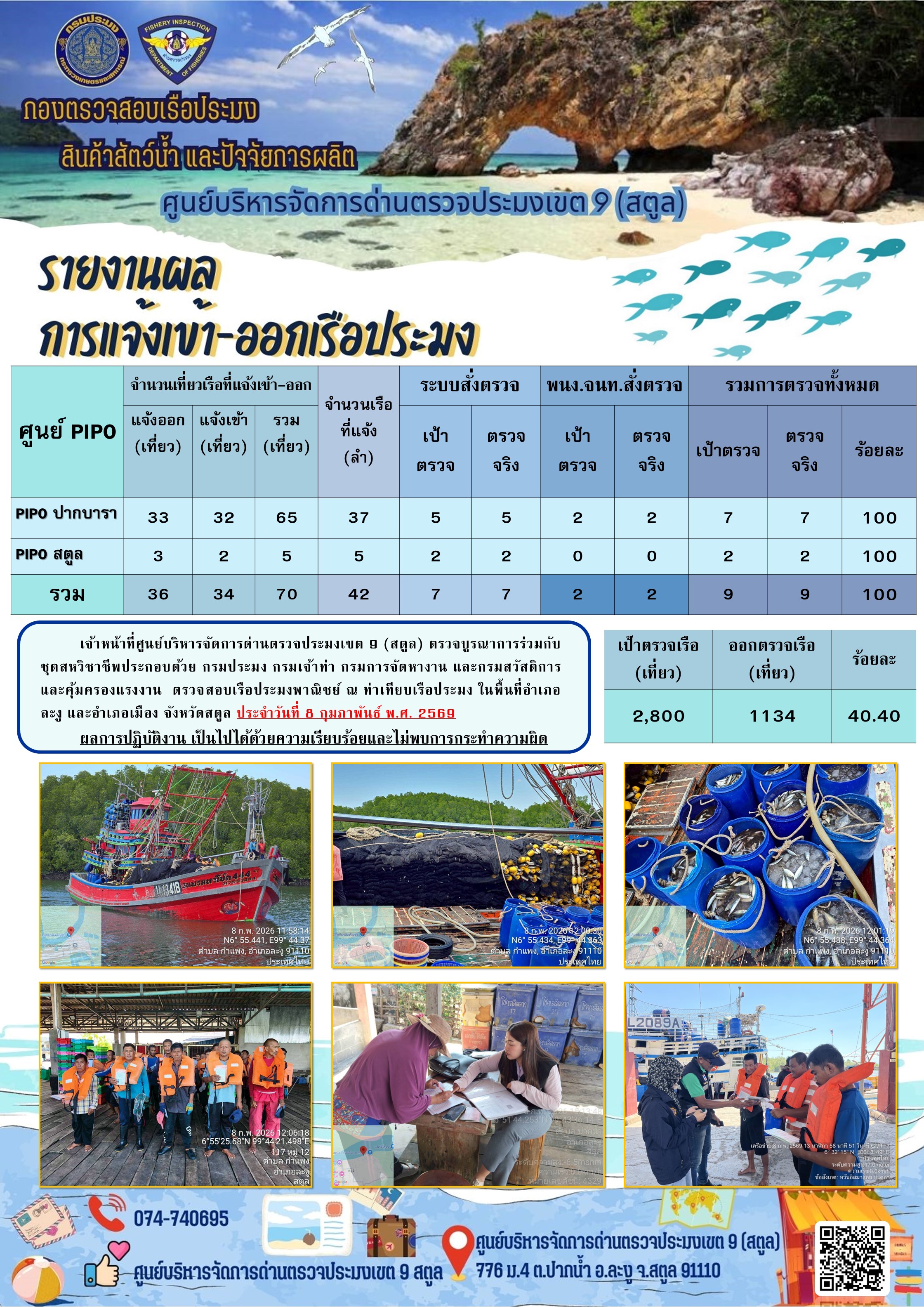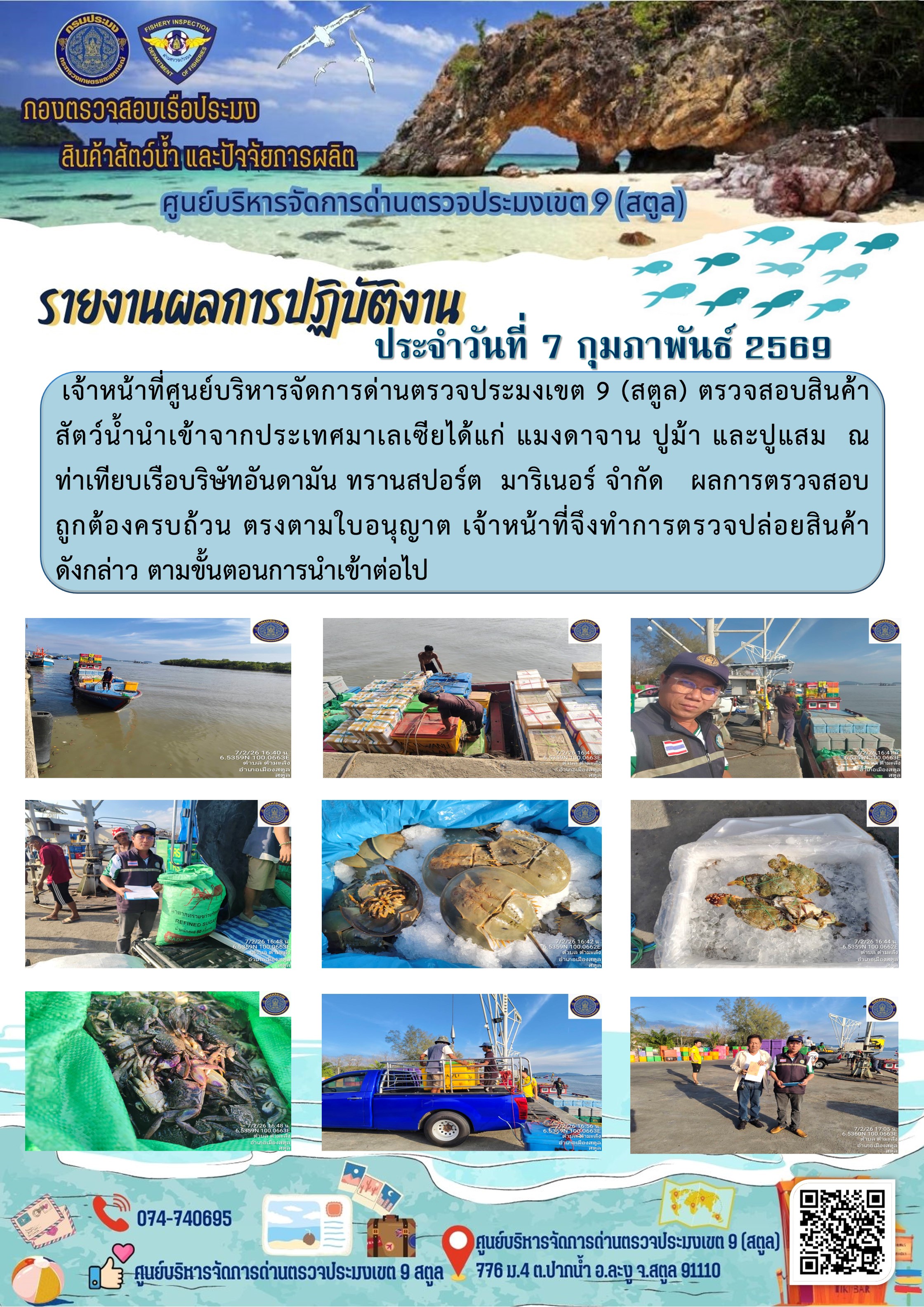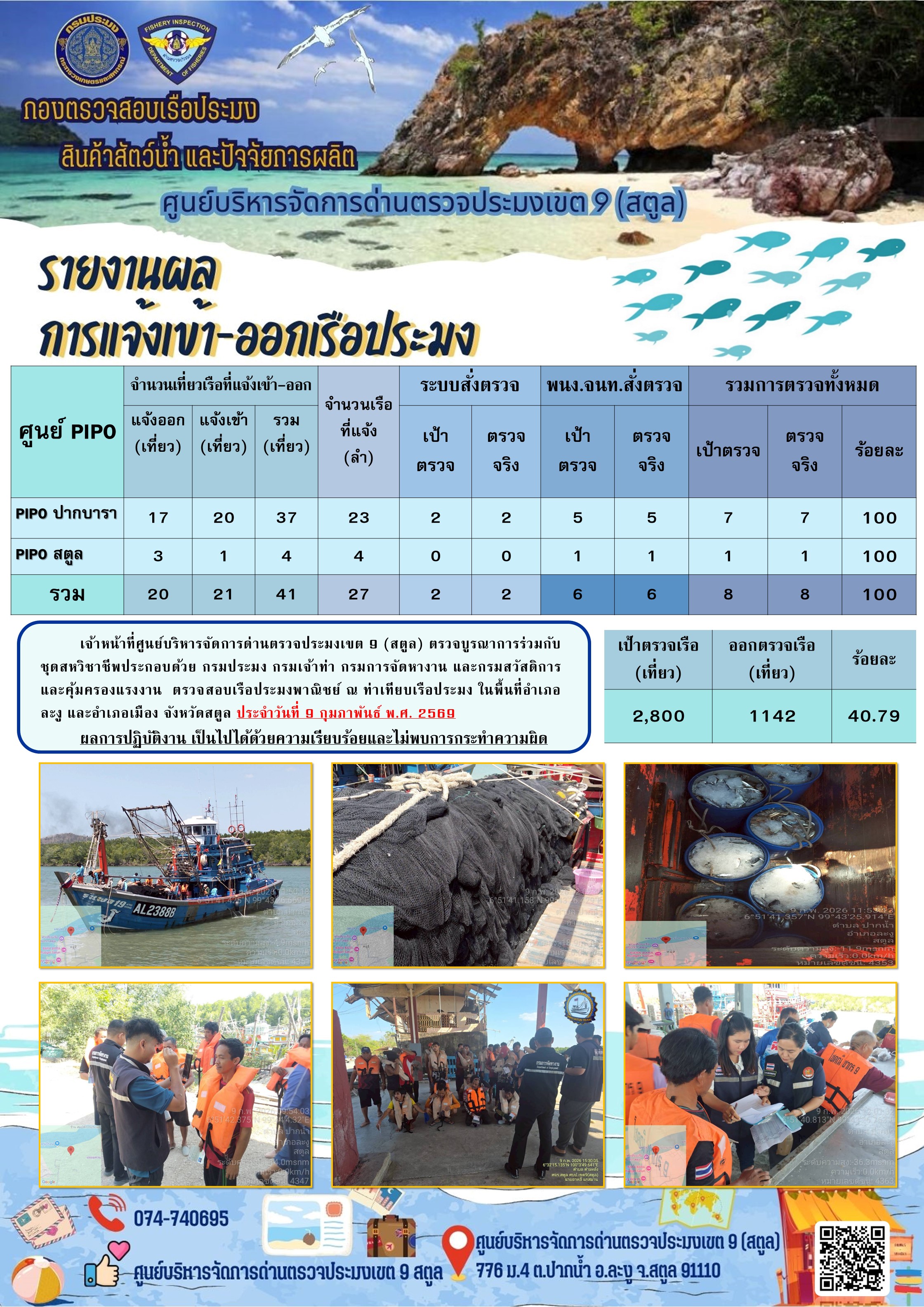 ประชาสัมพันธ์การปฏิบัติงานศูนย์บริหารจัดการด่านตรวจประมงเขต 9 (สตูล) ประจำวันที่ 6 - 10 กุมภาพันธ์ 2569
