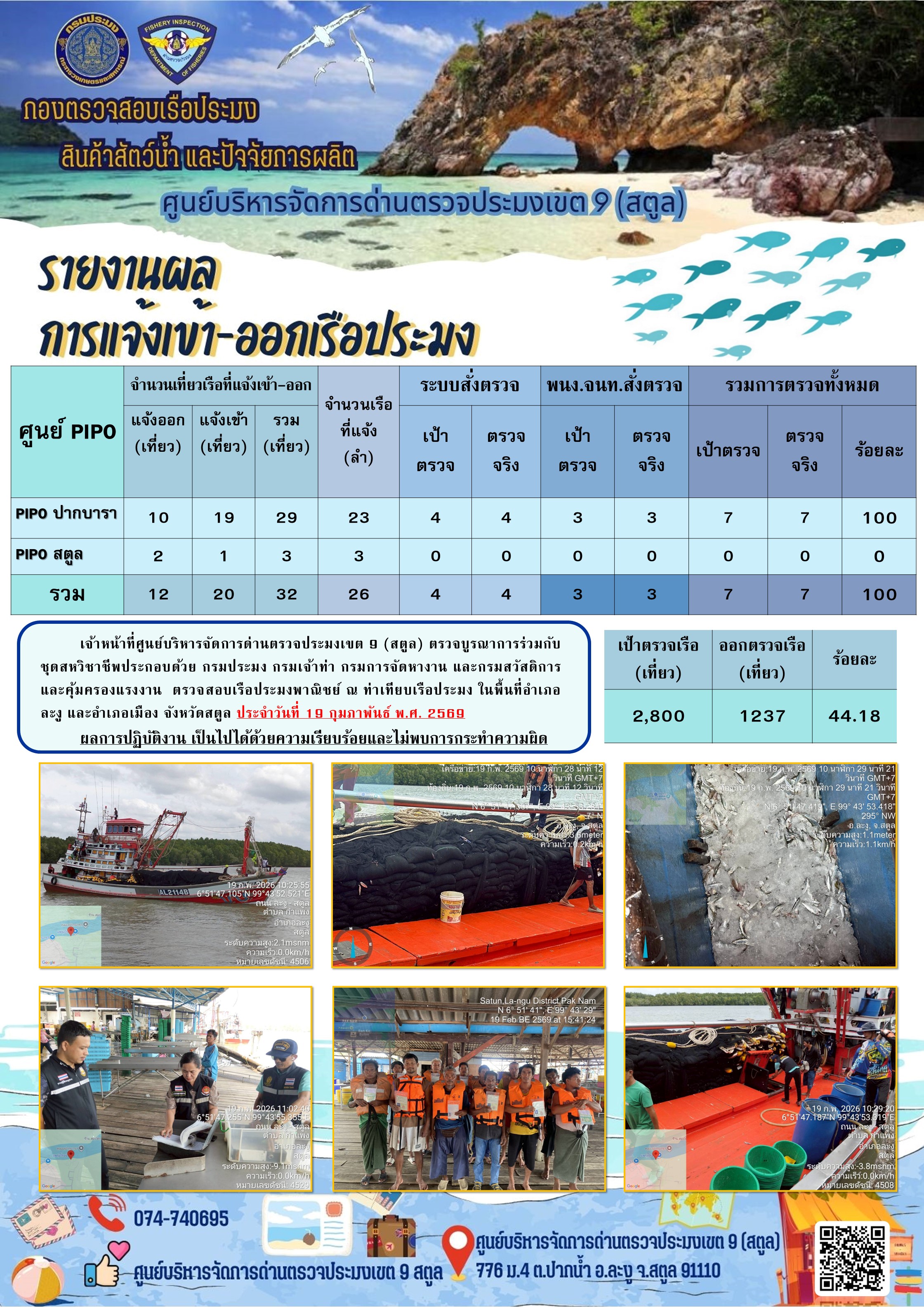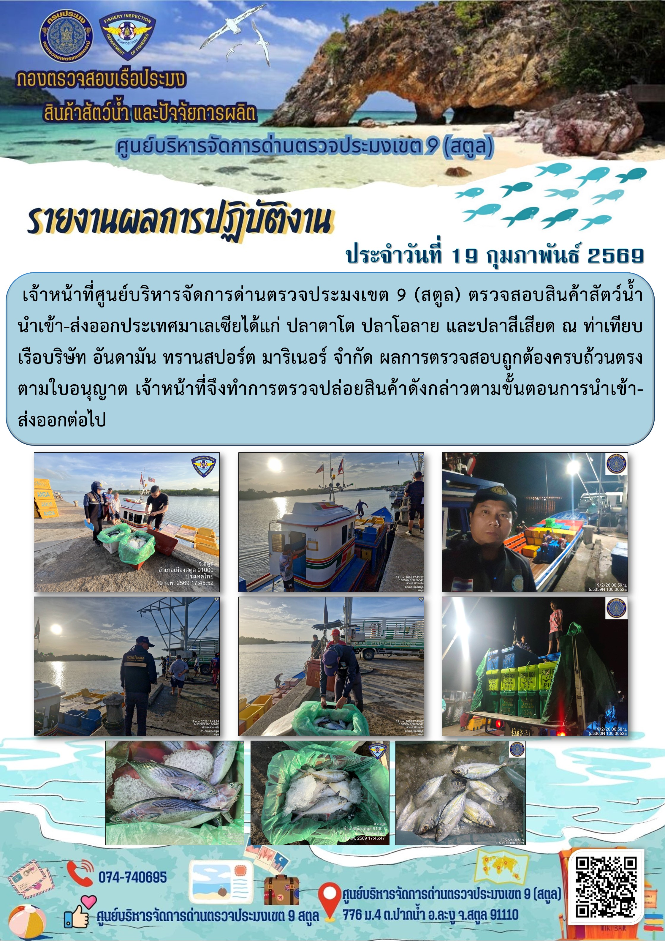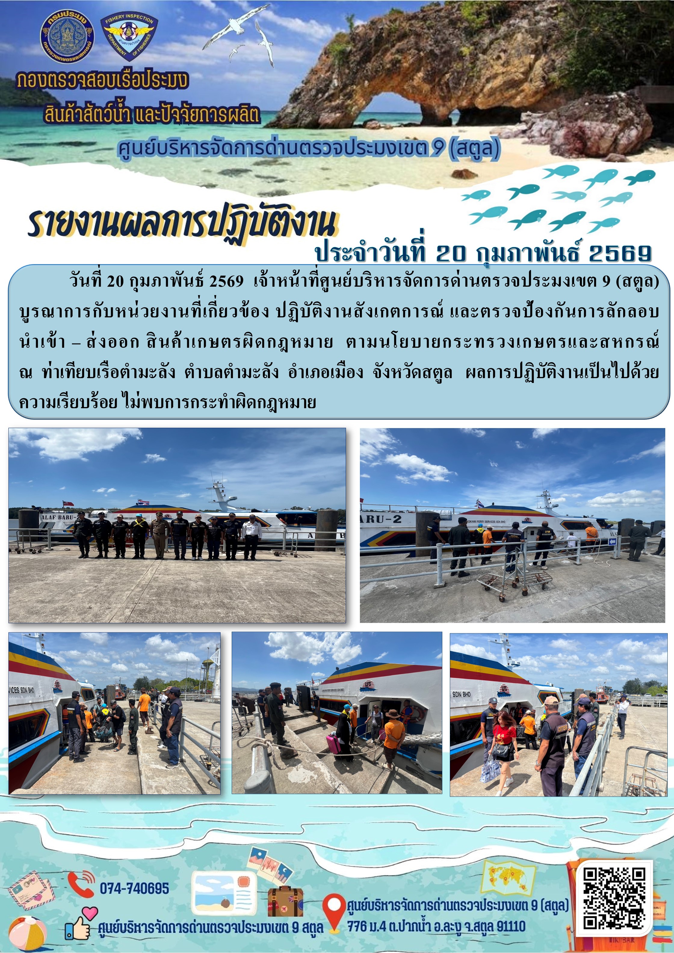 ประชาสัมพันธ์การปฏิบัติงานศูนย์บริหารจัดการด่านตรวจประมงเขต 9 (สตูล) ประจำวันที่ 16 - 20 กุมภาพันธ์ 2569