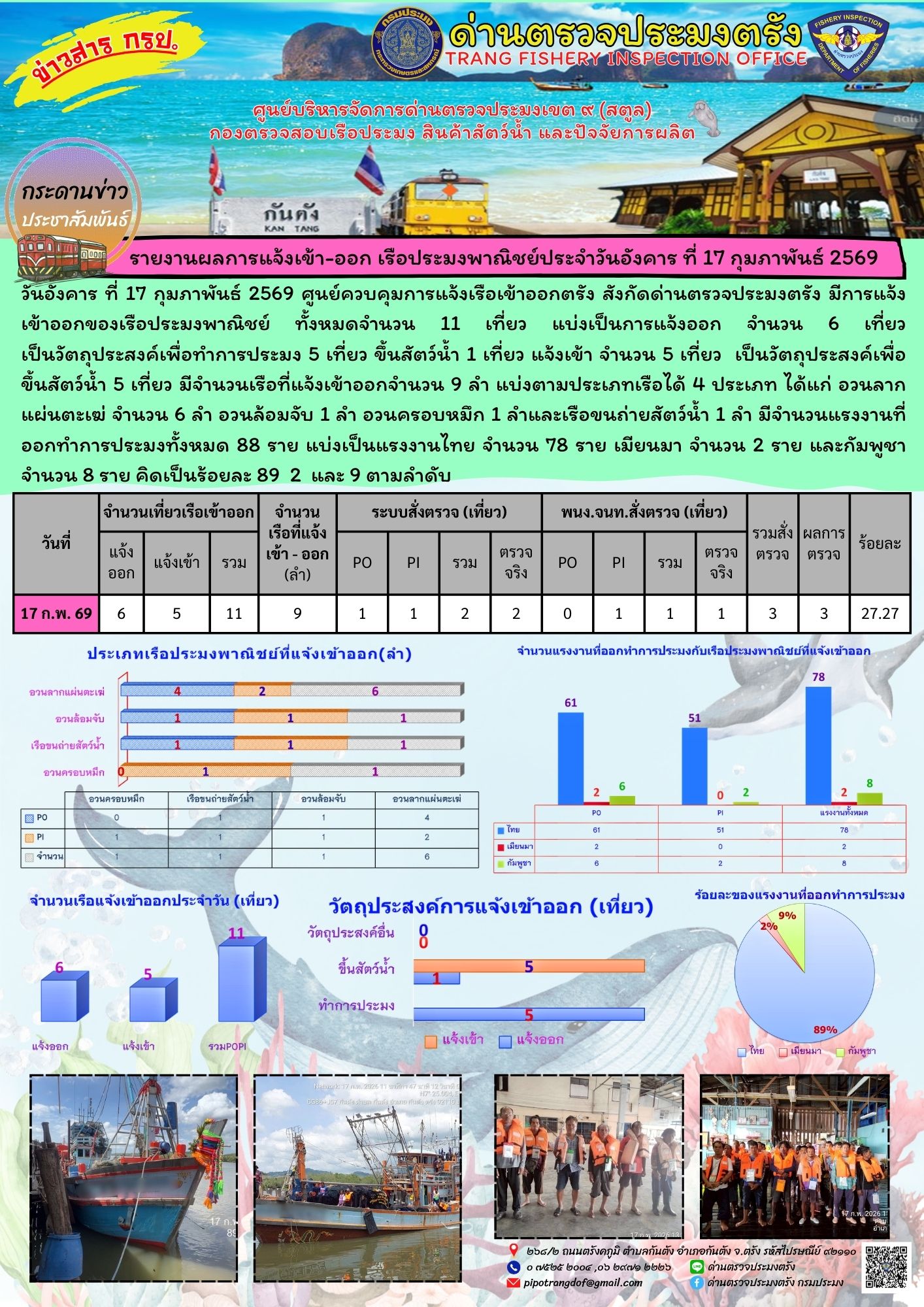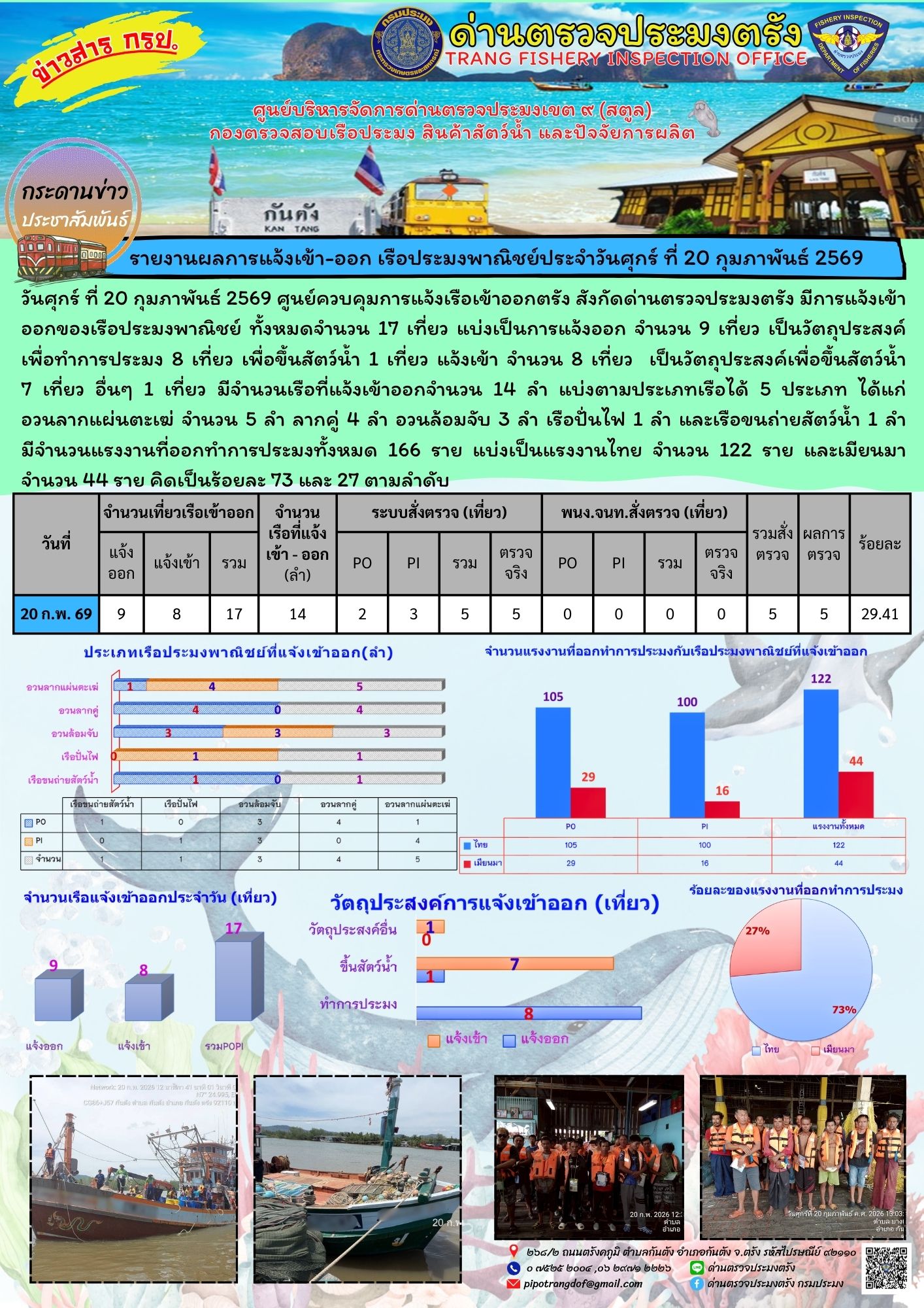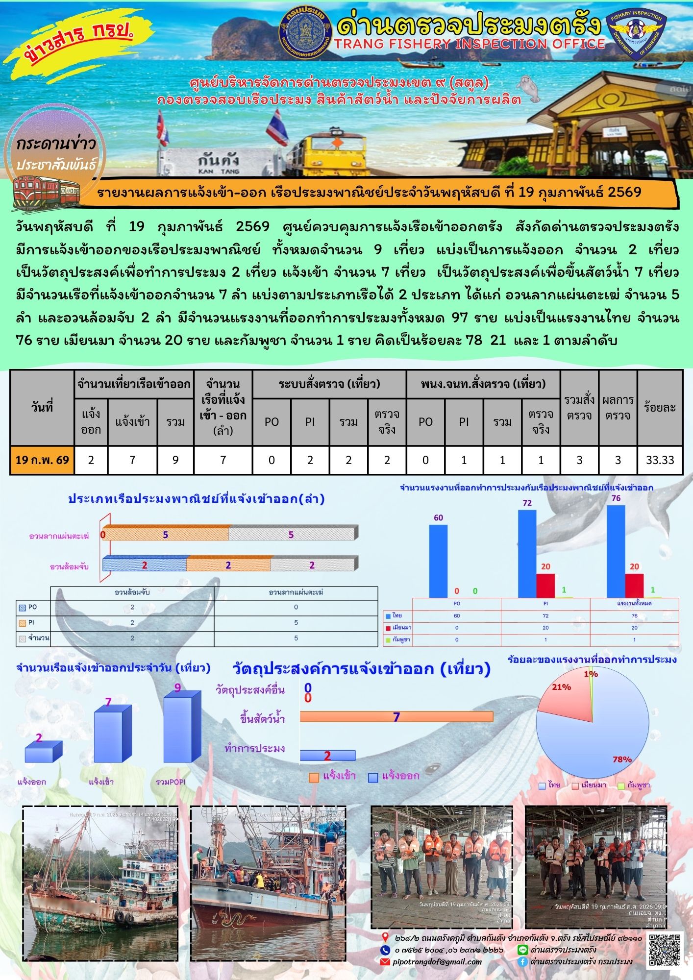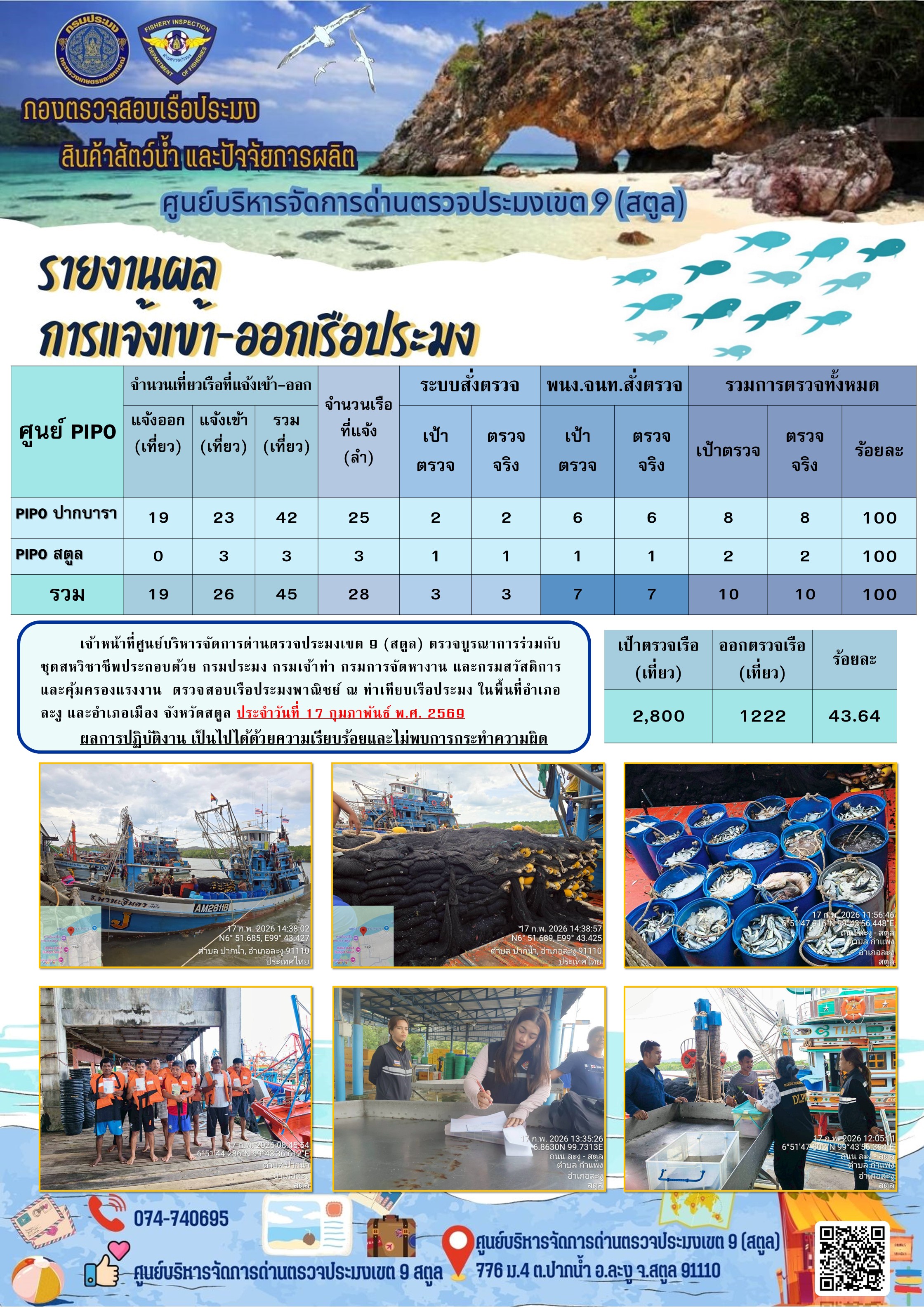 ประชาสัมพันธ์การปฏิบัติงานศูนย์บริหารจัดการด่านตรวจประมงเขต 9 (สตูล) ประจำวันที่ 16 - 20 กุมภาพันธ์ 2569