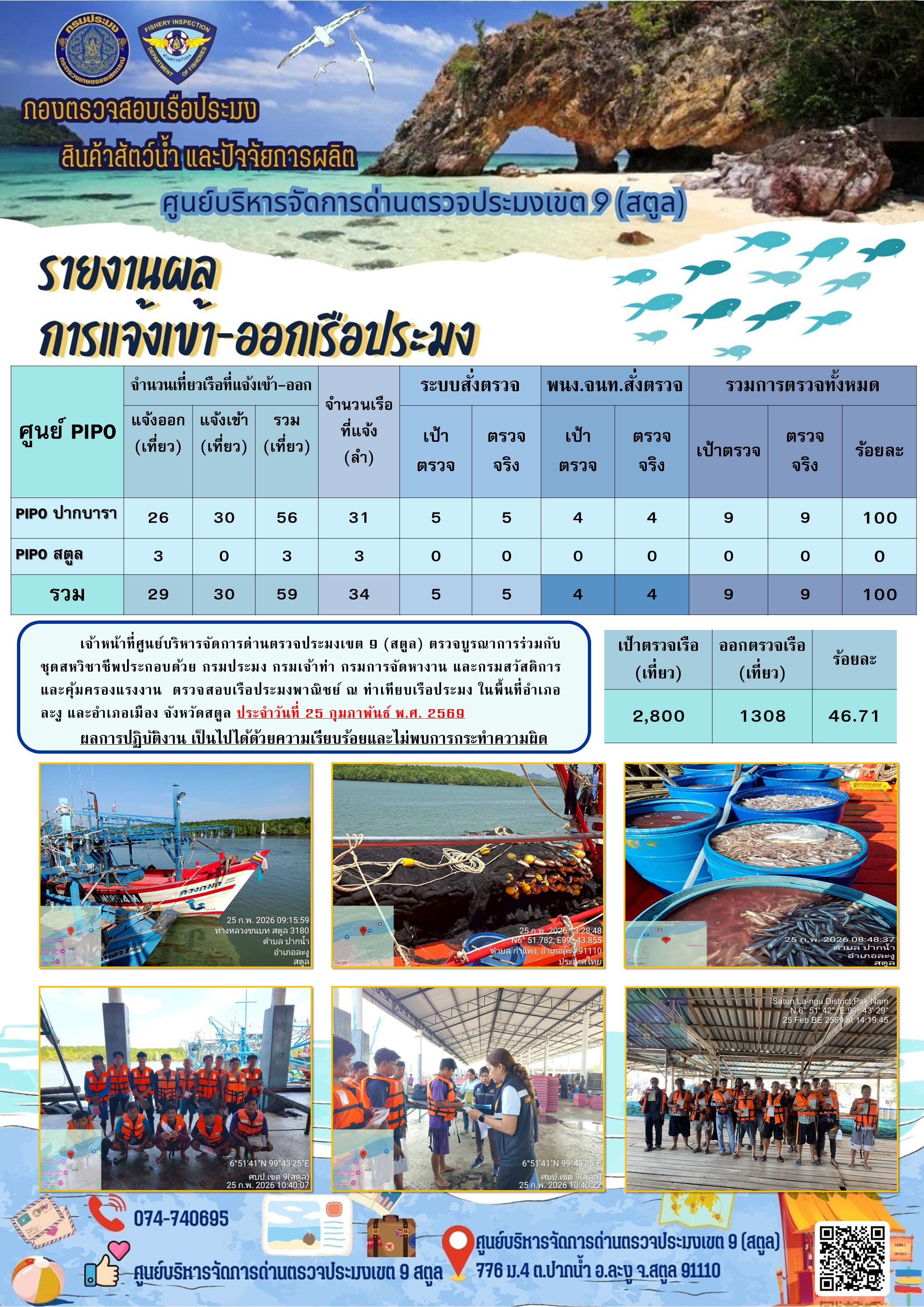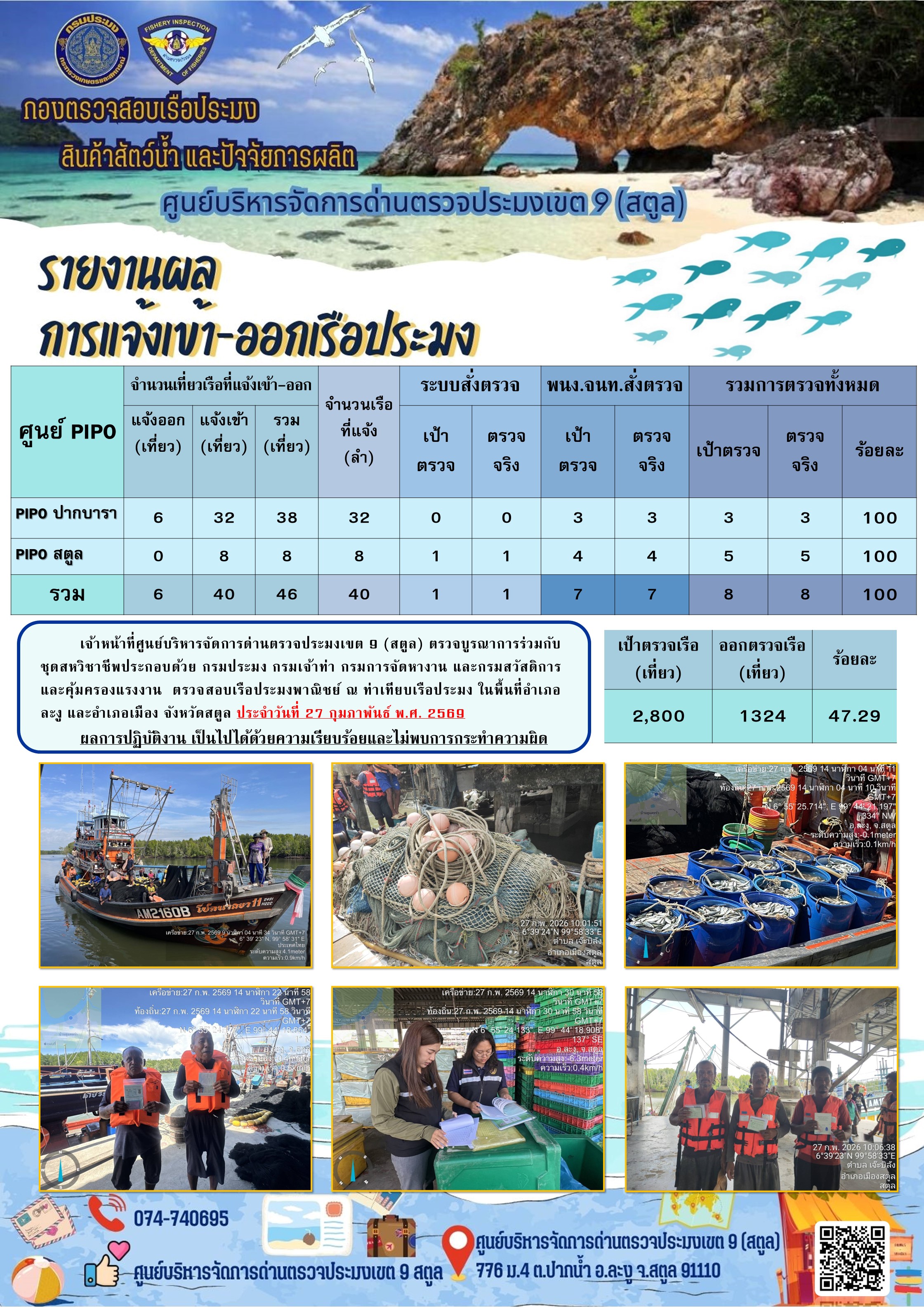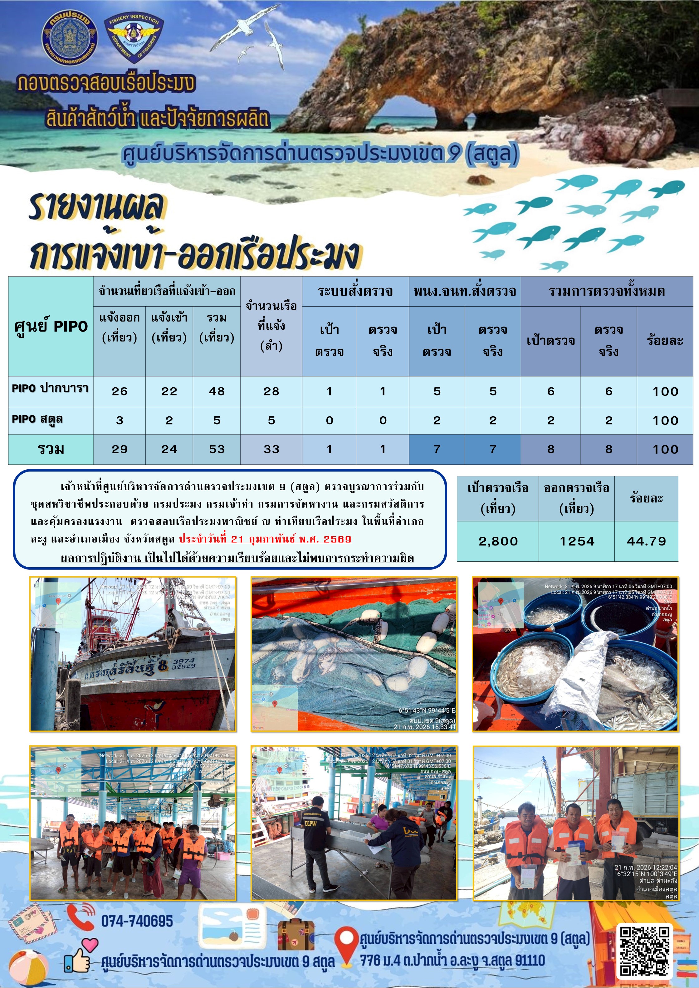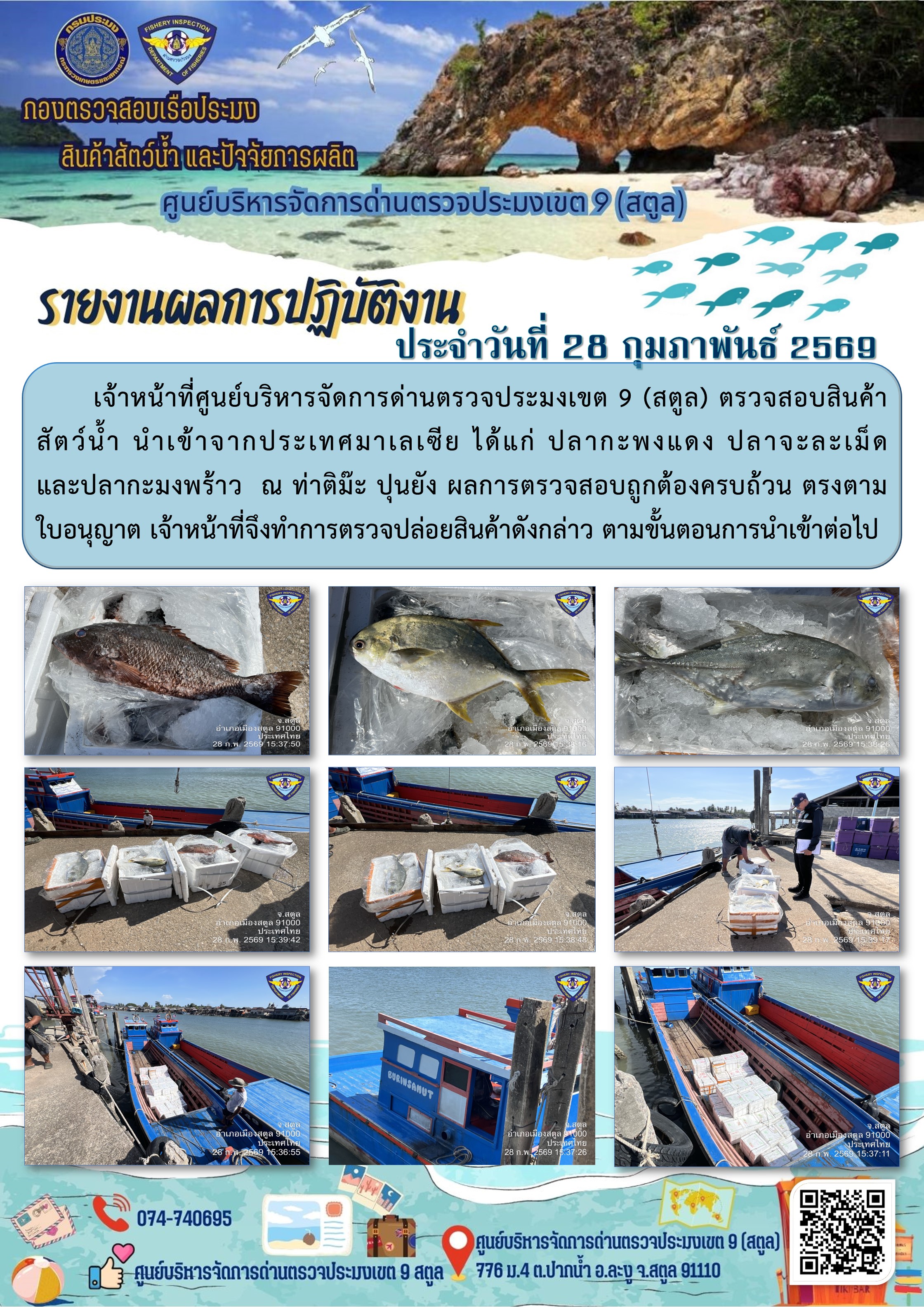 ประชาสัมพันธ์การปฏิบัติงานศูนย์บริหารจัดการด่านตรวจประมงเขต 9 (สตูล) ประจำวันที่ 21 - 28 กุมภาพันธ์ 2569