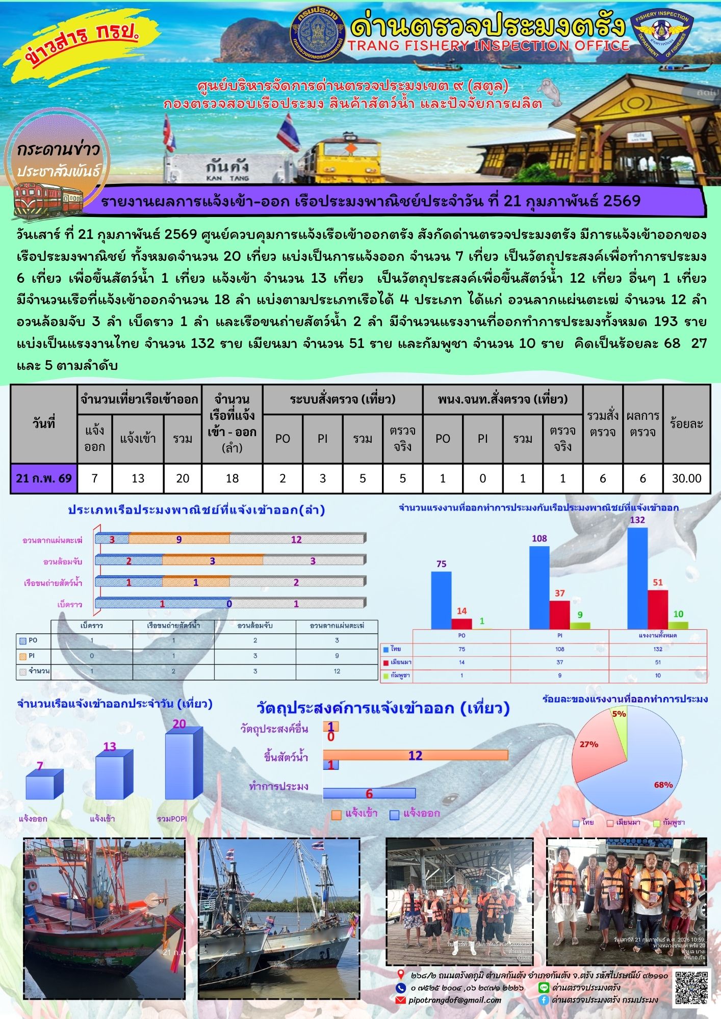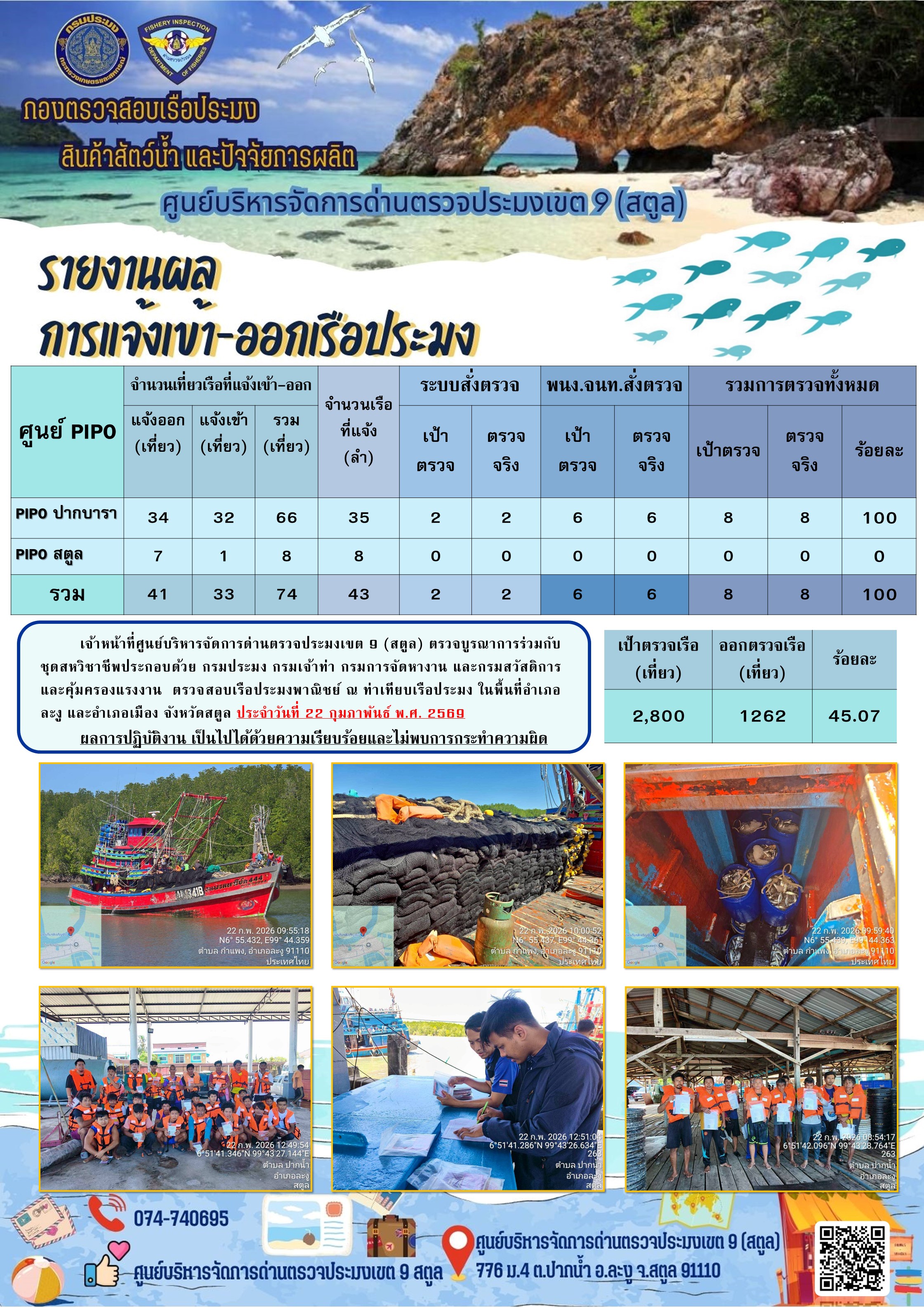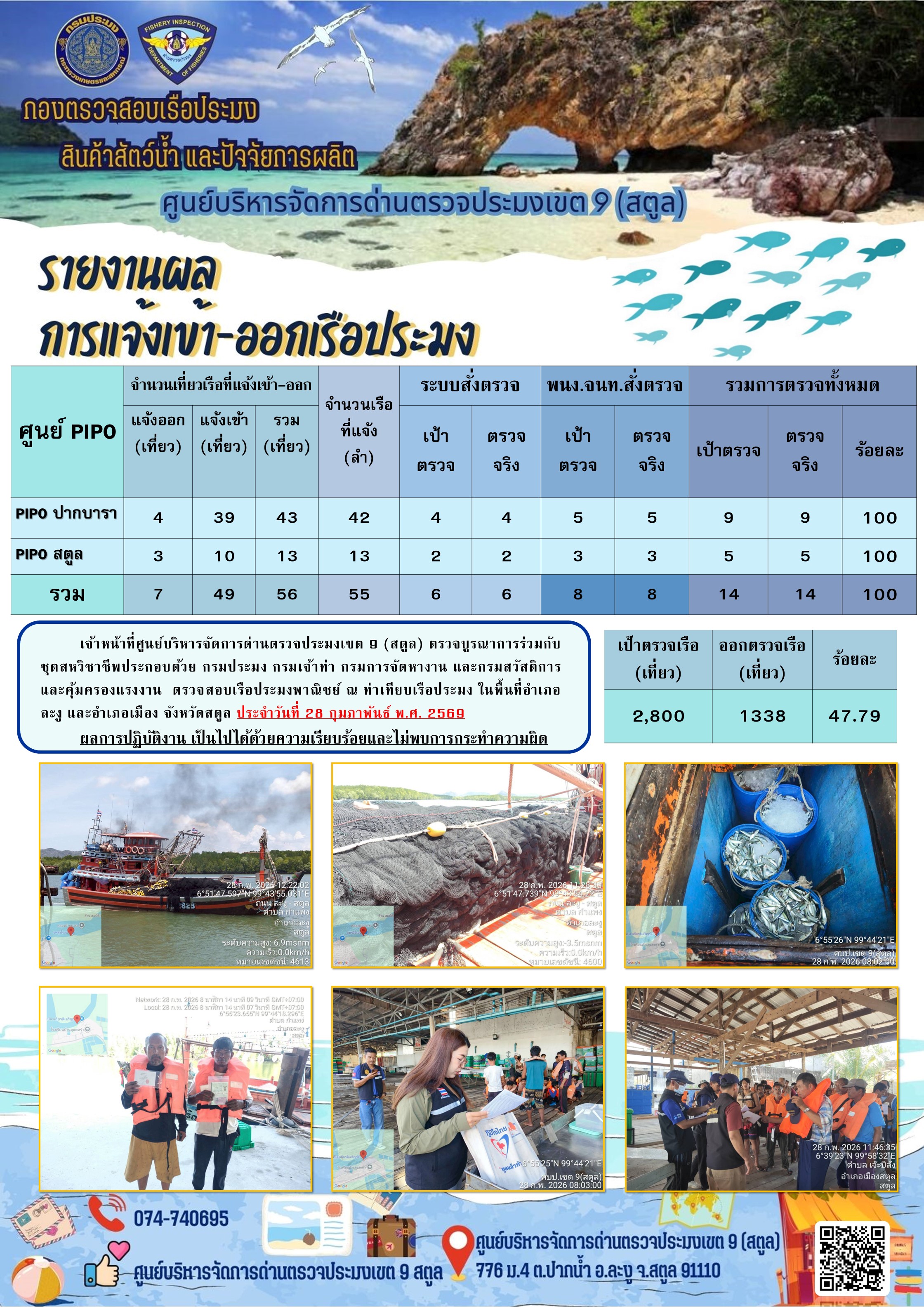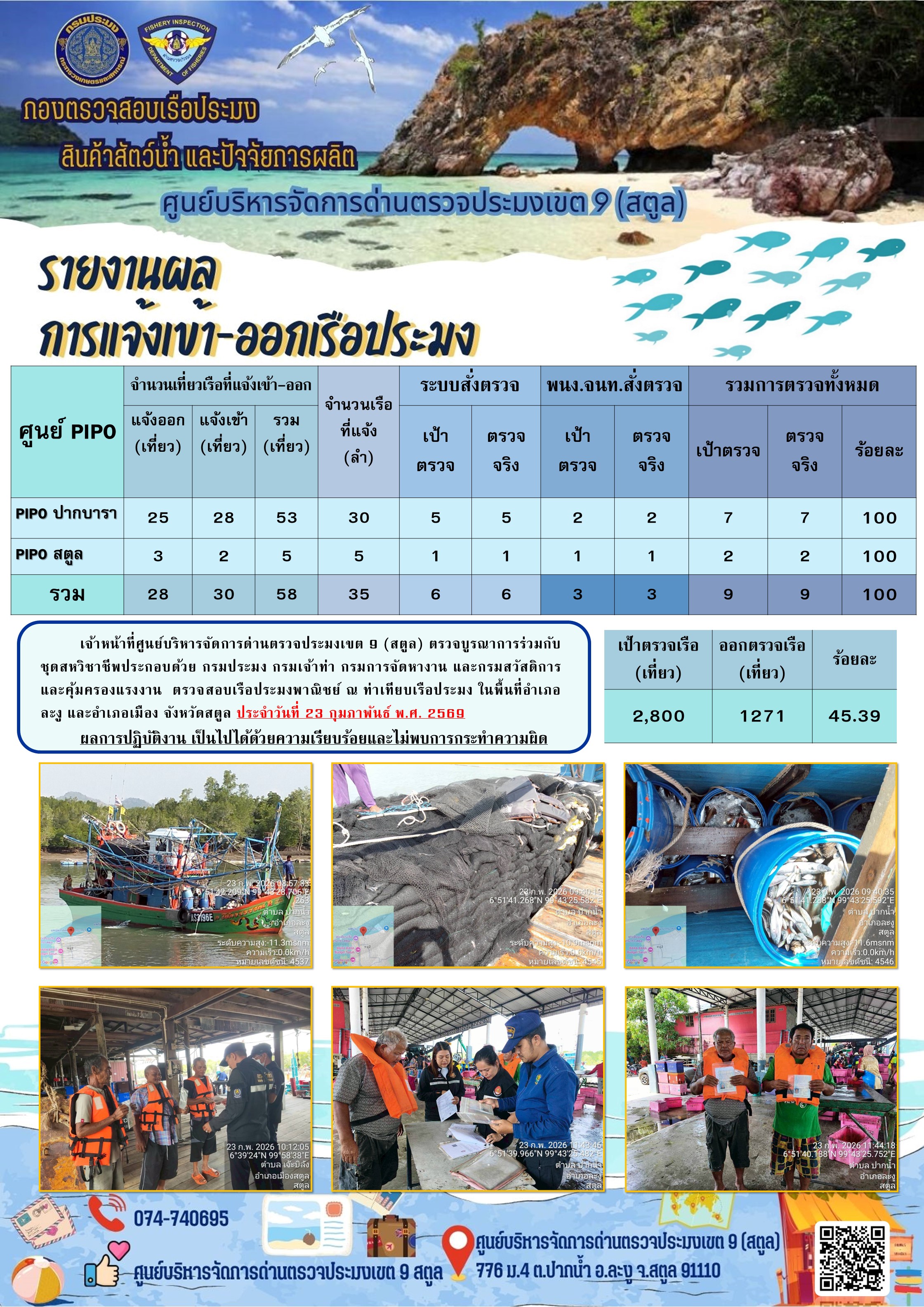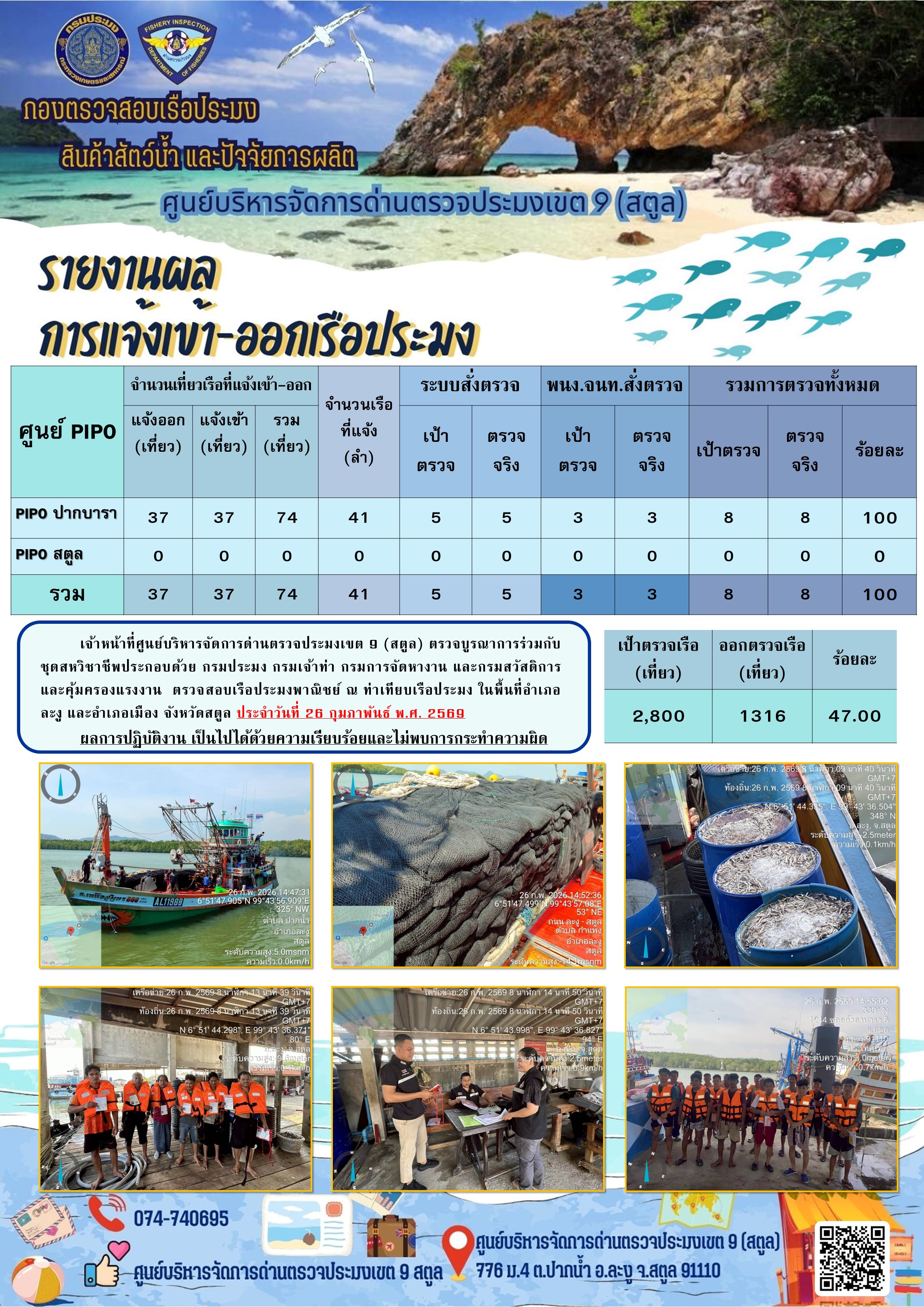 ประชาสัมพันธ์การปฏิบัติงานศูนย์บริหารจัดการด่านตรวจประมงเขต 9 (สตูล) ประจำวันที่ 21 - 28 กุมภาพันธ์ 2569