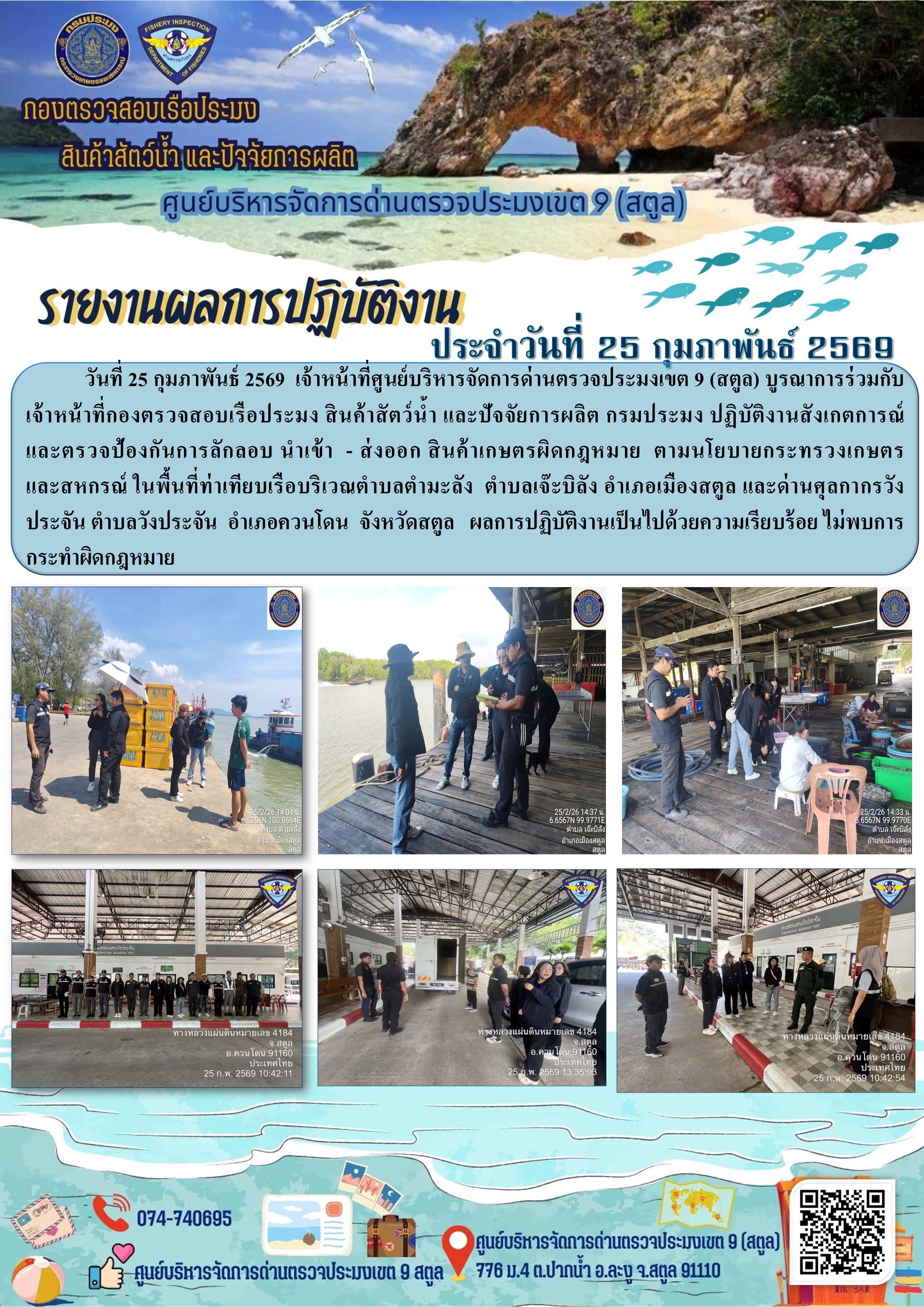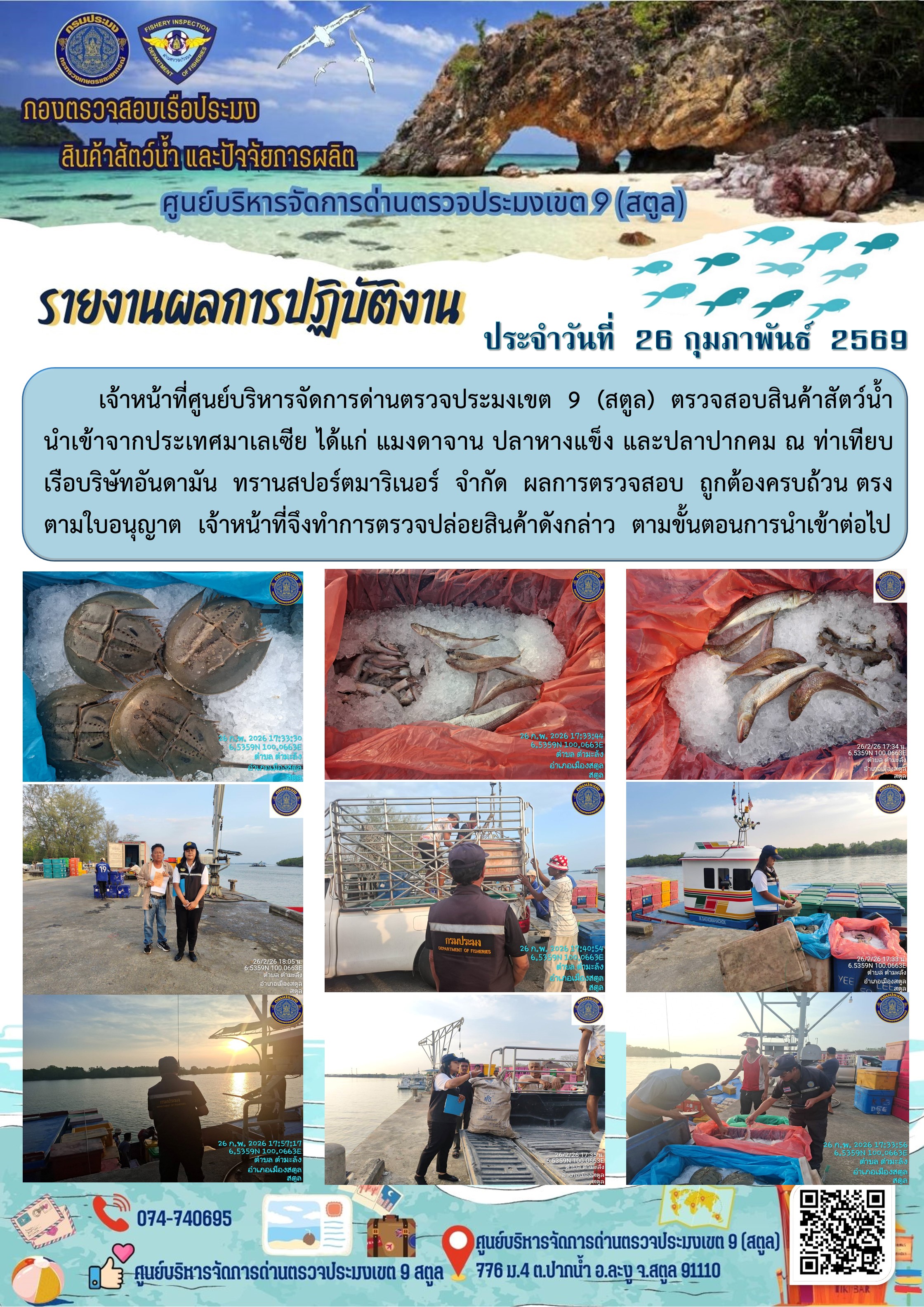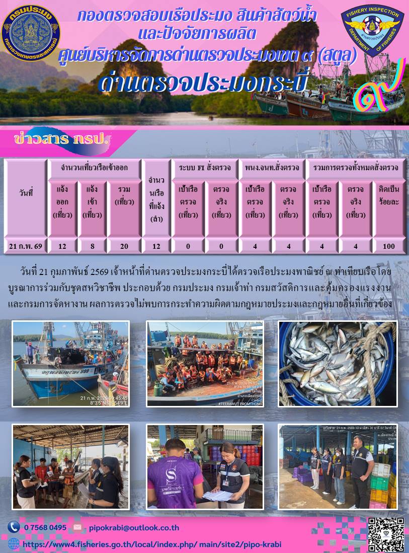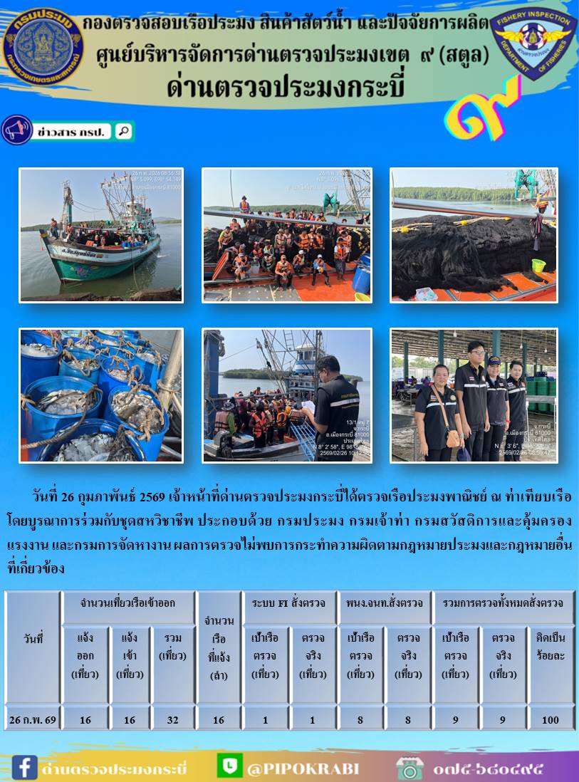 NEW ประชาสัมพันธ์การปฏิบัติงานศูนย์บริหารจัดการด่านตรวจประมงเขต 9 (สตูล) ประจำวันที่ 21 - 28 กุมภาพันธ์ 2569..คลิก