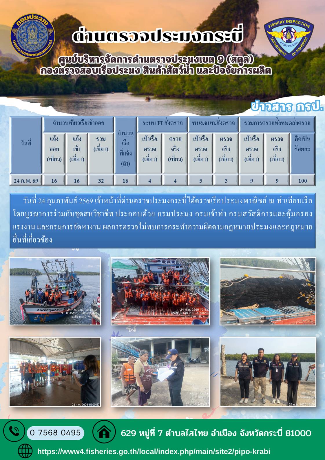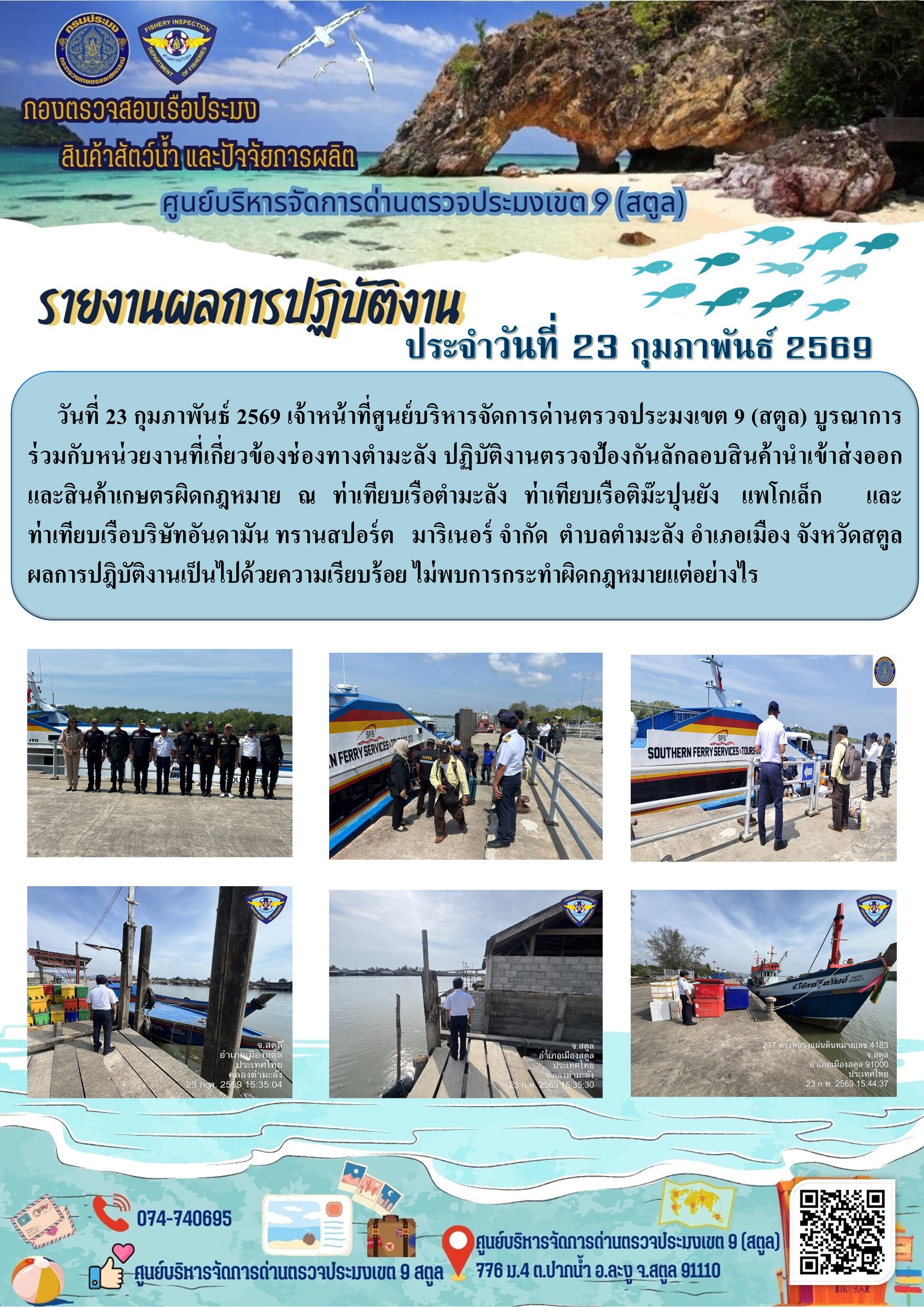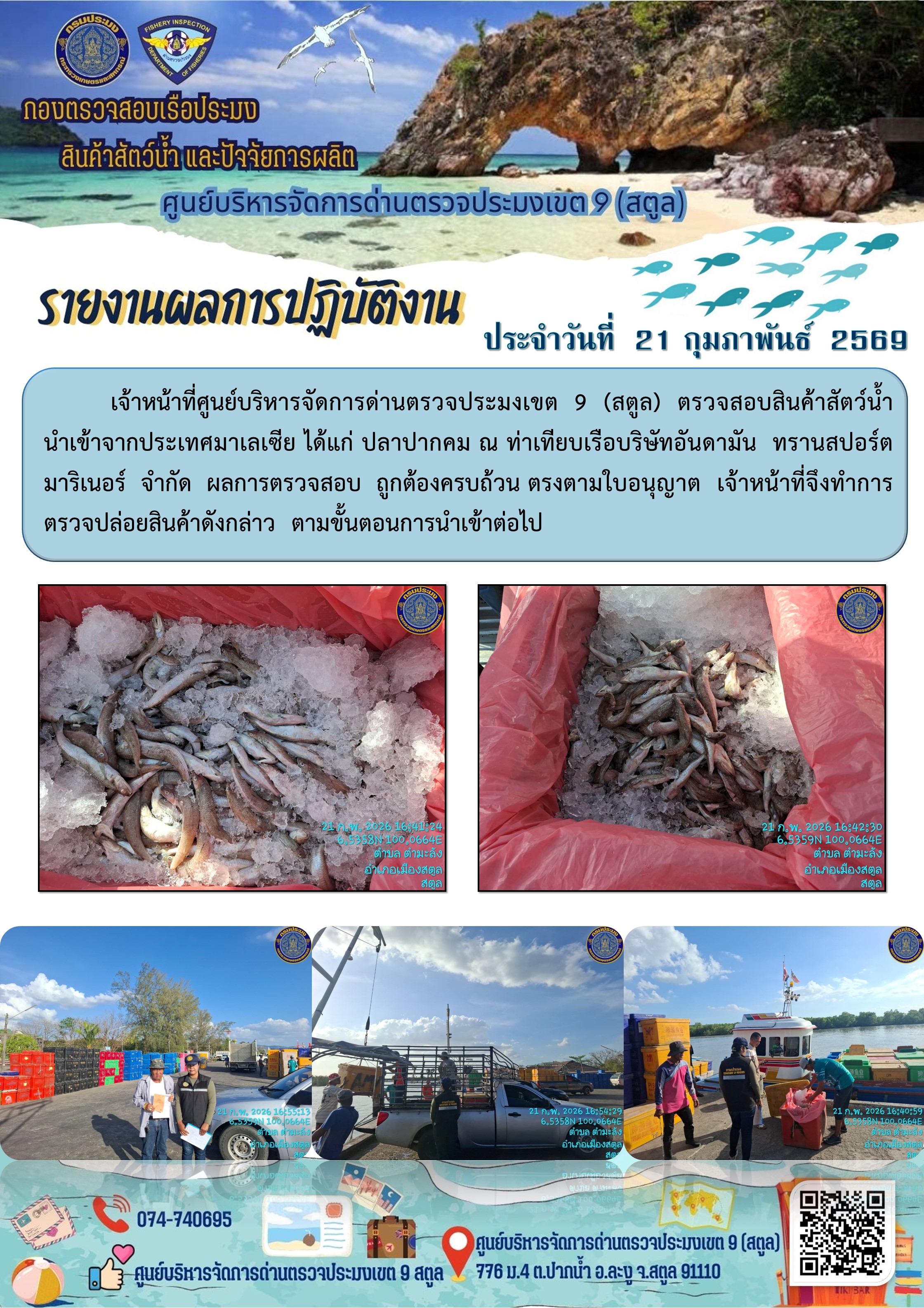 NEW ประชาสัมพันธ์การปฏิบัติงานศูนย์บริหารจัดการด่านตรวจประมงเขต 9 (สตูล) ประจำวันที่ 21 - 28 กุมภาพันธ์ 2569..คลิก