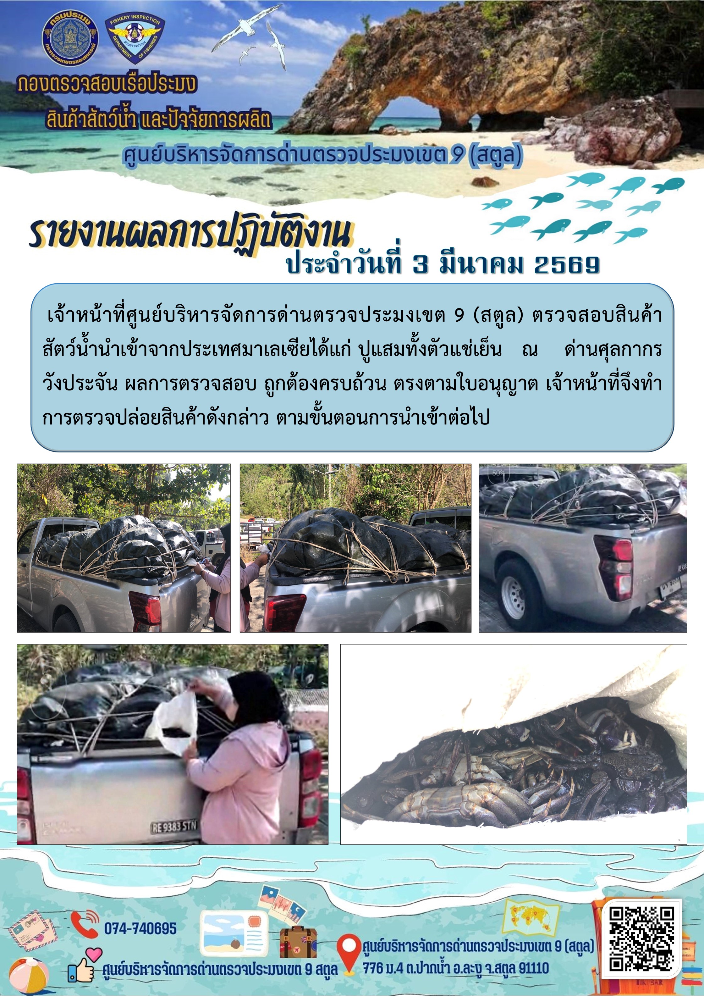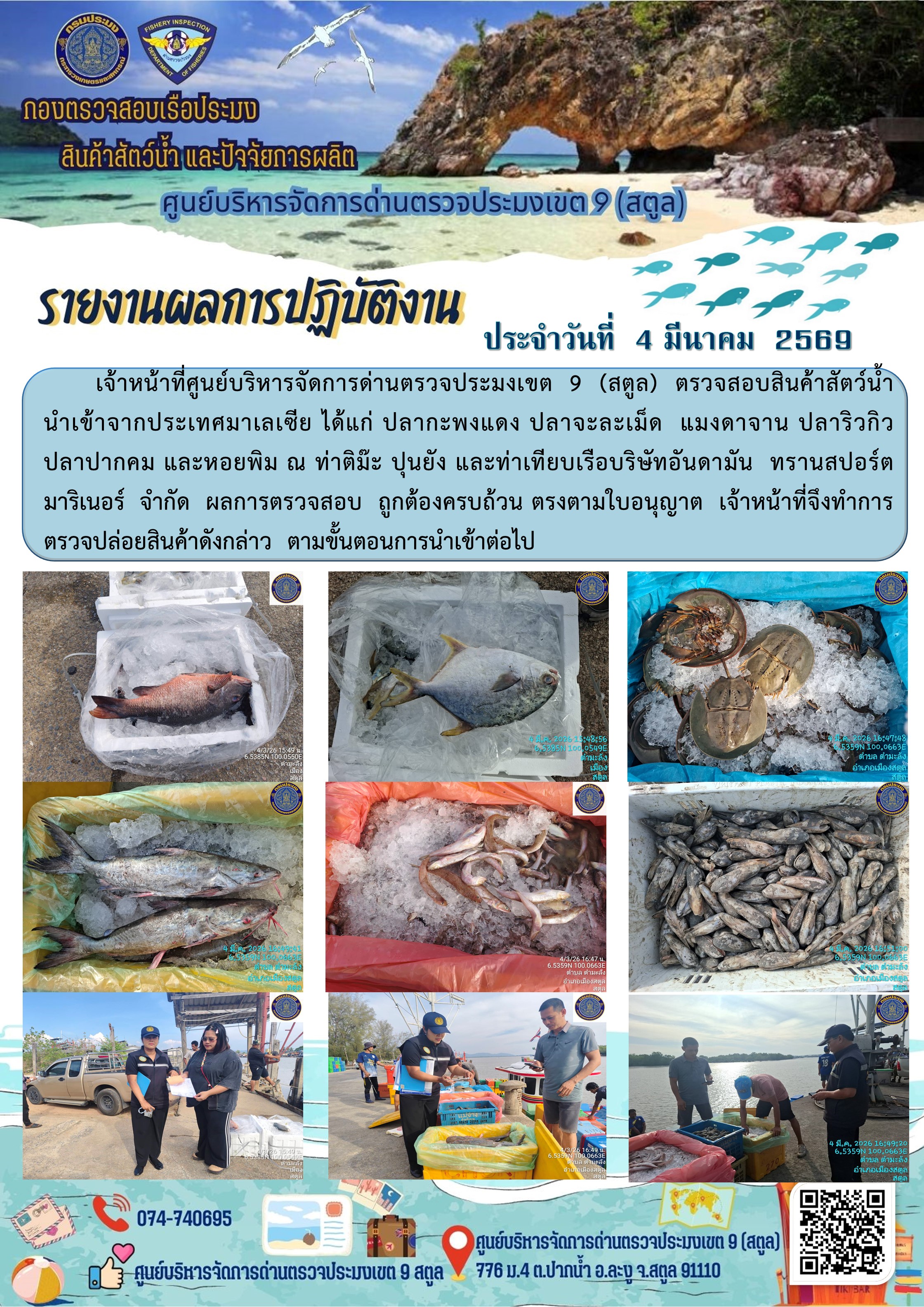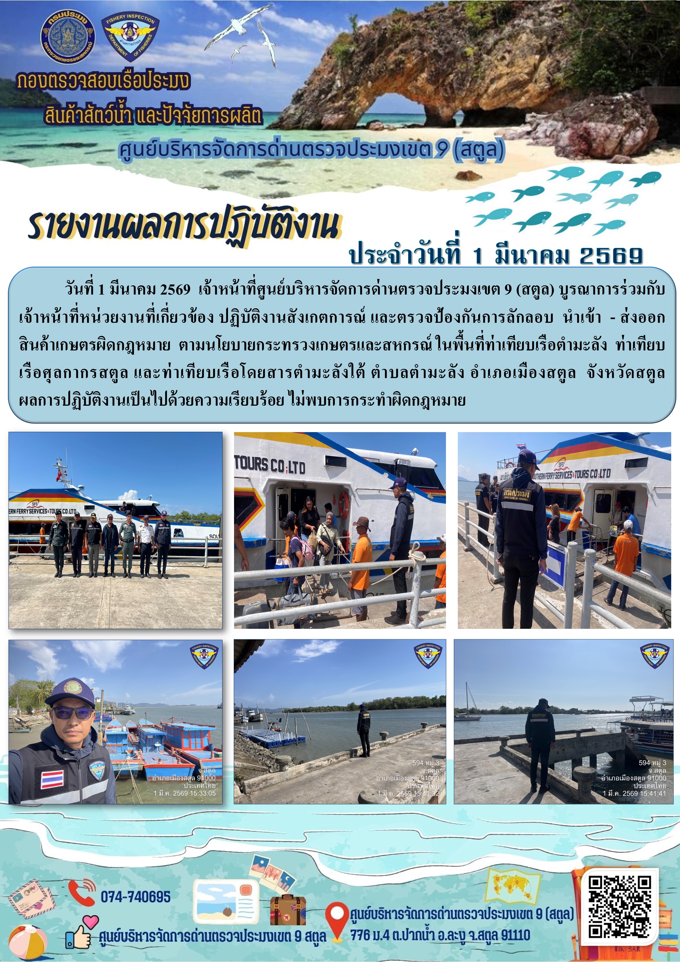 NEW ประชาสัมพันธ์การปฏิบัติงานศูนย์บริหารจัดการด่านตรวจประมงเขต 9 (สตูล) ประจำวันที่ 1 - 5 มีนาคม 2569..คลิก