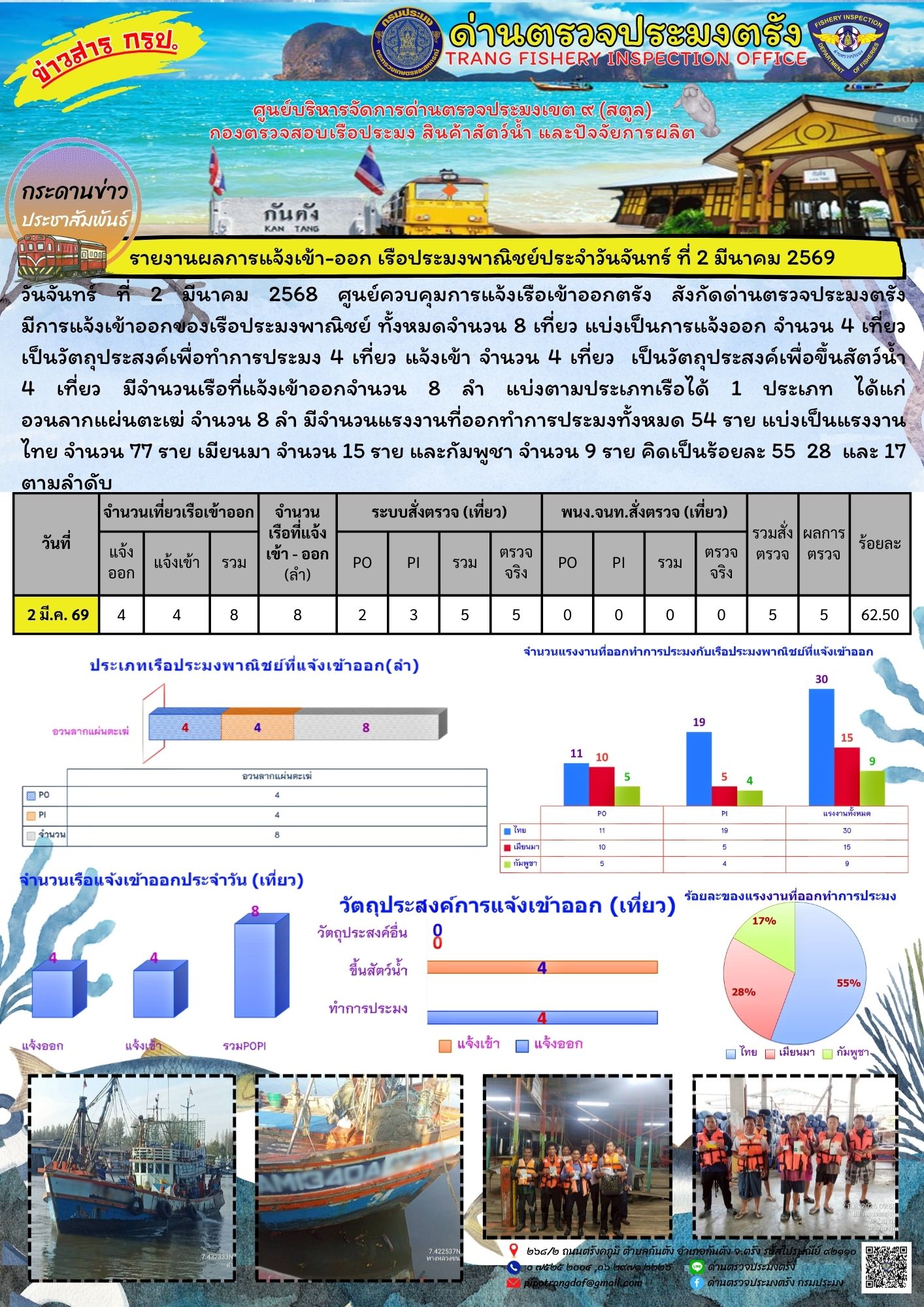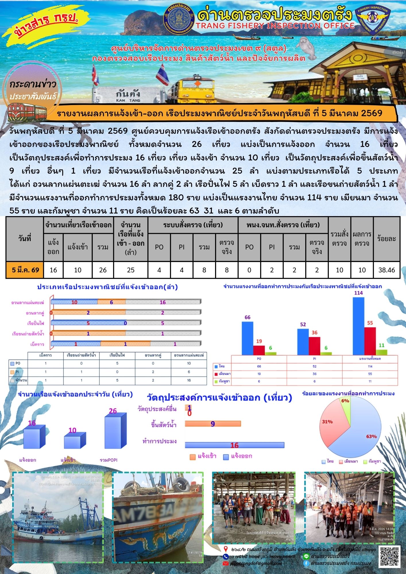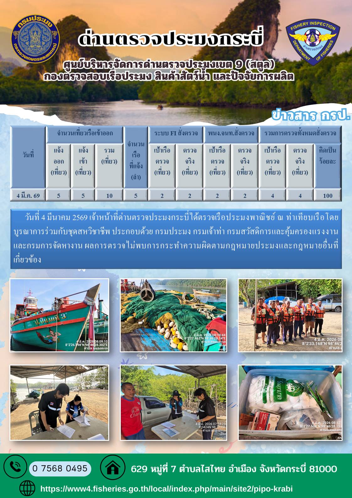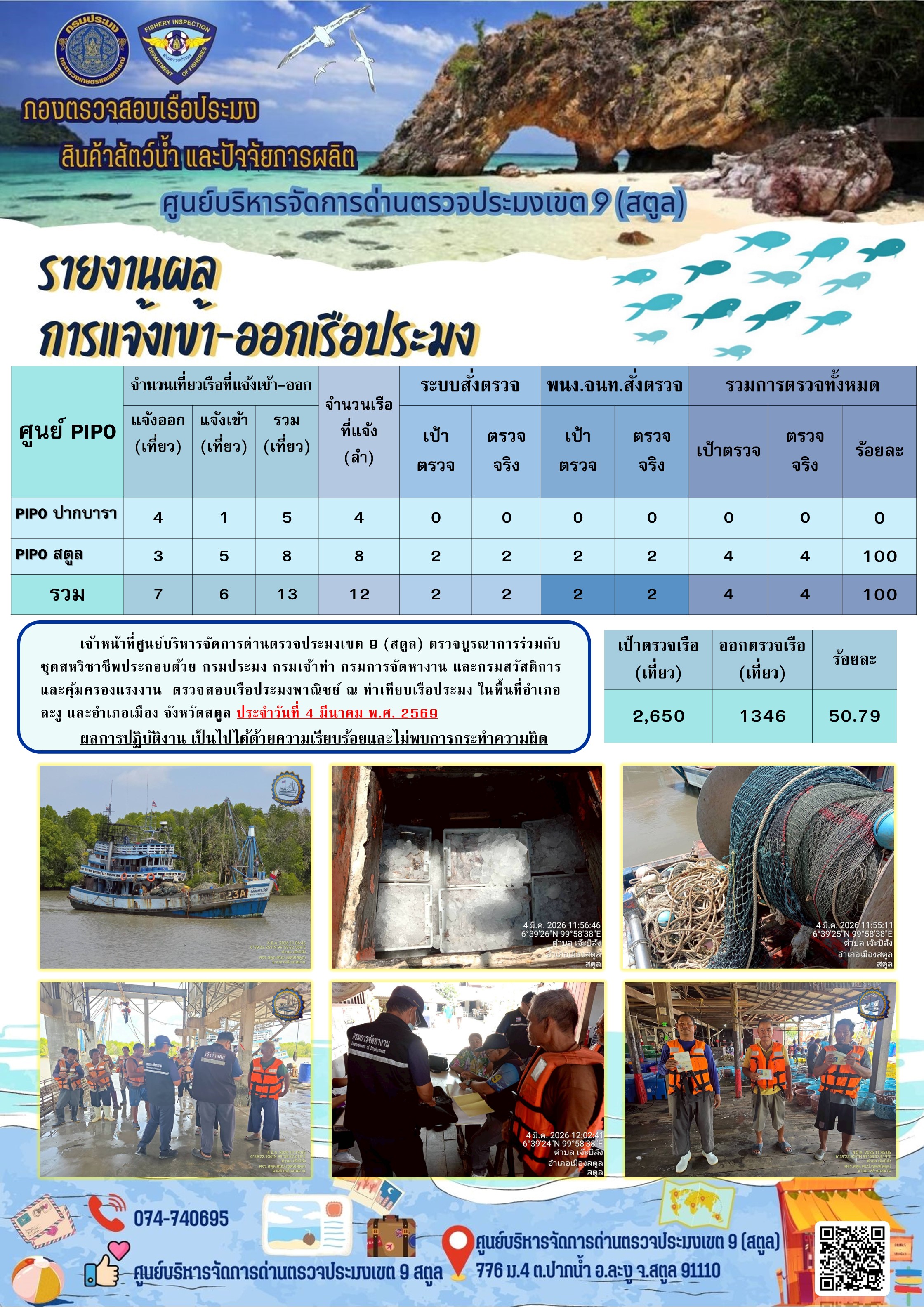 NEW ประชาสัมพันธ์การปฏิบัติงานศูนย์บริหารจัดการด่านตรวจประมงเขต 9 (สตูล) ประจำวันที่ 1 - 5 มีนาคม 2569..คลิก