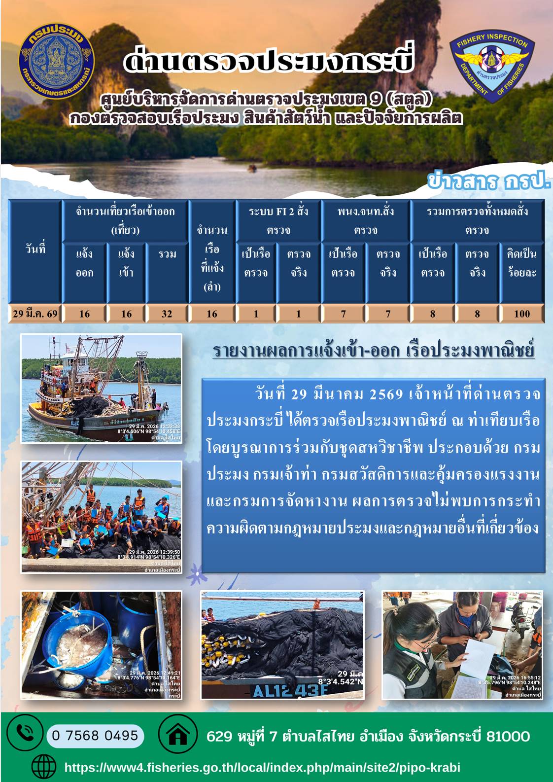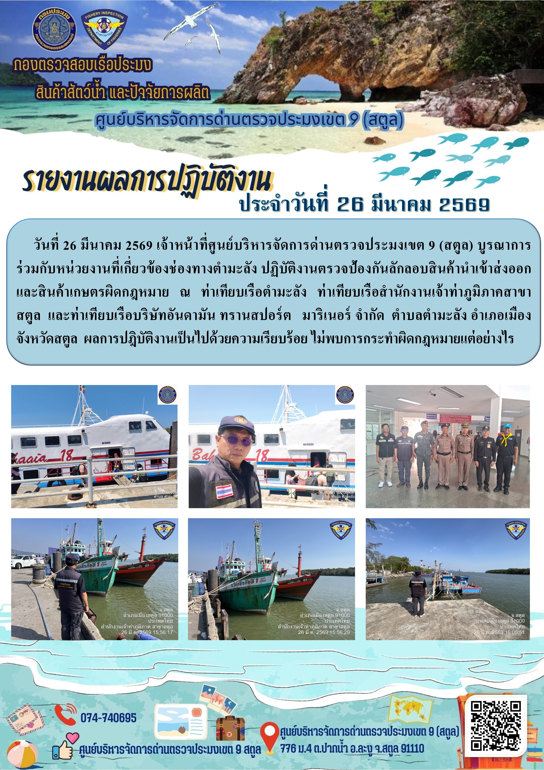 ประชาสัมพันธ์การปฏิบัติงานศูนย์บริหารจัดการด่านตรวจประมงเขต 9 (สตูล) ประจำวันที่ 26 - 31 มีนาคม 2569