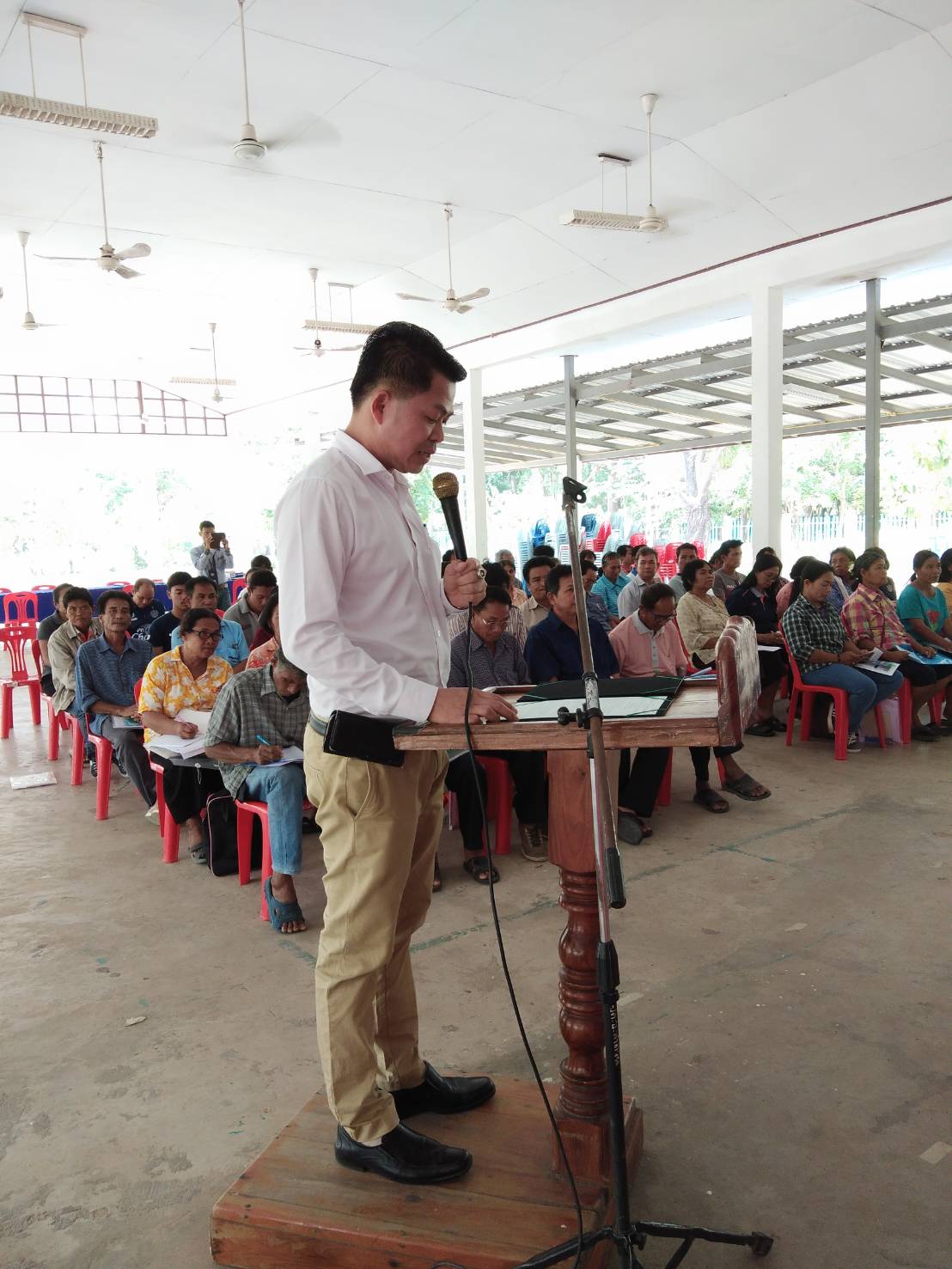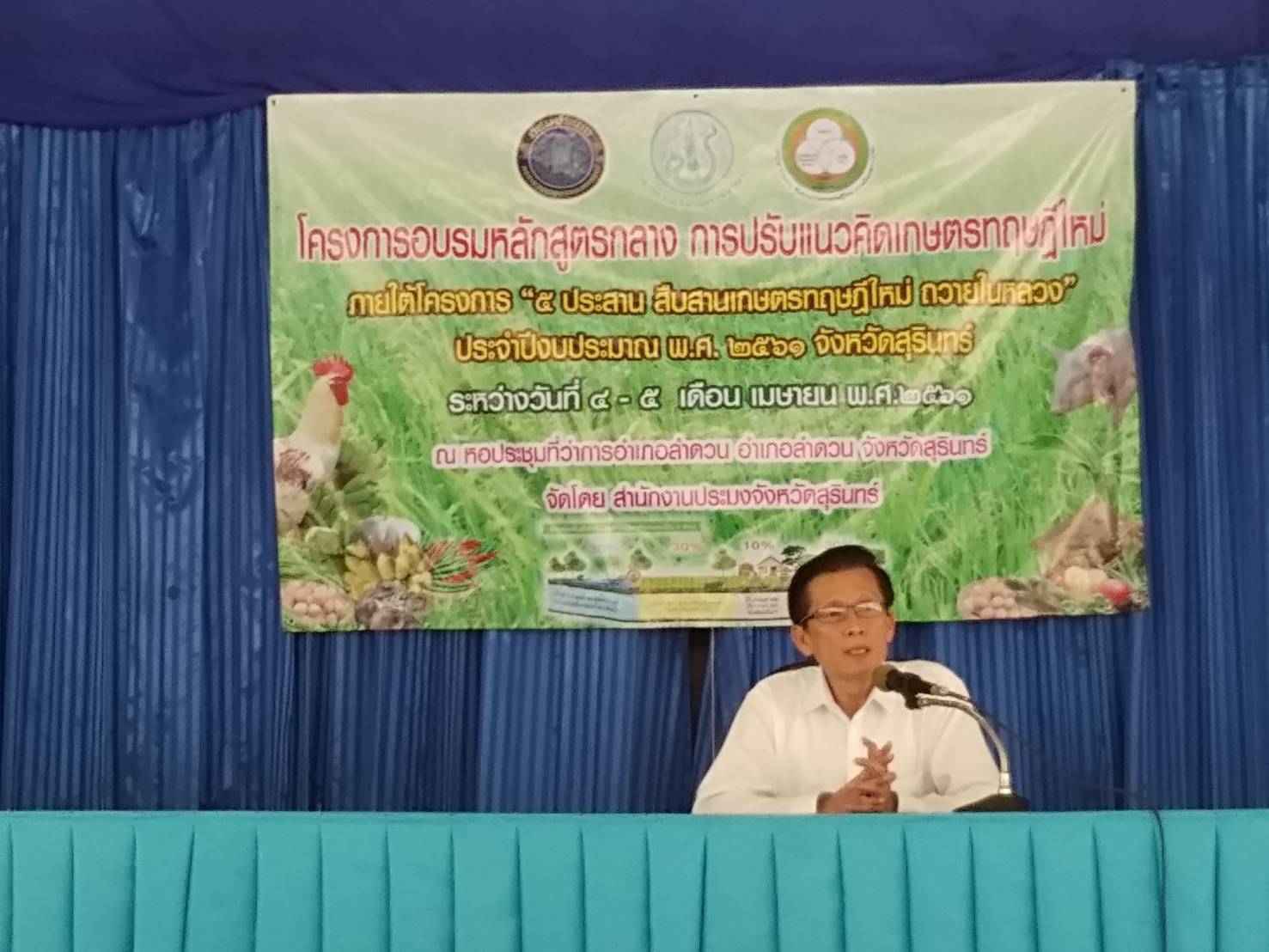 วันที่ 4 เมษายน 2561  นางสุวรรณี สกุลทอง ประมงจังหวัดสุรินทร์ มอบหมายกลุ่มพัฒนาและส่งเสริมอาชีพการประมง สนง.ประมงจังหวัดสุรินทร์ ร่วมกับ ประมงอำเภอศีขรภูมิ และสนง.เกษตรและสหกรณ์จังหวัดสุรินทร์ ดำเนินการจัดฝึกอบรมเกษตรกรโครงการอบรมหลักสูตรกลาง การปรับแนวคิดเกษตรทฤษฎีใหม่ ภายใต้โครงการ "5 ประสาน สืบสานเกษตรทฤษฎีใหม่ ถวายในหลวง" จังหวัดสุรินทร์ จำนวน 82 ราย ณ หอประชุมที่ว่าการอำเภอลำดวน อ.ลำดวน จ.สุรินทร์ โดยมี นายธนิต มยูขโชติ นายอำเภอลำดวน เป็นประธานในพิธีเปิดการฝึกอบรมฯ