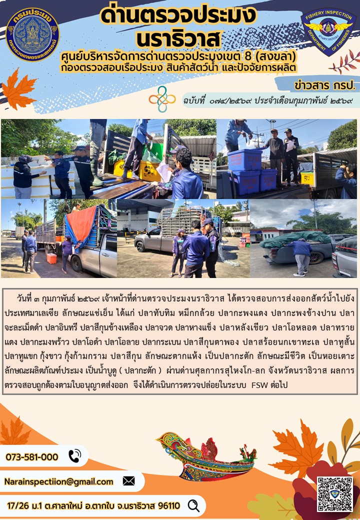 NEW ประชาสัมพันธ์ด่านตรวจประมงนราธิวาส ประจำวันที่ 3 กุมภาพันธ์ 2569..คลิก