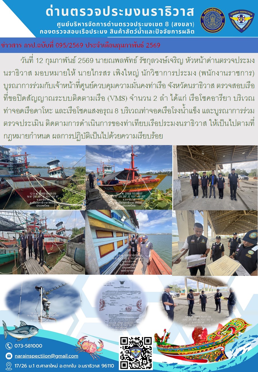 ประชาสัมพันธ์ด่านตรวจประมงนราธิวาส ประจำวันที่ 12 กุมภาพันธ์ 2569