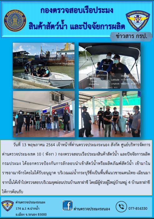 วันที่ 13 พฤษภาคม 2564 เจ้าหน้าที่ด่านตรวจประมงระนอง สังกัด ศูนย์บริหารจัดการด่านตรวจประมงเขต 10 ( พังงา ) กองตรวจสอบเรือประมงสินค้าสัตว์น้ำ และปัจจัยการผลิต กรมประมง ได้ออกตรวจป้องกันการลักลอบนำเข้าสัตว์น้ำหรือผลิตภัณฑ์สัตว์น้ำ เข้ามาในราชอาณาจักรโดยไม่ได้รับอนุญาต บริเวณแม่น้ำกระบุรีซึ่งเป็นพื้นที่แนวชายแดนไทย-เมียนมา จากนั้นได้เข้าไปตรวจสอบบริเวณจุดผ่อนปรนบ้านเขาฝาชี โดยมีผู้ช่วยผู้ใหญ่บ้านหมู่ 4 บ้านเขาฝาชีให้การต้อนรับ