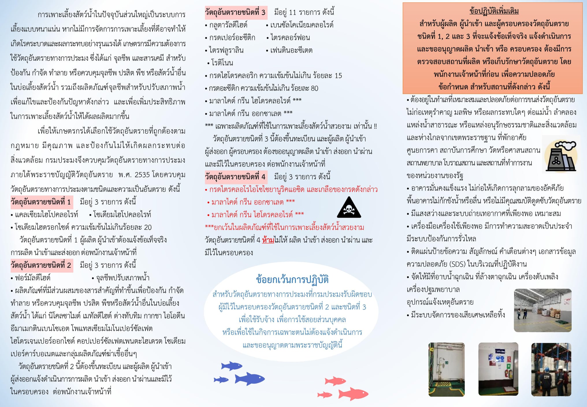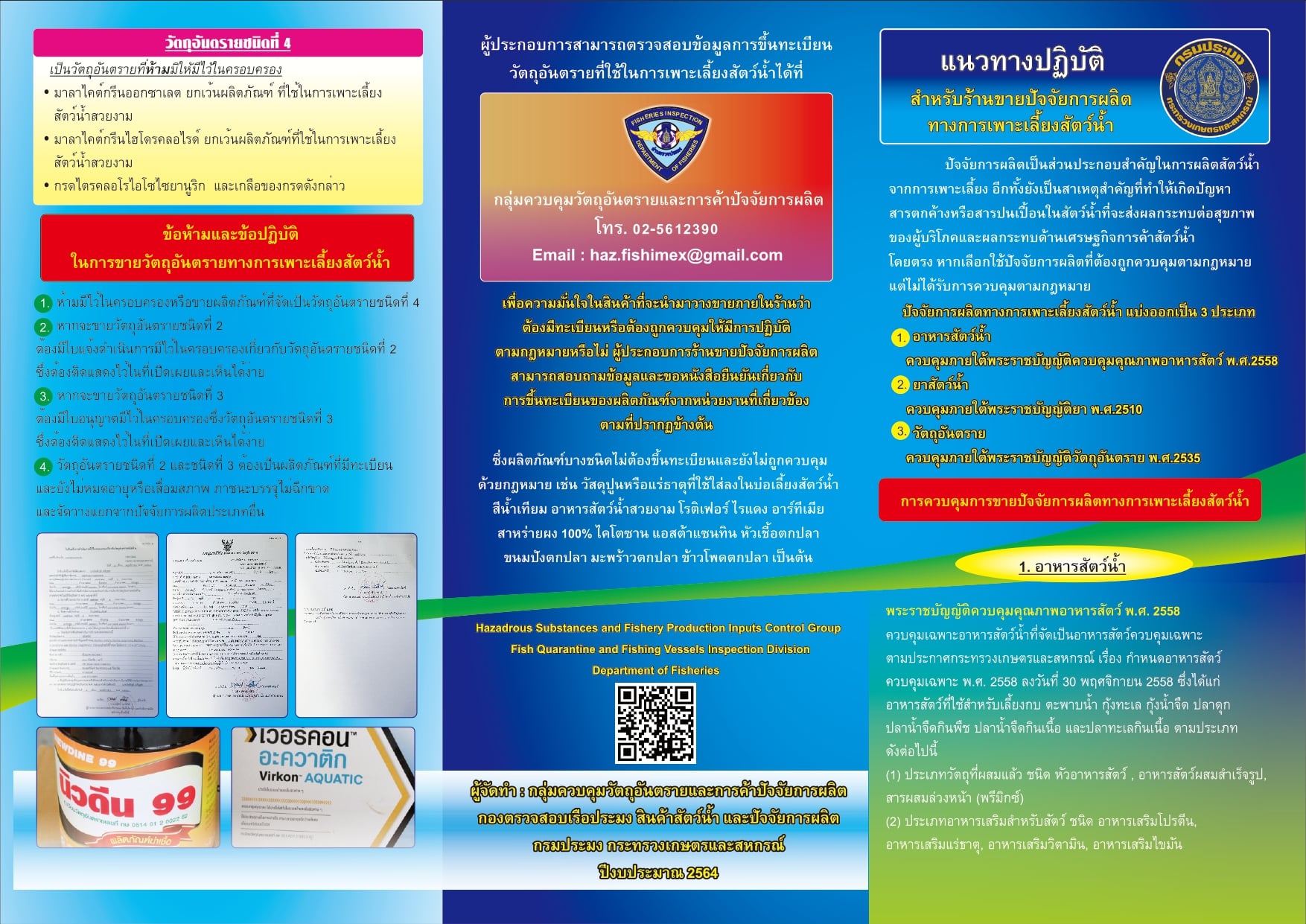 3.วัตถุอันตรายทางการประมง ตามพรบ.วัตถุอันตราย พ.ศ.2535 ขอใบอนุญาตได้ที่กลุ่มควบคุมวัตถุอันตรายและการค้าปัจจัยการผลิต กรมประมง