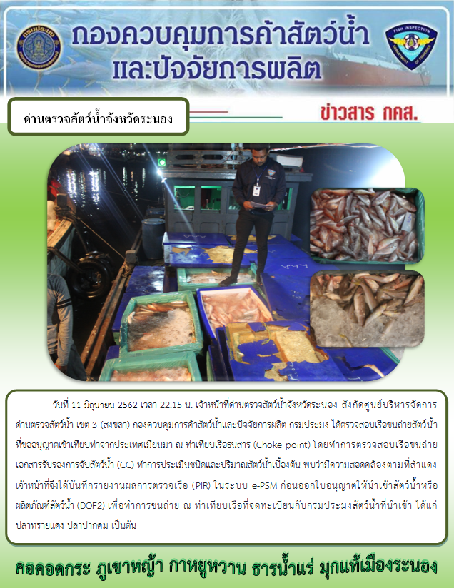 วันที่ 11 มิถุนายน 2562 เวลา 22.15 น. เจ้าหน้าที่ด่านตรวจสัตว์น้ำจังหวัดระนอง สังกัดศูนย์บริหารจัดการ ด่านตรวจสัตว์น้ำ เขต 3 (สงขลา) กองควบคุมการค้าสัตว์น้ำและปัจจัยการผลิต กรมประมง ได้ตรวจสอบเรือขนถ่ายสัตว์น้ำ ที่ขออนุญาตเข้าเทียบท่าจากประเทศเมียนมา ณ ท่าเทียบเรือธนสาร (Choke point) โดยทำการตรวจสอบเรือขนถ่าย เอกสารรับรองการจับสัตว์น้ำ (CC) ทำการประเมินชนิดและปริมาณสัตว์น้ำเบื้องต้น พบว่ามีความสอดคล้องตามที่สำแดง เจ้าหน้าที่จึงได้บันทึกรายงานผลการตรวจเรือ (PIR) ในระบบ e-PSM ก่อนออกใบอนุญาตให้นำเข้าสัตว์น้ำหรือผลิตภัณฑ์สัตว์น้ำ (DOF2) เพื่อทำการขนถ่าย ณ ท่าเทียบเรือที่จดทะเบียนกับกรมประมงสัตว์น้ำที่นำเข้า ได้แก่ ปลาทรายแดง ปลาปากคม เป็นต้น