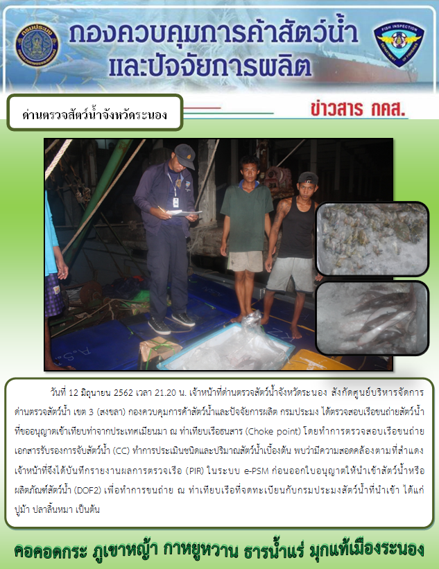 วันที่ 12 มิถุนายน 2562 เวลา 21.20 น. เจ้าหน้าที่ด่านตรวจสัตว์น้ำจังหวัดระนอง สังกัดศูนย์บริหารจัดการด่านตรวจสัตว์น้ำ เขต 3 (สงขลา) กองควบคุมการค้าสัตว์น้ำและปัจจัยการผลิต กรมประมง ได้ตรวจสอบเรือขนถ่ายสัตว์น้ำ ที่ขออนุญาตเข้าเทียบท่าจากประเทศเมียนมา ณ ท่าเทียบเรือธนสาร (Choke point) โดยทำการตรวจสอบเรือขนถ่าย เอกสารรับรองการจับสัตว์น้ำ (CC) ทำการประเมินชนิดและปริมาณสัตว์น้ำเบื้องต้น พบว่ามีความสอดคล้องตามที่สำแดง เจ้าหน้าที่จึงได้บันทึกรายงานผลการตรวจเรือ (PIR) ในระบบ e-PSM ก่อนออกใบอนุญาตให้นำเข้าสัตว์น้ำหรือผลิตภัณฑ์สัตว์น้ำ (DOF2) เพื่อทำการขนถ่าย ณ ท่าเทียบเรือที่จดทะเบียนกับกรมประมงสัตว์น้ำที่นำเข้า ได้แก่ ปูม้า ปลาลิ้นหมา เป็นต้น