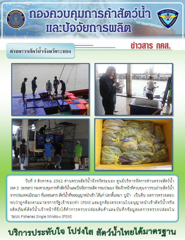 วันที่ 9 สิงหาคม 2562 ด่านตรวจสัตว์น้ำจังหวัดระนอง ศูนย์บริหารจัดการด่านตรวจสัตว์น้ำ เขต 3 (สงขลา) กองควบคุมการค้าสัตว์น้ำและปัจจัยการผลิต กรมประมง จัดเจ้าหน้าที่ควบคุมการขนถ่ายสัตว์น้ำจากประเทศเมียนมา ที่แพธนสาร สัตว์น้ำที่ขออนุญาตนำเข้า ได้แก่ ปลาลิ้นหมา ปูม้า เป็นต้น ผลการตรวจสอบพบว่าถูกต้องตามมาตรการรัฐเจ้าของท่า (PSM) และถูกต้องตรงตามใบอนุญาตนำเข้าสัตว์น้ำหรือ ผลิตภัณฑ์สัตว์น้ำเจ้าหน้าที่จึงได้ทำการตรวจปล่อยสินค้าและบันทึกข้อมูลผลการตรวจปล่อยในระบบ Fisheries Single Window (FSW)