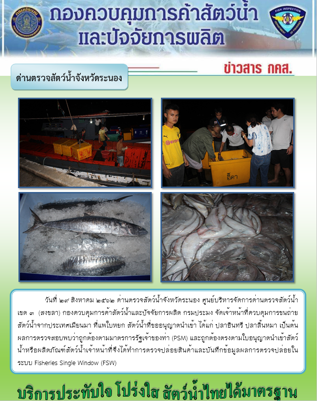 วันที่ 29 สิงหาคม 2562 ด่านตรวจสัตว์น้ำจังหวัดระนอง ศูนย์บริหารจัดการด่านตรวจสัตว์น้ำ เขต 3 (สงขลา) กองควบคุมการค้าสัตว์น้ำและปัจจัยการผลิต กรมประมง จัดเจ้าหน้าที่ควบคุมการขนถ่ายสัตว์น้ำจากประเทศเมียนมา ที่แพใบหยก สัตว์น้ำที่ขออนุญาตนำเข้า ได้แก่ ปลาอินทรี ปลาลิ้นหมา เป็นต้น ผลการตรวจสอบพบว่าถูกต้องตามมาตรการรัฐเจ้าของท่า (PSM) และถูกต้องตรงตามใบอนุญาตนำเข้าสัตว์น้ำหรือผลิตภัณฑ์สัตว์น้ำเจ้าหน้าที่จึงได้ทำการตรวจปล่อยสินค้าและบันทึกข้อมูลผลการตรวจปล่อยในระบบ Fisheries Single Window (FSW)
