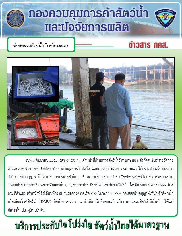 วันที่ 7 กันยายน 2562 เวลา 07.30 น. เจ้าหน้าที่ด่านตรวจสัตว์น้ำจังหวัดระนอง สังกัดศูนย์บริหารจัดการ ด่านตรวจสัตว์น้ำ เขต 3 (สงขลา) กองควบคุมการค้าสัตว์น้ำและปัจจัยการผลิต กรมประมง ได้ตรวจสอบเรือขนถ่าย สัตว์น้ำ ที่ขอนุญาตเข้าเทียบท่าจากประเทศเมียนมาร์ ณ ท่าเทียบเรือธนสาร (Choke point) โดยทำการตรวจสอบ เรือขนถ่าย เอกสารรับรองการจับสัตว์น้ำ (CC) ทำการประเมินชนิดและปริมาณสัตว์น้ำเบื้องต้น พบว่ามีความสอดคล้องตามที่สำแดง เจ้าหน้าที่จึงได้บันทึกรายงานผลการตรวจเรือ(PIR) ในระบบ e-PSM ก่อนออกใบอนุญาตให้นำเข้าสัตว์น้ำหรือผลิตภัณฑ์สัตว์น้ำ (DOF2) เพื่อทำการขนถ่าย ณ ท่าเทียบเรือที่จดทะเบียนกับกรมประมงสัตว์น้ำที่นำเข้า ได้แก่ ปลาทูสั้น ปลาทูลัง เป็นต้น