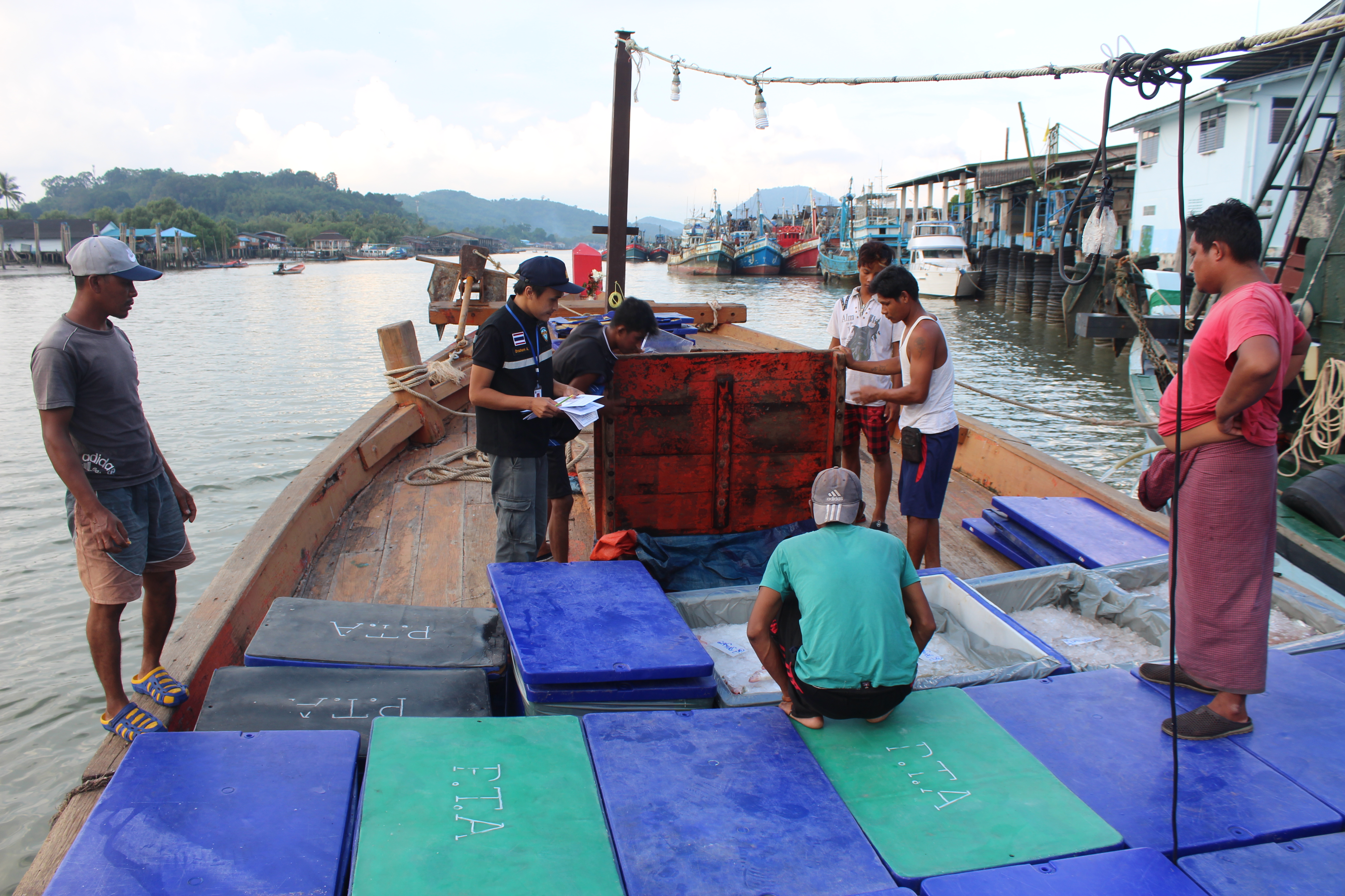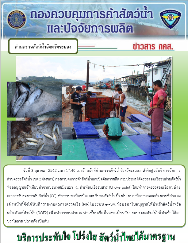 วันที่ 3 ตุลาคม 2562 เวลา 17.40 น. เจ้าหน้าที่ด่านตรวจสัตว์น้ำจังหวัดระนอง สังกัดศูนย์บริหารจัดการ ด่านตรวจสัตว์น้ำ เขต 3 (สงขลา) กองควบคุมการค้าสัตว์น้ำและปัจจัยการผลิต กรมประมง ได้ตรวจสอบเรือขนถ่ายสัตว์น้ำ ที่ขออนุญาตเข้าเทียบท่าจากประเทศเมียนมา ณ ท่าเทียบเรือธนสาร (Choke point) โดยทำการตรวจสอบเรือขนถ่าย เอกสารรับรองการจับสัตว์น้ำ (CC) ทำการประเมินชนิดและปริมาณสัตว์น้ำเบื้องต้น พบว่ามีความสอดคล้องตามที่สำแดง เจ้าหน้าที่จึงได้บันทึกรายงานผลการตรวจเรือ (PIR) ในระบบ e-PSM ก่อนออกใบอนุญาตให้นำเข้าสัตว์น้ำหรือ ผลิตภัณฑ์สัตว์น้ำ (DOF2) เพื่อทำการขนถ่าย ณ ท่าเทียบเรือที่จดทะเบียนกับกรมประมงสัตว์น้ำที่นำเข้า ได้แก่ ปลาโอลาย ปลาทูลัง เป็นต้น