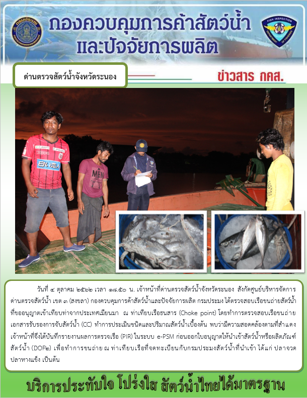 วันที่ 4 ตุลาคม 2562 เวลา 18.50 น. เจ้าหน้าที่ด่านตรวจสัตว์น้ำจังหวัดระนอง สังกัดศูนย์บริหารจัดการ ด่านตรวจสัตว์น้ำ เขต 3 (สงขลา) กองควบคุมการค้าสัตว์น้ำและปัจจัยการผลิต กรมประมง ได้ตรวจสอบเรือขนถ่ายสัตว์น้ำ ที่ขออนุญาตเข้าเทียบท่าจากประเทศเมียนมา ณ ท่าเทียบเรือธนสาร (Choke point) โดยทำการตรวจสอบเรือขนถ่าย เอกสารรับรองการจับสัตว์น้ำ (CC) ทำการประเมินชนิดและปริมาณสัตว์น้ำเบื้องต้น พบว่ามีความสอดคล้องตามที่สำแดง เจ้าหน้าที่จึงได้บันทึกรายงานผลการตรวจเรือ (PIR) ในระบบ e-PSM ก่อนออกใบอนุญาตให้นำเข้าสัตว์น้ำหรือผลิตภัณฑ์ สัตว์น้ำ (DOF2) เพื่อทำการขนถ่าย ณ ท่าเทียบเรือที่จดทะเบียนกับกรมประมงสัตว์น้ำที่นำเข้า ได้แก่ ปลาจวด ปลาหางแข็ง เป็นต้น