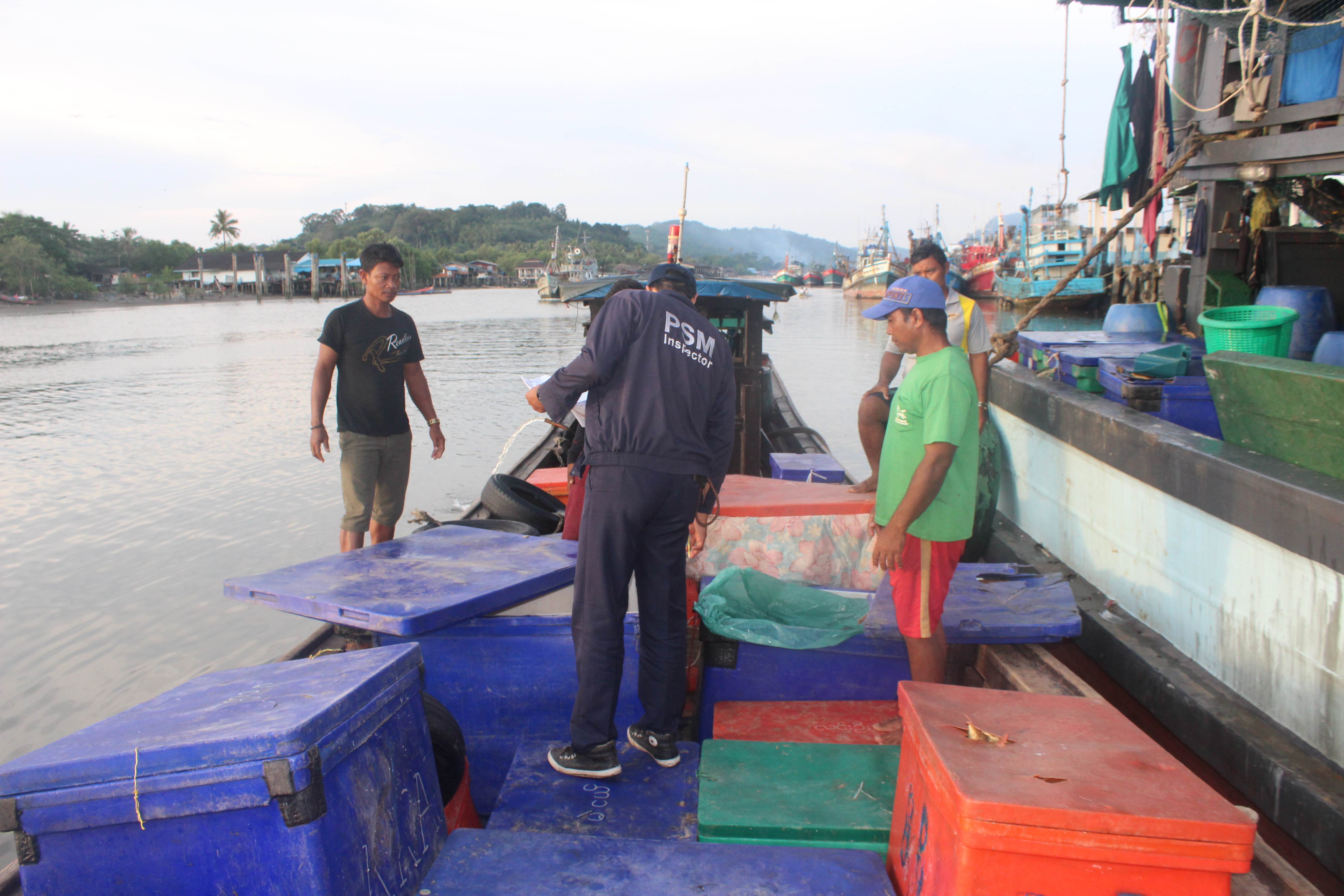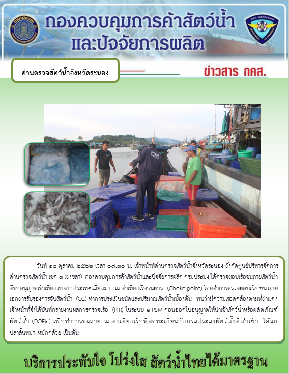 วันที่ 10 ตุลาคม 2562 เวลา 17.30 น. เจ้าหน้าที่ด่านตรวจสัตว์น้ำจังหวัดระนอง สังกัดศูนย์บริหารจัดการ ด่านตรวจสัตว์น้ำ เขต 3 (สงขลา) กองควบคุมการค้าสัตว์น้ำและปัจจัยการผลิต กรมประมง ได้ตรวจสอบเรือขนถ่ายสัตว์น้ำ ที่ขออนุญาตเข้าเทียบท่าจากประเทศเมียนมา ณ ท่าเทียบเรือธนสาร (Choke point) โดยทำการตรวจสอบเรือขนถ่ายเอกสารรับรองการจับสัตว์น้ำ (CC) ทำการประเมินชนิดและปริมาณสัตว์น้ำเบื้องต้น พบว่ามีความสอดคล้องตามที่สำแดง เจ้าหน้าที่จึงได้บันทึกรายงานผลการตรวจเรือ (PIR) ในระบบ e-PSM ก่อนออกใบอนุญาตให้นำเข้าสัตว์น้ำหรือผลิตภัณฑ์ สัตว์น้ำ (DOF2) เพื่อทำการขนถ่าย ณ ท่าเทียบเรือที่จดทะเบียนกับกรมประมงสัตว์น้ำที่นำเข้า ได้แก่ ปลาลิ้นหมา หมึกกล้วย เป็นต้น