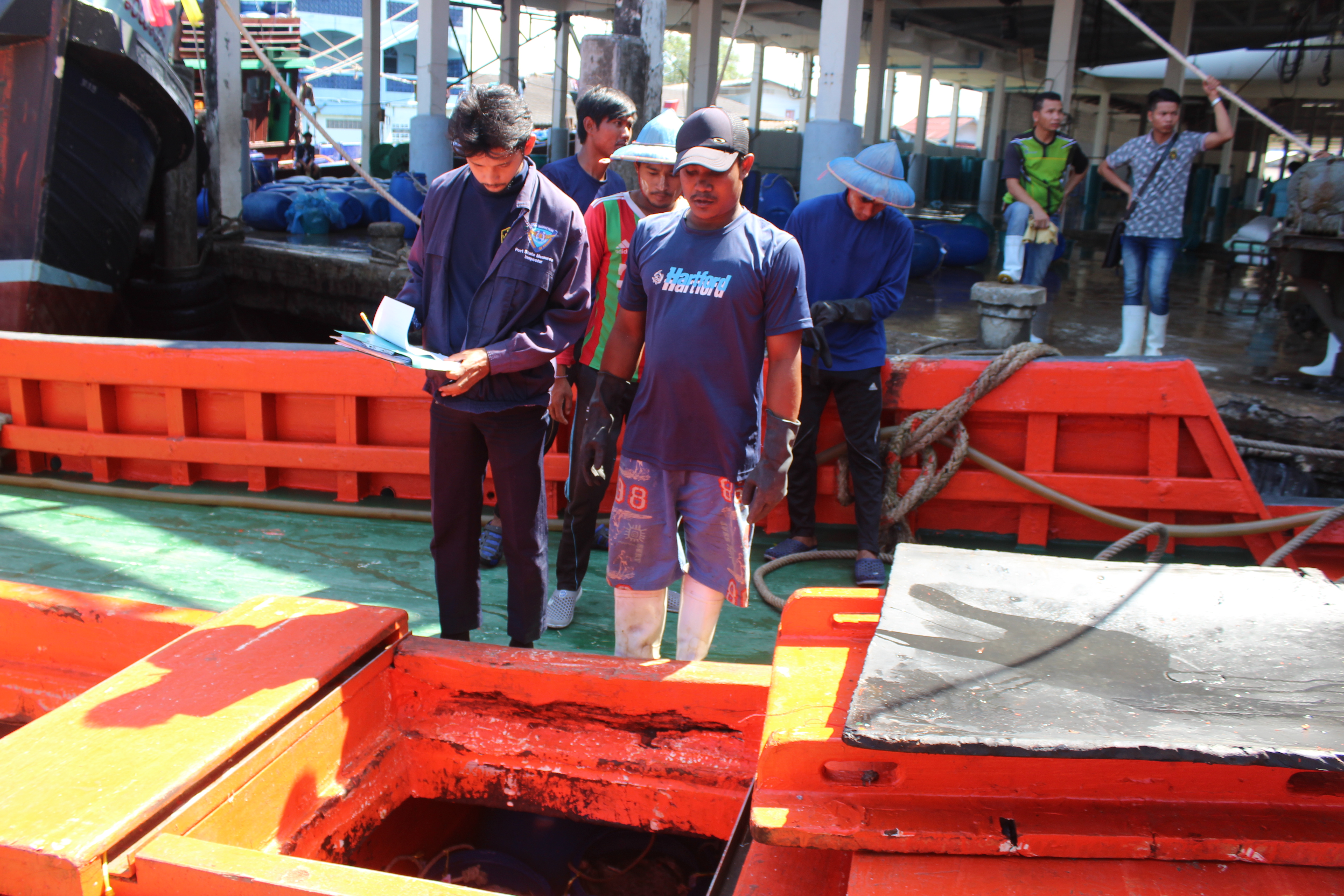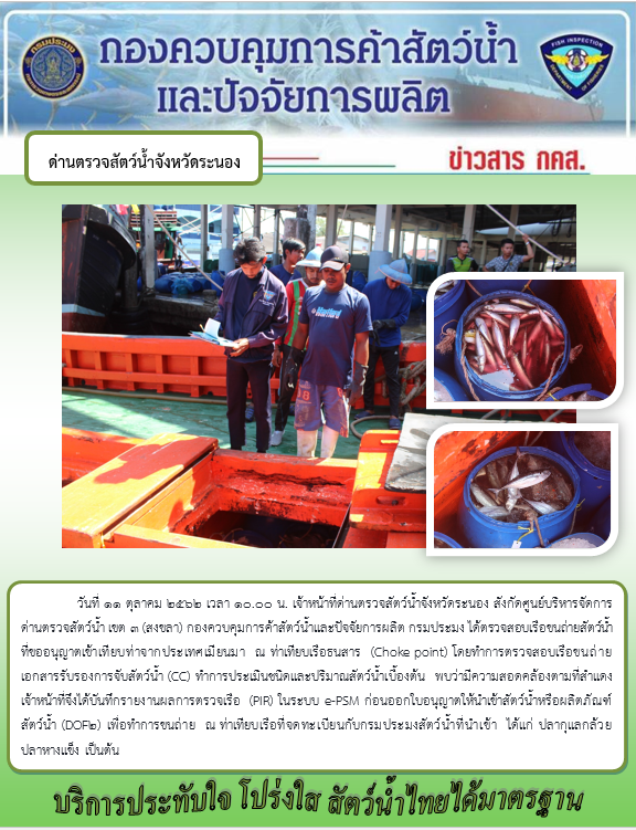 วันที่ 11 ตุลาคม 2562 เวลา 10.00 น. เจ้าหน้าที่ด่านตรวจสัตว์น้ำจังหวัดระนอง สังกัดศูนย์บริหารจัดการ ด่านตรวจสัตว์น้ำ เขต 3 (สงขลา) กองควบคุมการค้าสัตว์น้ำและปัจจัยการผลิต กรมประมง ได้ตรวจสอบเรือขนถ่ายสัตว์น้ำ ที่ขออนุญาตเข้าเทียบท่าจากประเทศเมียนมา ณ ท่าเทียบเรือธนสาร (Choke point) โดยทำการตรวจสอบเรือขนถ่ายเอกสารรับรองการจับสัตว์น้ำ (CC) ทำการประเมินชนิดและปริมาณสัตว์น้ำเบื้องต้น พบว่ามีความสอดคล้องตามที่สำแดง เจ้าหน้าที่จึงได้บันทึกรายงานผลการตรวจเรือ (PIR) ในระบบ e-PSM ก่อนออกใบอนุญาตให้นำเข้าสัตว์น้ำหรือผลิตภัณฑ์ สัตว์น้ำ (DOF2) เพื่อทำการขนถ่าย ณ ท่าเทียบเรือที่จดทะเบียนกับกรมประมงสัตว์น้ำที่นำเข้า ได้แก่ ปลากุแลกกล้วย ปลาหางแข็ง เป็นต้น