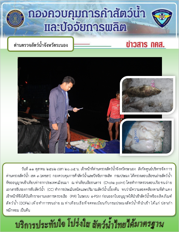 วันที่ 11 ตุลาคม 2562 เวลา 20.05 น. เจ้าหน้าที่ด่านตรวจสัตว์น้ำจังหวัดระนอง สังกัดศูนย์บริหารจัดการ ด่านตรวจสัตว์น้ำ เขต 3 (สงขลา) กองควบคุมการค้าสัตว์น้ำและปัจจัยการผลิต กรมประมง ได้ตรวจสอบเรือขนถ่ายสัตว์น้ำ ที่ขออนุญาตเข้าเทียบท่าจากประเทศเมียนมา ณ ท่าเทียบเรือธนสาร (Choke point) โดยทำการตรวจสอบเรือขนถ่าย เอกสารรับรองการจับสัตว์น้ำ (CC) ทำการประเมินชนิดและปริมาณสัตว์น้ำเบื้องต้น พบว่ามีความสอดคล้องตามที่สำแดง เจ้าหน้าที่จึงได้บันทึกรายงานผลการตรวจเรือ (PIR) ในระบบ e-PSM ก่อนออกใบอนุญาตให้นำเข้าสัตว์น้ำหรือผลิตภัณฑ์ สัตว์น้ำ (DOF2) เพื่อทำการขนถ่าย ณ ท่าเทียบเรือที่จดทะเบียนกับกรมประมงสัตว์น้ำที่นำเข้า ได้แก่ ปลาเก๋า