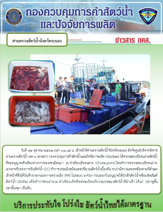 วันที่ 12 ตุลาคม 2562 เวลา 08.05 น. เจ้าหน้าที่ด่านตรวจสัตว์น้ำจังหวัดระนอง สังกัดศูนย์บริหารจัดการ ด่านตรวจสัตว์น้ำ เขต 3 (สงขลา) กองควบคุมการค้าสัตว์น้ำและปัจจัยการผลิต กรมประมง ได้ตรวจสอบเรือขนถ่ายสัตว์น้ำ ที่ขออนุญาตเข้าเทียบท่าจากประเทศเมียนมา ณ ท่าเทียบเรือธนสาร (Choke point) โดยทำการตรวจสอบเรือขนถ่าย เอกสารรับรองการจับสัตว์น้ำ (CC) ทำการประเมินชนิดและปริมาณสัตว์น้ำเบื้องต้น พบว่ามีความสอดคล้องตามที่สำแดง เจ้าหน้าที่จึงได้บันทึกรายงานผลการตรวจเรือ (PIR) ในระบบ e-PSM ก่อนออกใบอนุญาตให้นำเข้าสัตว์น้ำหรือผลิตภัณฑ์ สัตว์น้ำ (DOF2) เพื่อทำการขนถ่าย ณ ท่าเทียบเรือที่จดทะเบียนกับกรมประมงสัตว์น้ำที่นำเข้า ได้แก่ ปลาทูสั้น ปลาลิ้นหมา เป็นต้น